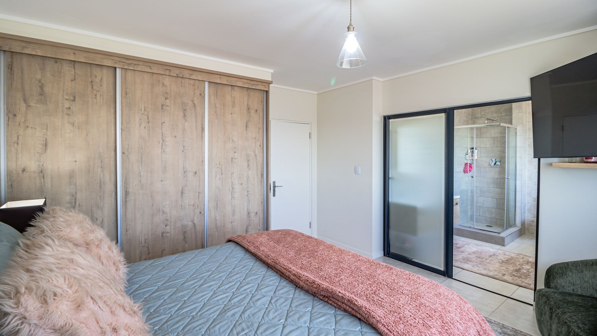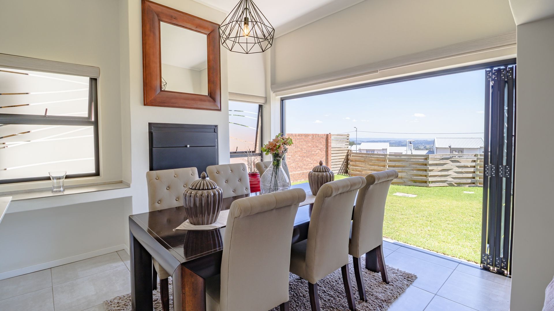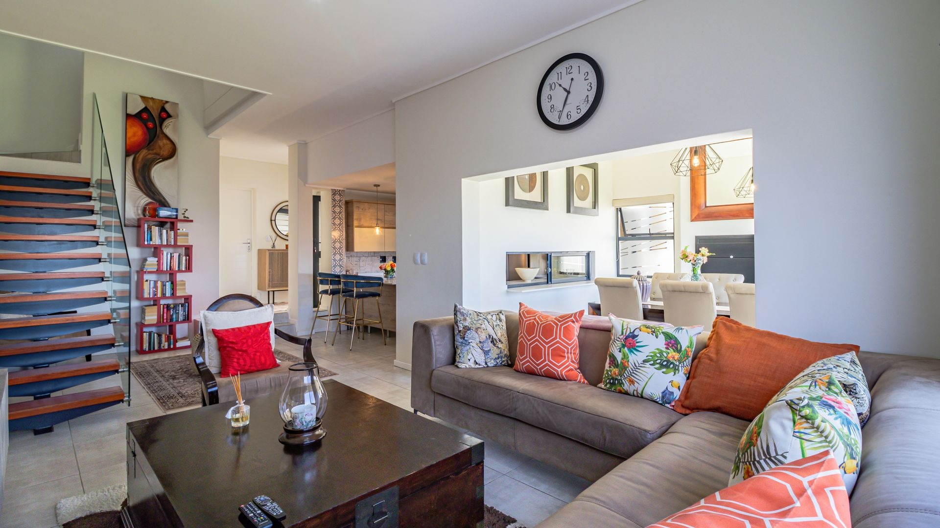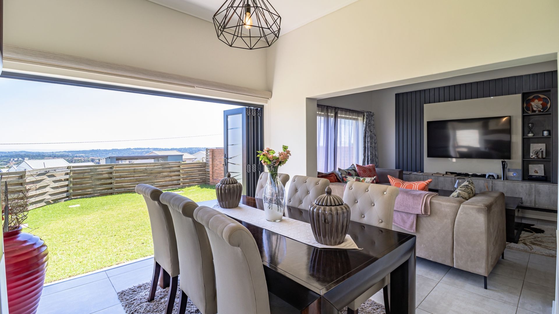 The lounge opens beautifully onto the entertainment patio, currently accommodating a dining table and designed for hours of relaxed entertaining. This inviting entertainment room includes a built-in braai and stackable doors that open onto a neat, private, and generously sized garden, creating effortless indoor-outdoor living.