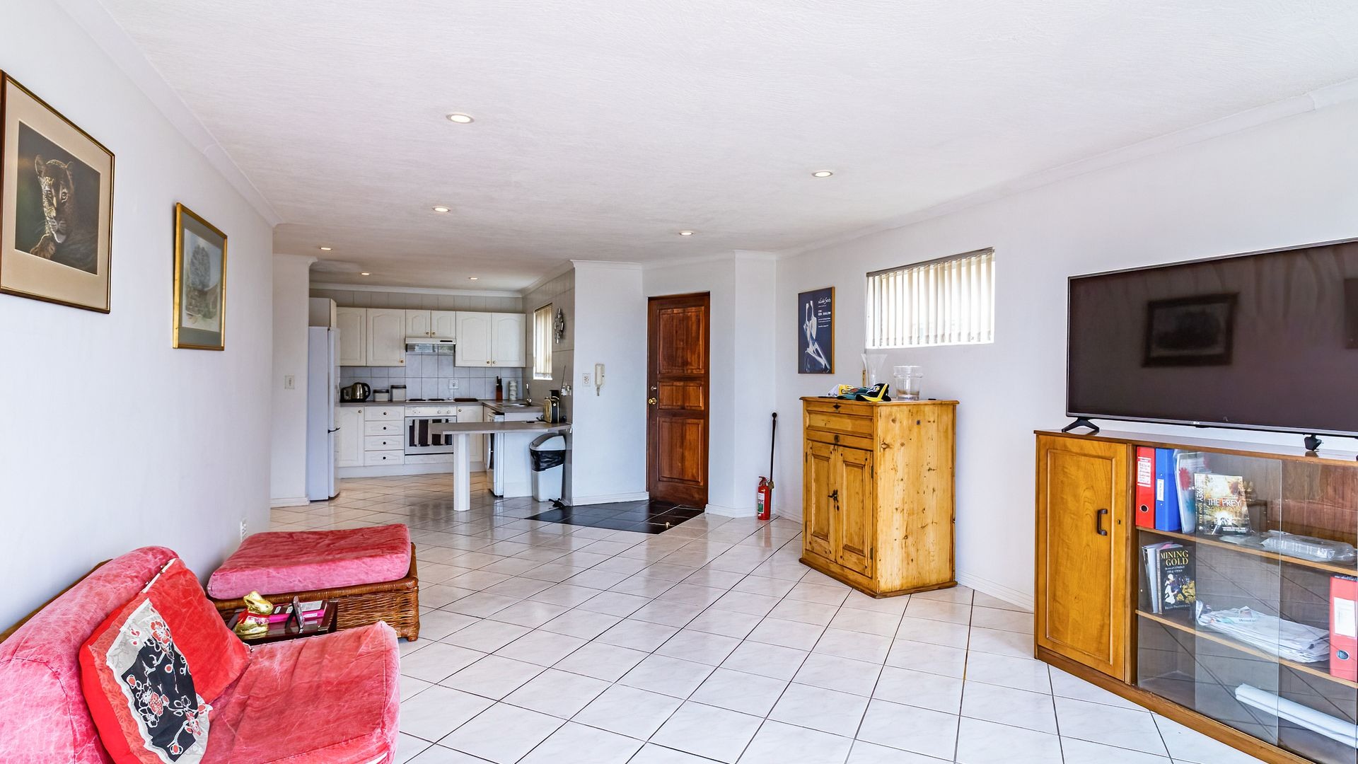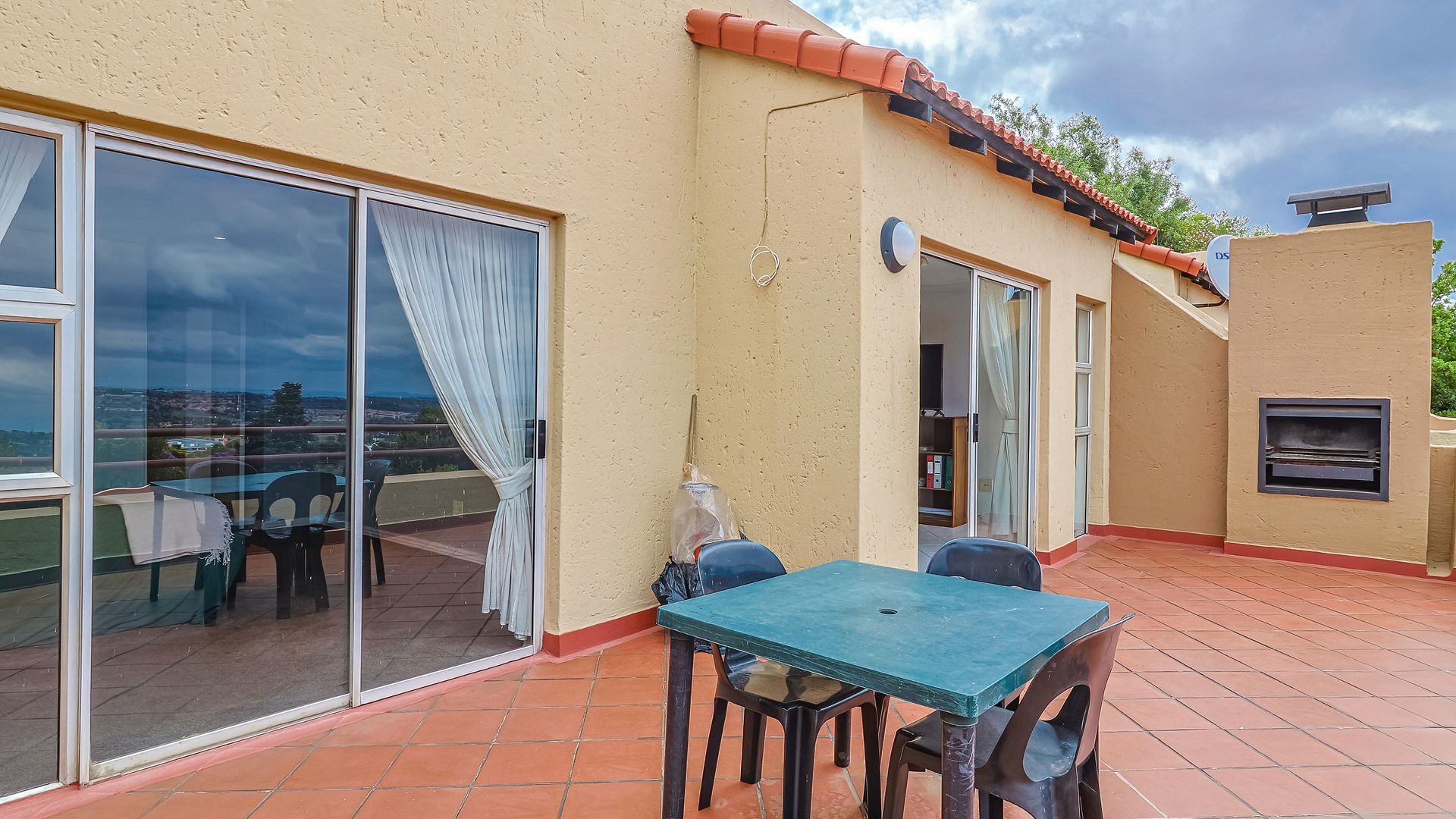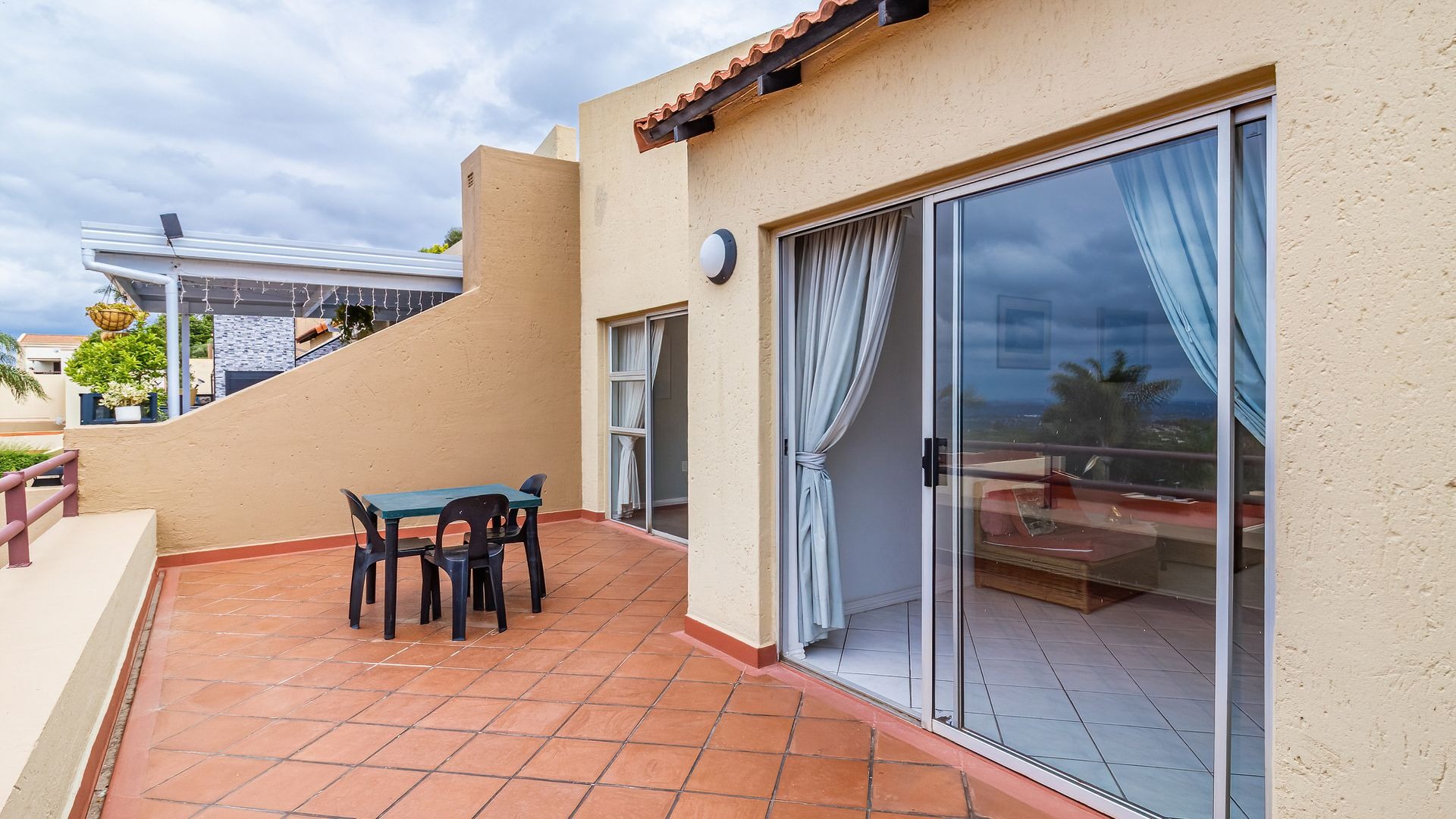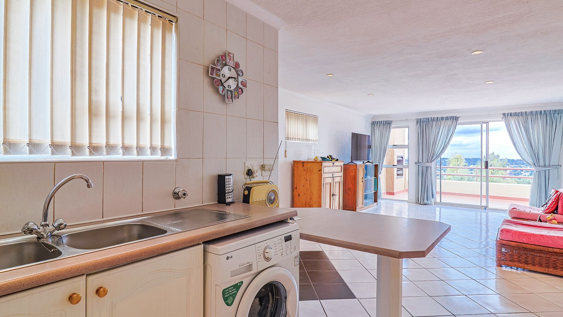 Enter through front door/security gate into a spacious tiled lounge and dining room, with sliders onto lovely balcony, built-in braai with magnificent view. Open-plan kitchen with breakfast bar, granite tops, under counter oven, solid hob, extractor, broom cupboard, space for washing machine and double sink. Lots of BIC. Large main bedroom, carpeted 4 Bic with slider to same tiled balcony, MES with shower, loo and vanity, 2nd bedroom carpeted 3 BIC , 2nd bathroom has bath loo and basin. 2 garages, Visitors parking. 24hr guard. Not pet friendly.