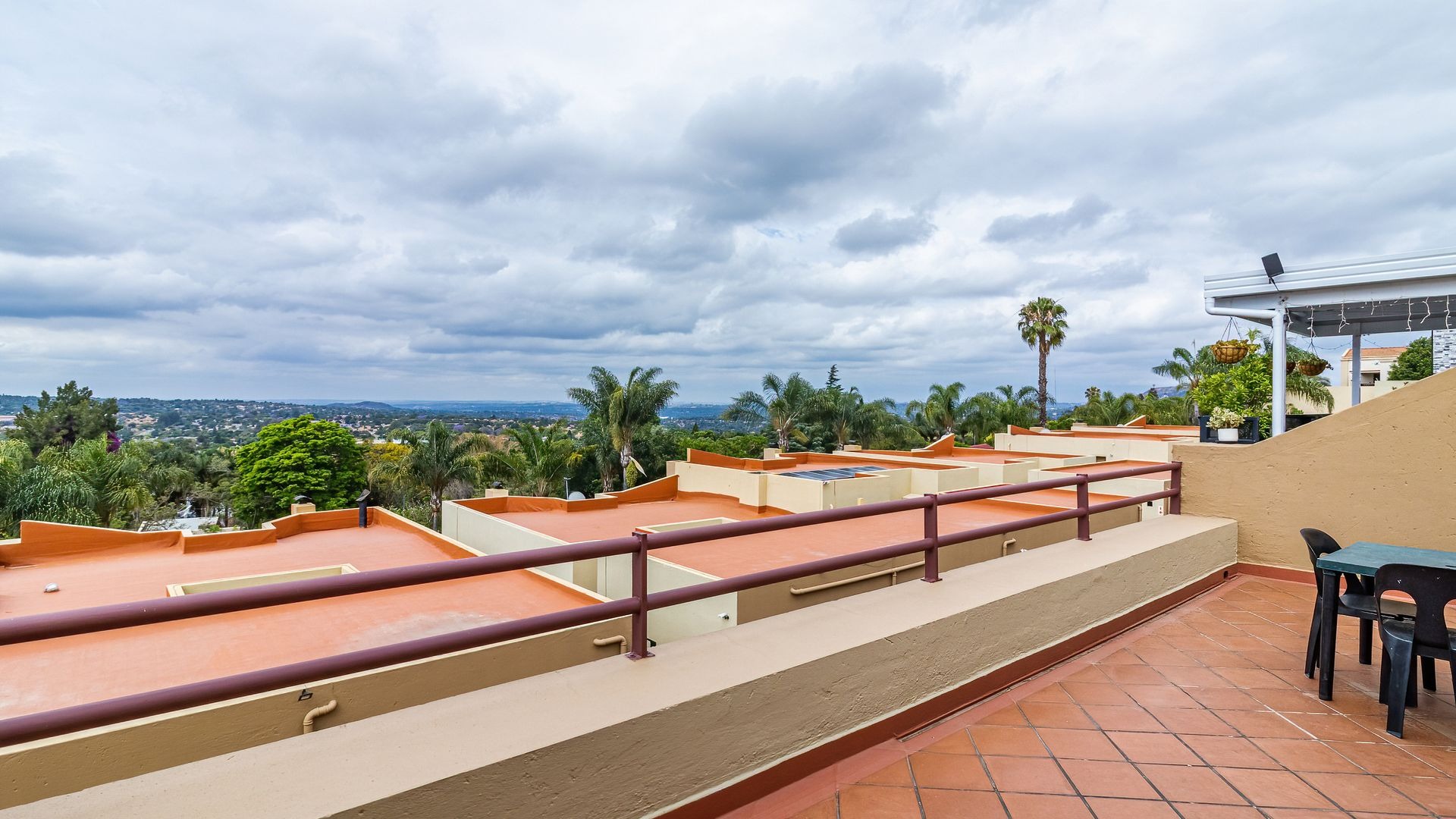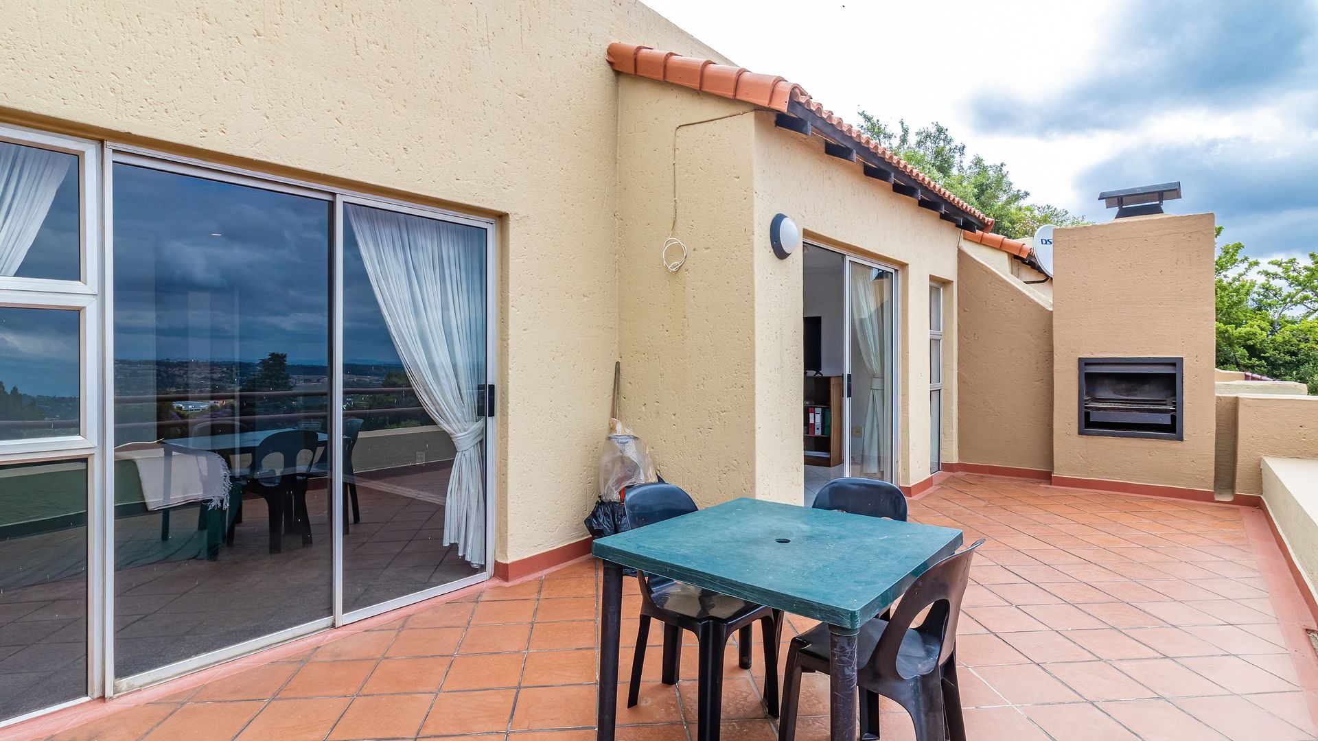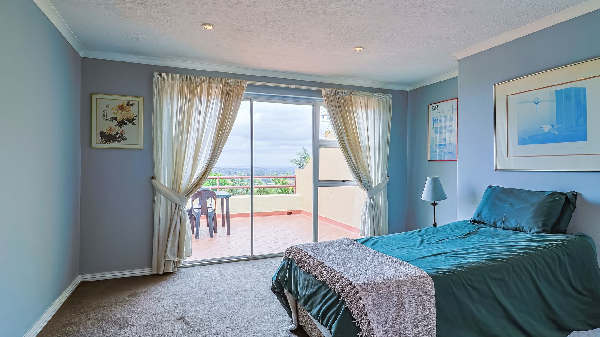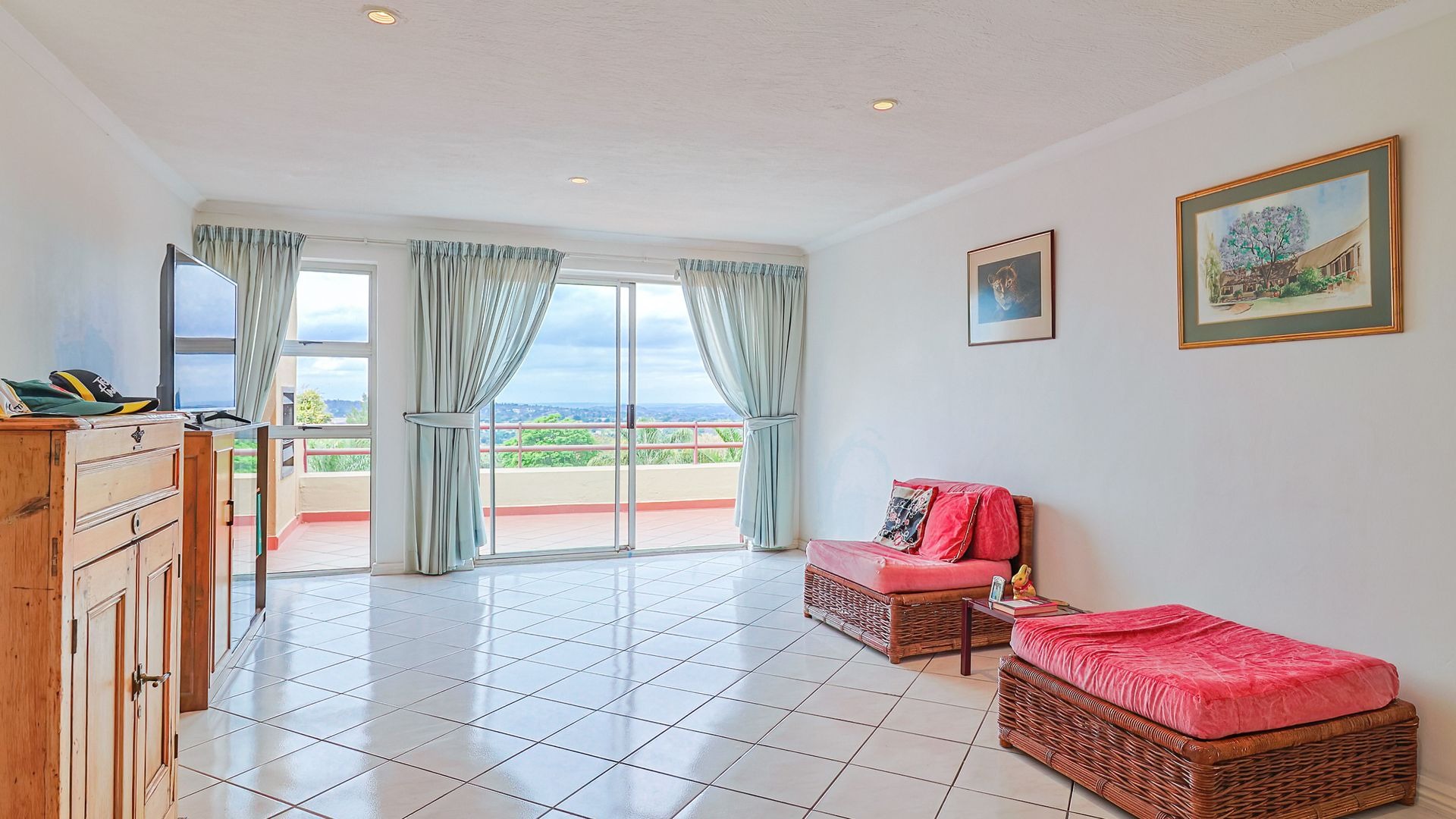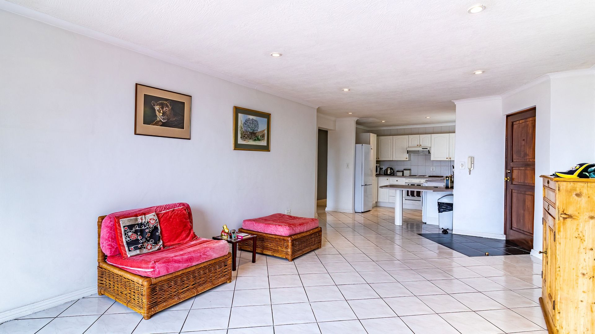 Enter through front door/security gate into a spacious tiled lounge and dining room, with sliders onto lovely balcony, built-in braai with magnificent view. Open-plan kitchen with breakfast bar, granite tops, under counter oven, solid hob, extractor, broom cupboard, space for washing machine and double sink. Lots of BIC. Large main bedroom, carpeted 4 Bic with slider to same tiled balcony, MES with shower, loo and vanity, 2nd bedroom carpeted 3 BIC , 2nd bathroom has bath loo and basin. 2 garages, Visitors parking. 24hr guard. Not pet friendly.