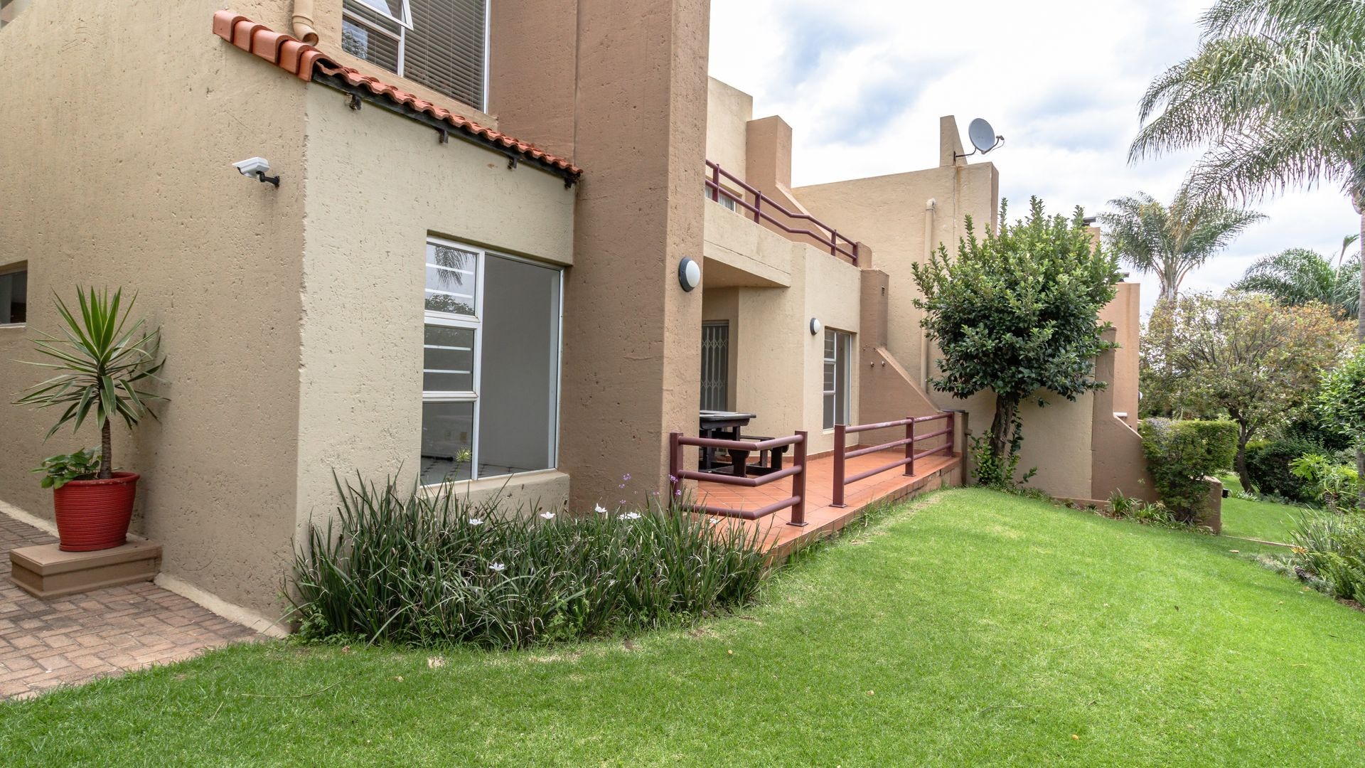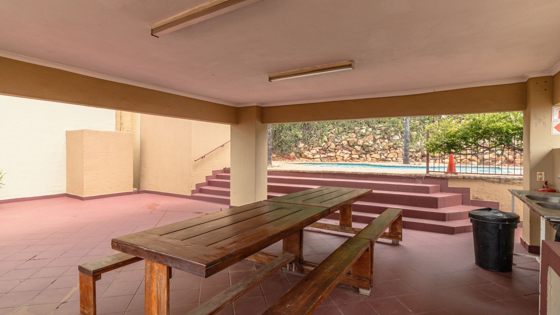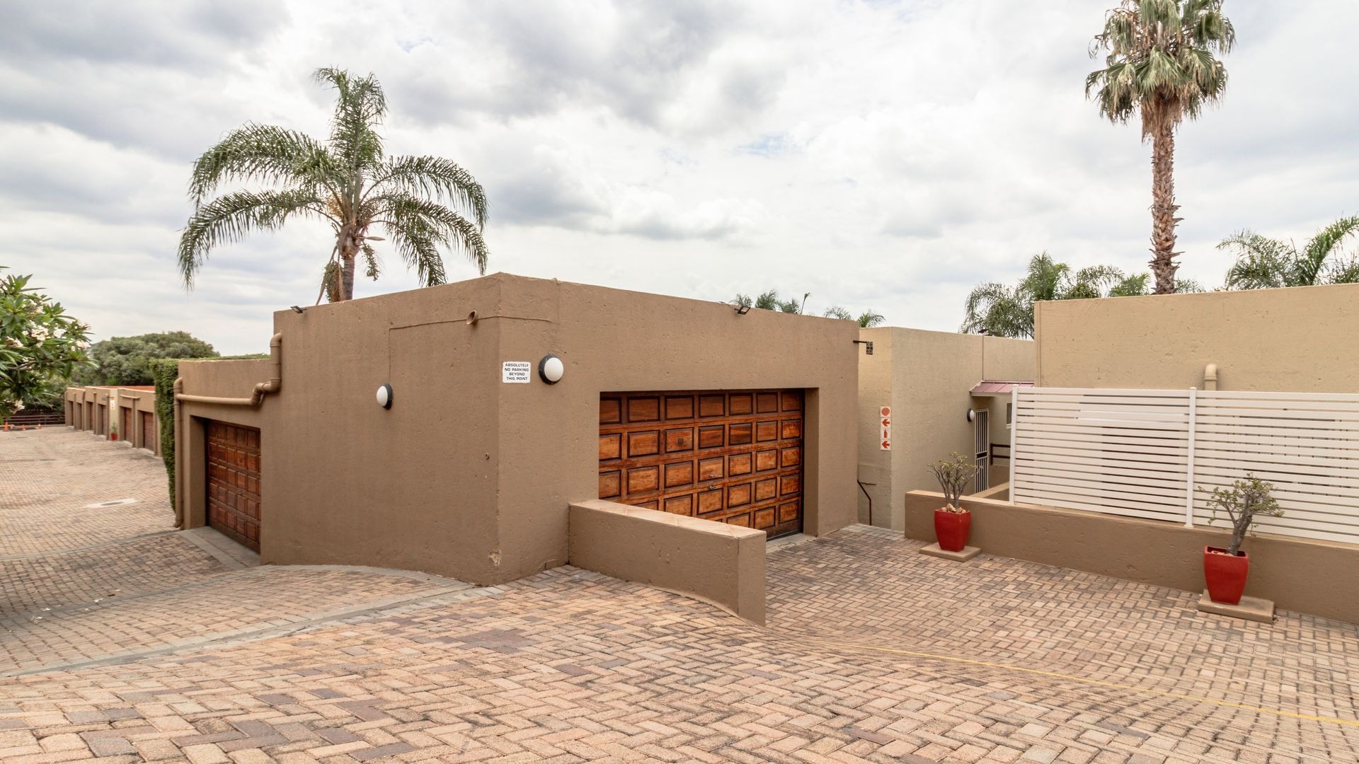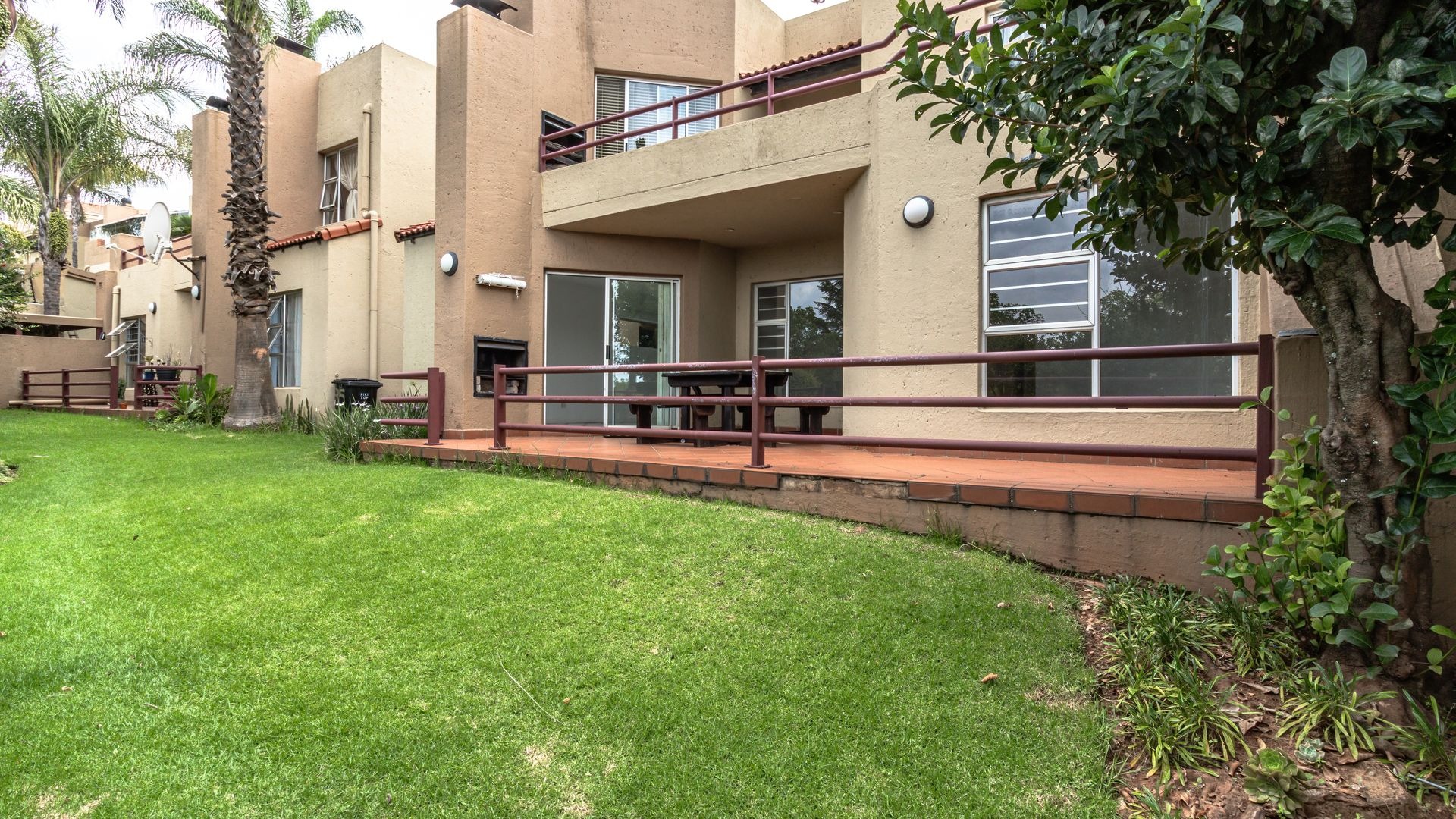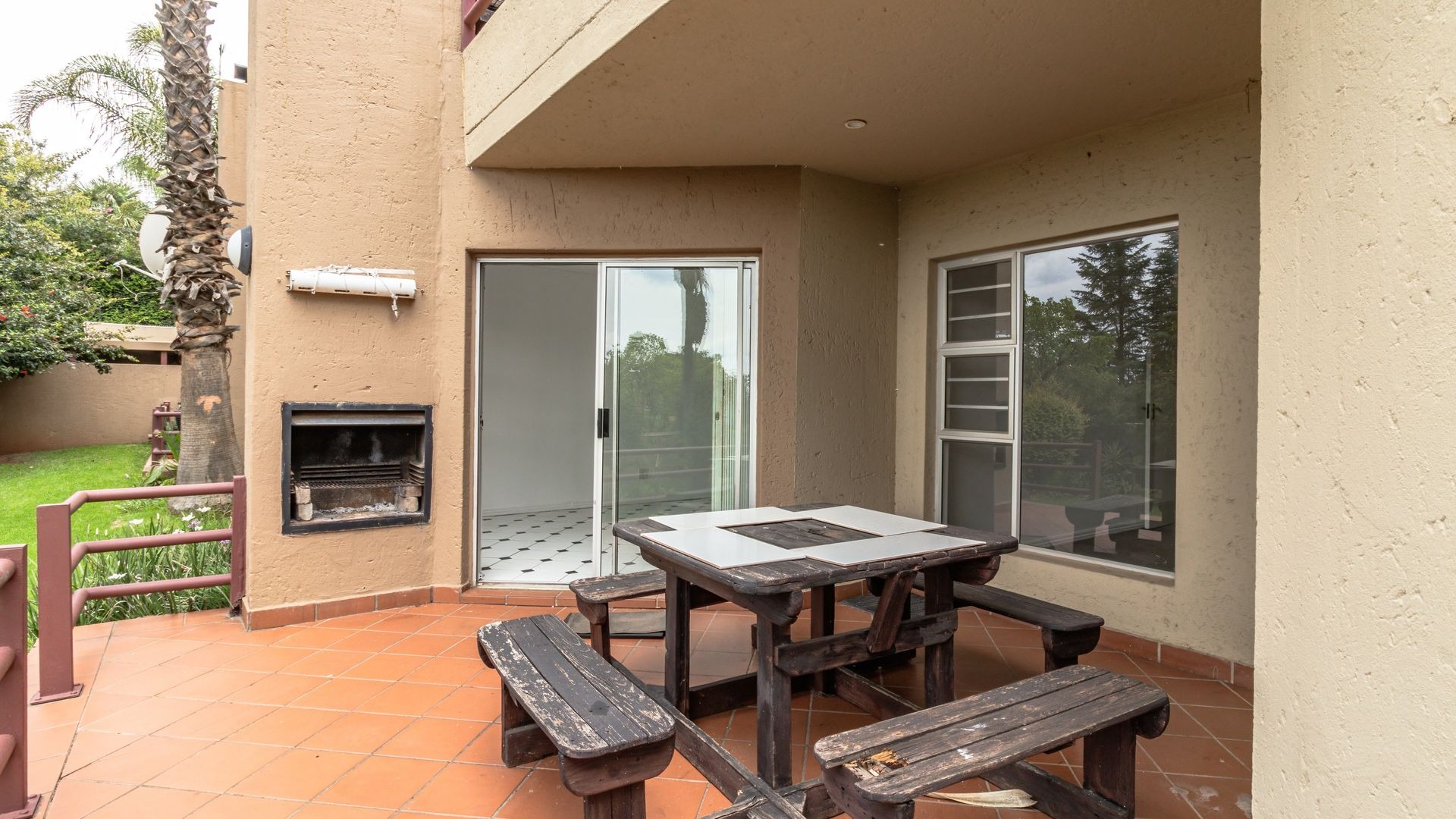 Front entrance with security gate leading to spacious, tiled lounge and dining area with slider/security gate to patio with built-in braai and communal garden. Open-plan kitchen, granite tops, space for double door fridge, space for washing machine and dishwasher. Under counter oven and solid hob, extractor, breakfast bar, double sink. Lots of cupboards. Main bedroom (carpeted) (walk-in dressing room) and sliders onto patio, MES has Jacuzzi bath, (not working), loo and double basin, 2nd bedroom (carpeted) (3 BIC). 3rd Bedroom, (Carpeted) (3BIC) Bathroom has a shower, vanity and toilet. Linen cupboard. Double garage (auto). Facilities include complex pool and lapa. 24 hr guard at entrance.