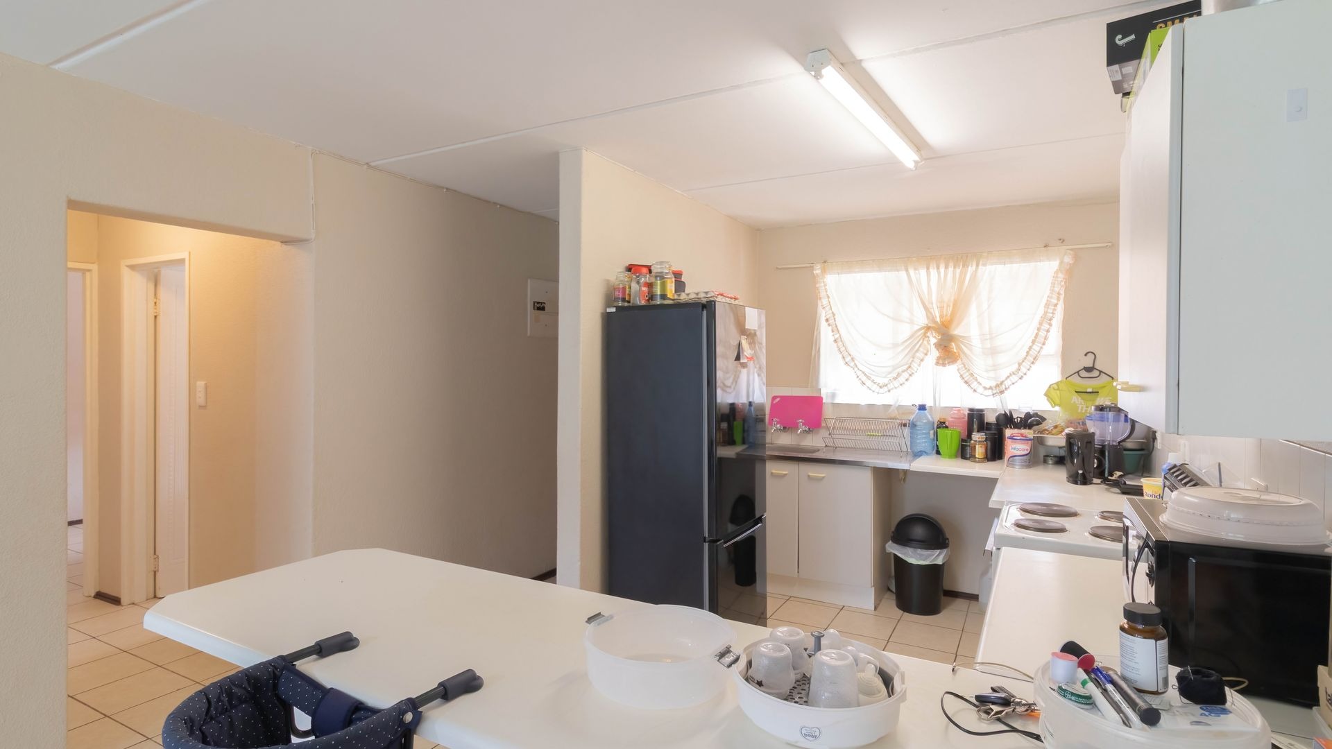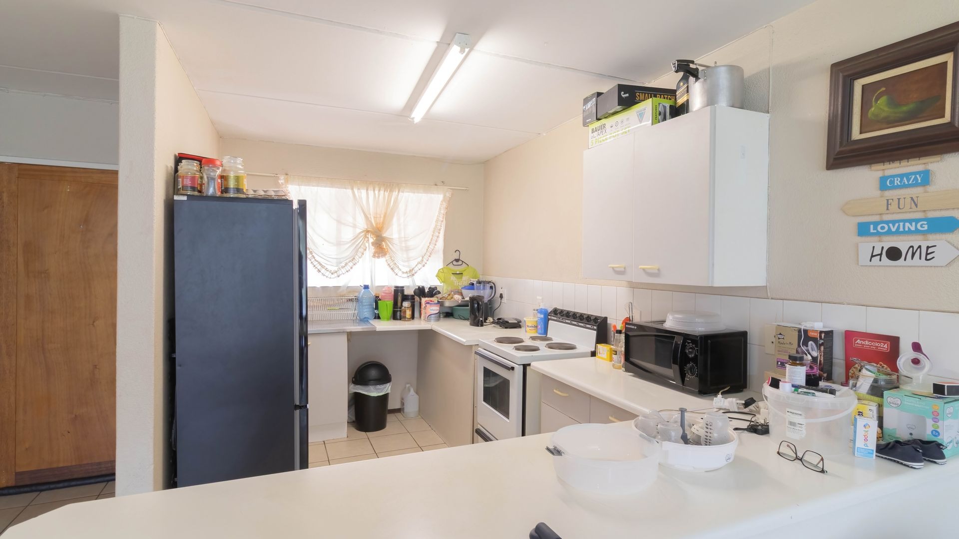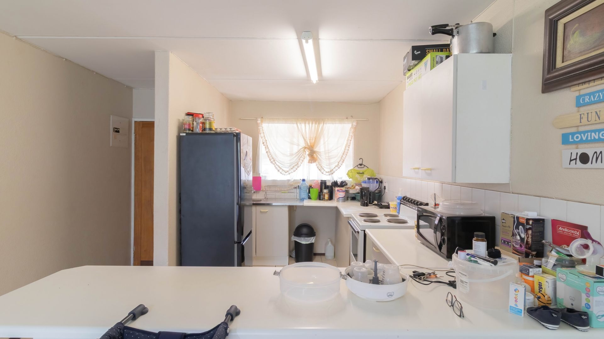 The kitchen is a comfortable size with direct sun coming through the kitchen window