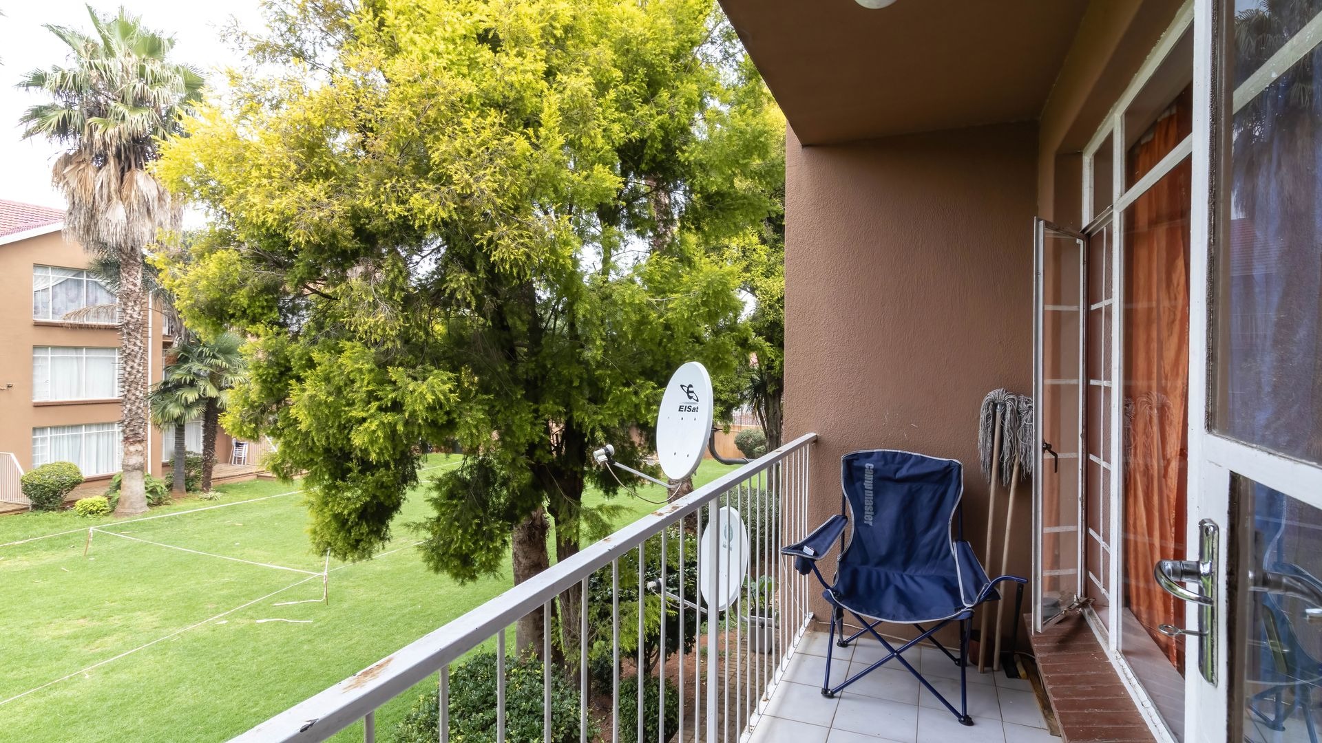 The patio looks onto the lovely communal gardens and two pools