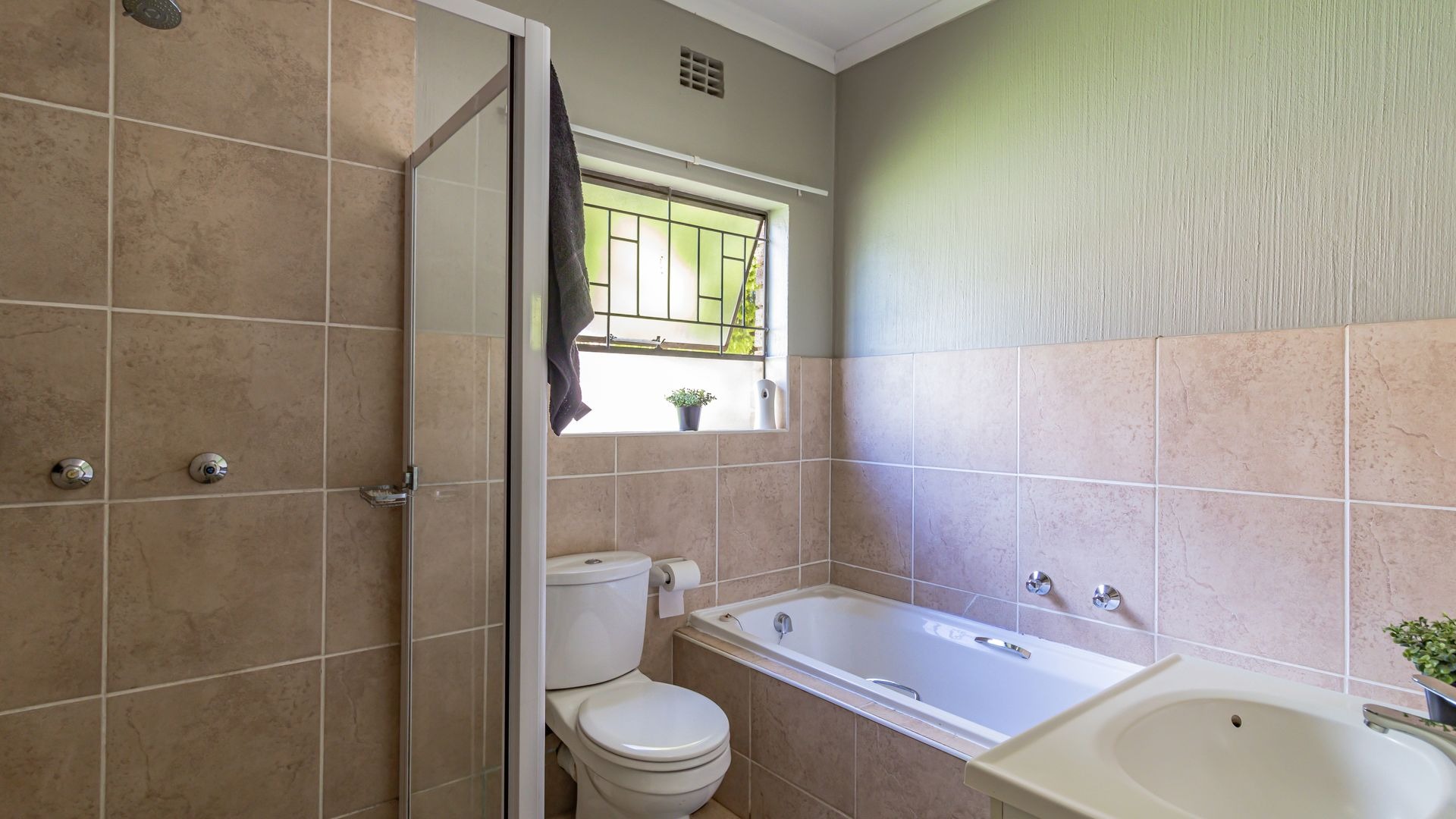 - Full bathroom with bath, shower, basin, toilet, and infrared heater