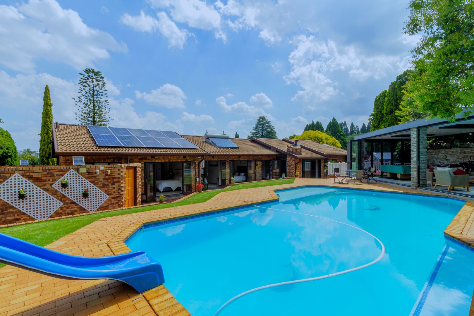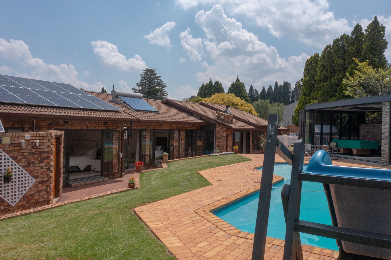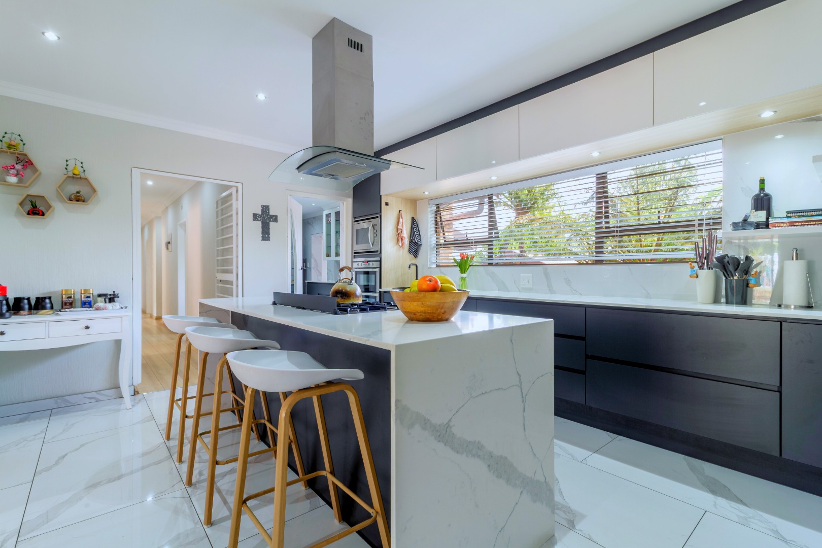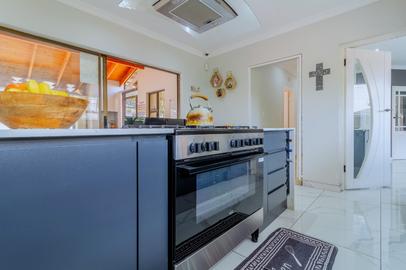 The home features a beautifully designed gourmet kitchen with double ovens, pantry, spice storage and a separate scullery with space for both top and front loader appliances. Energy efficiency is enhanced with solar panels and a dedicated solar geyser system.