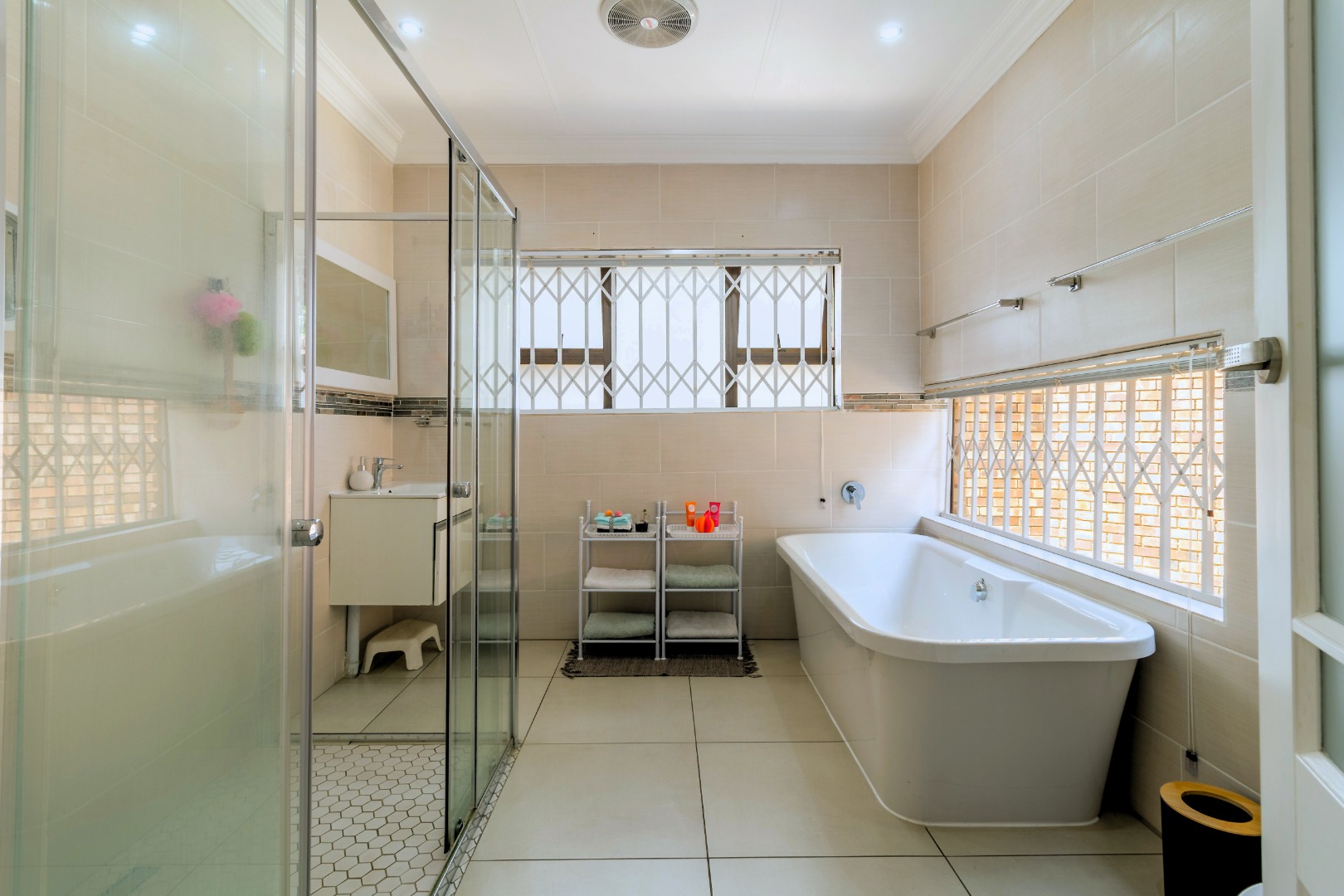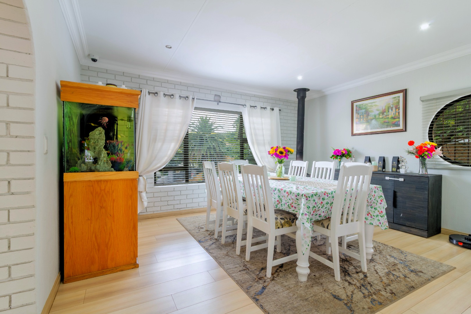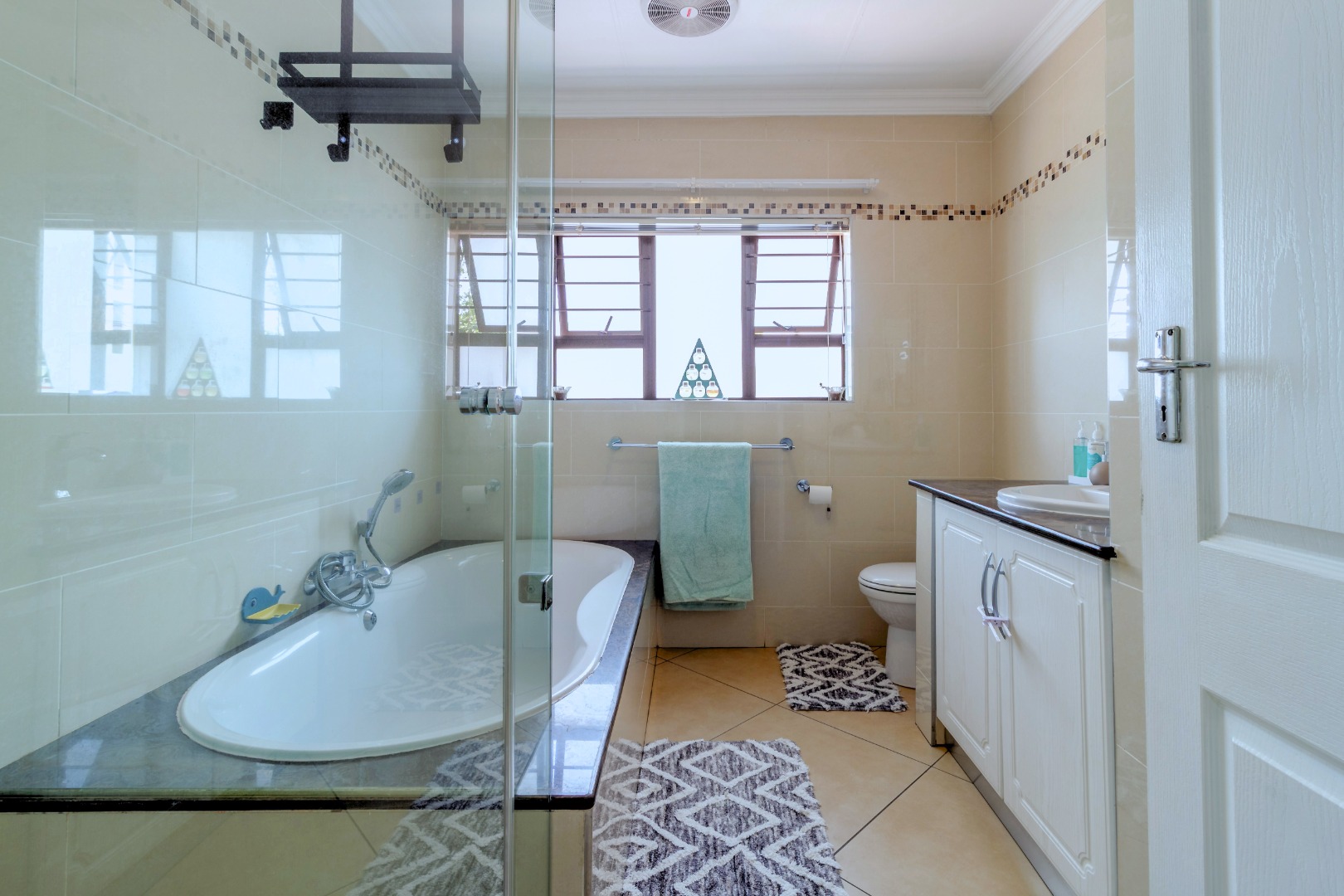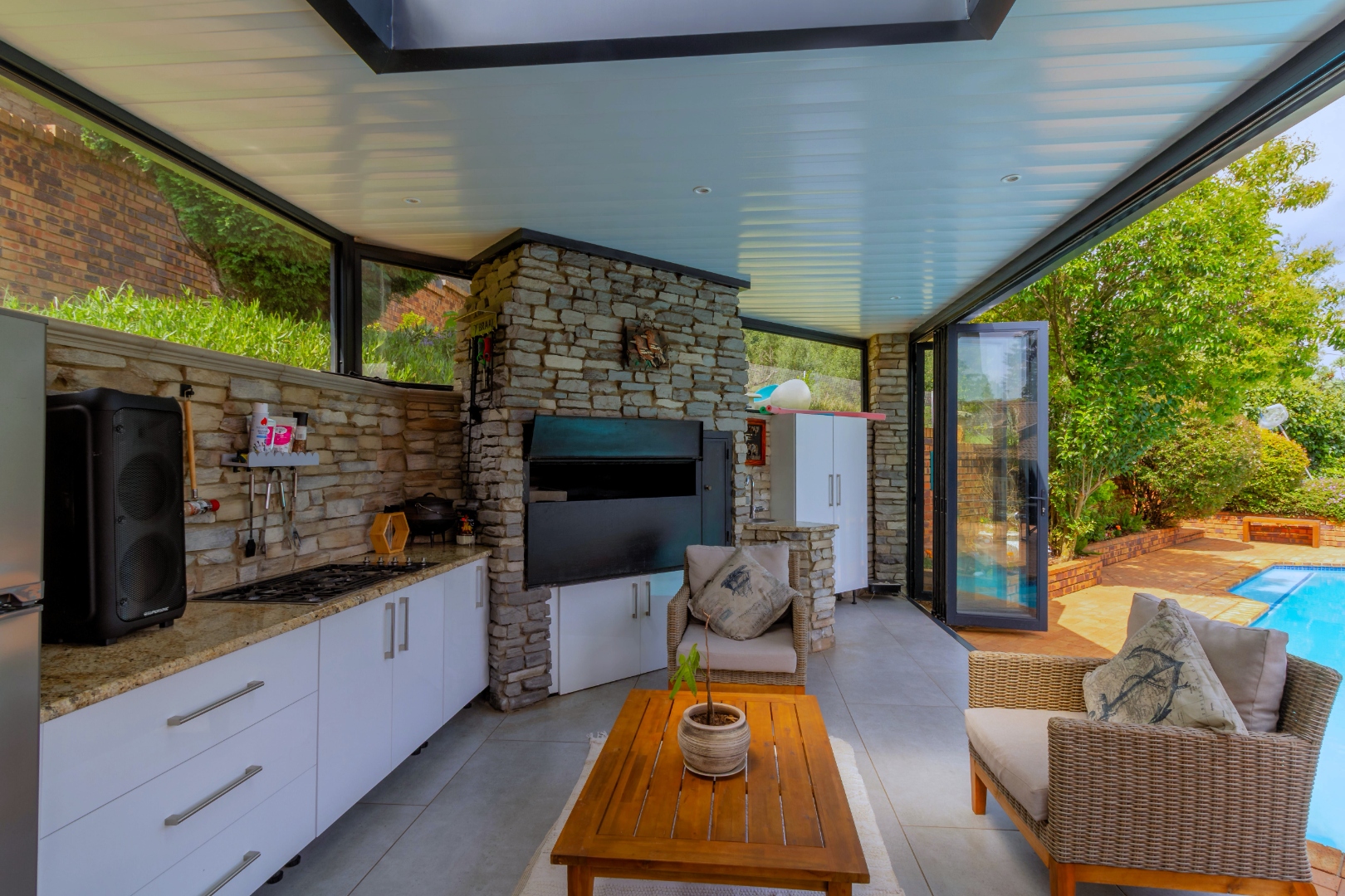 The home features a beautifully designed gourmet kitchen with double ovens, pantry, spice storage and a separate scullery with space for both top and front loader appliances. Energy efficiency is enhanced with solar panels and a dedicated solar geyser system.
