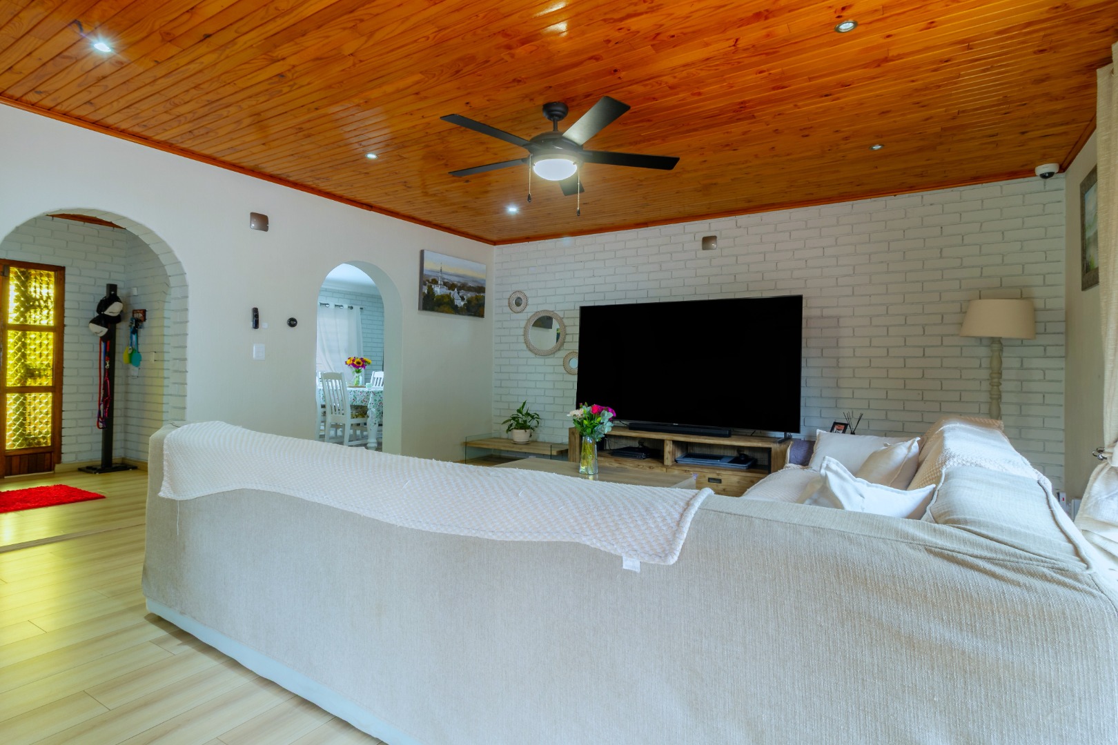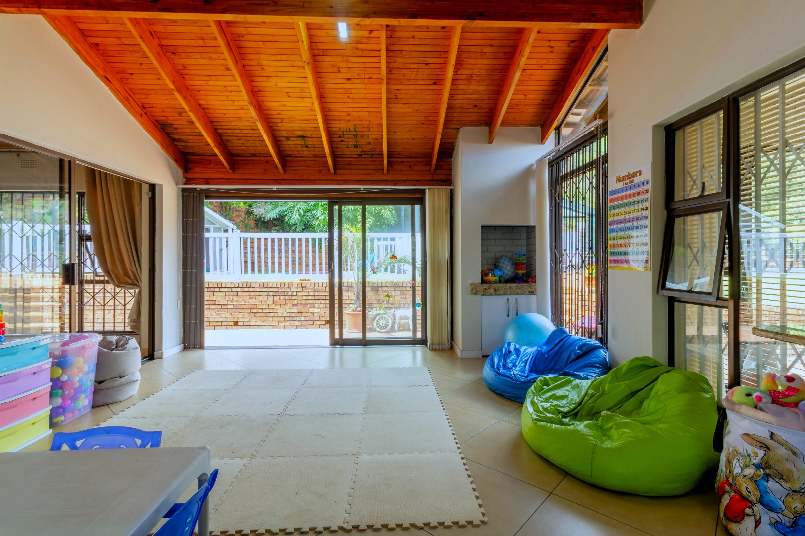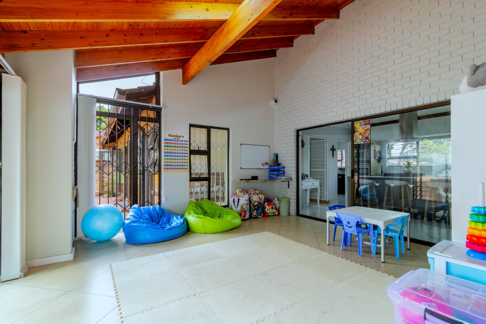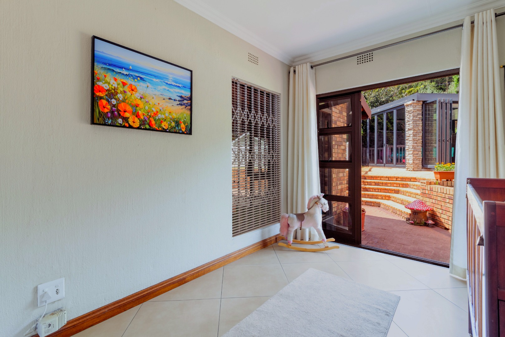 Designed for effortless entertaining, the property boasts an outdoor braai area and a large recently refurbished saltwater swimming pool, all set within a tranquil landscaped garden. Families will love the outdoor play features, including a built-in trampoline and charming dollhouse.