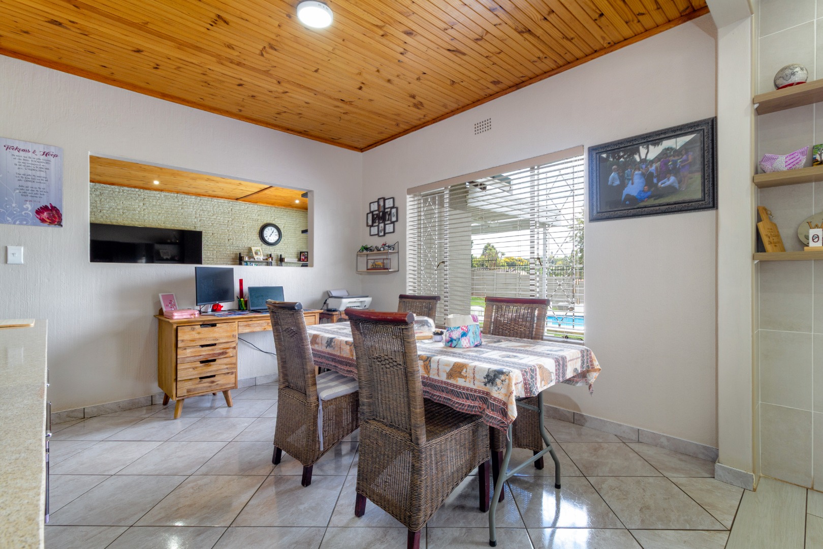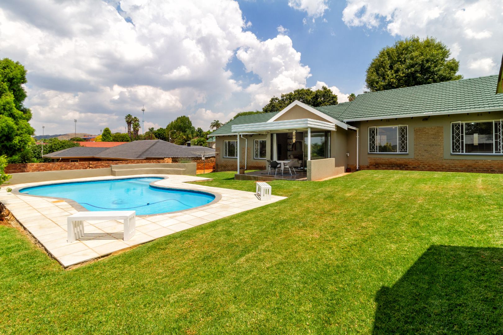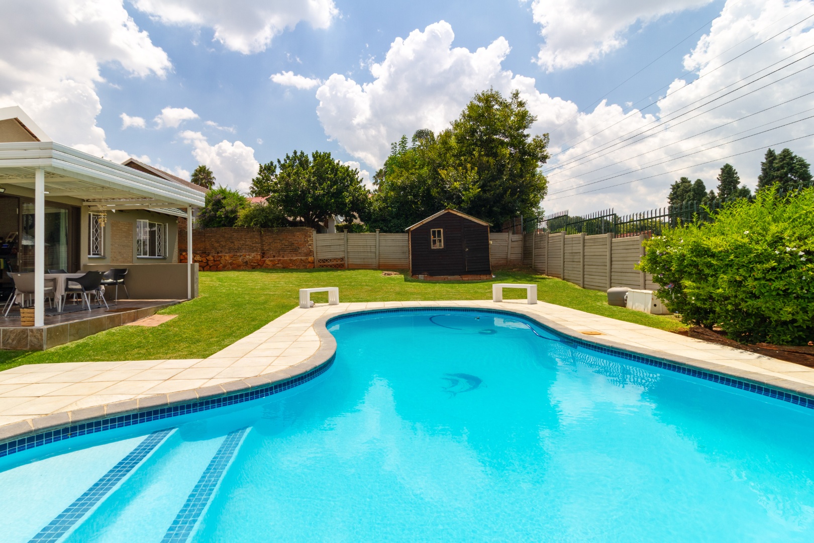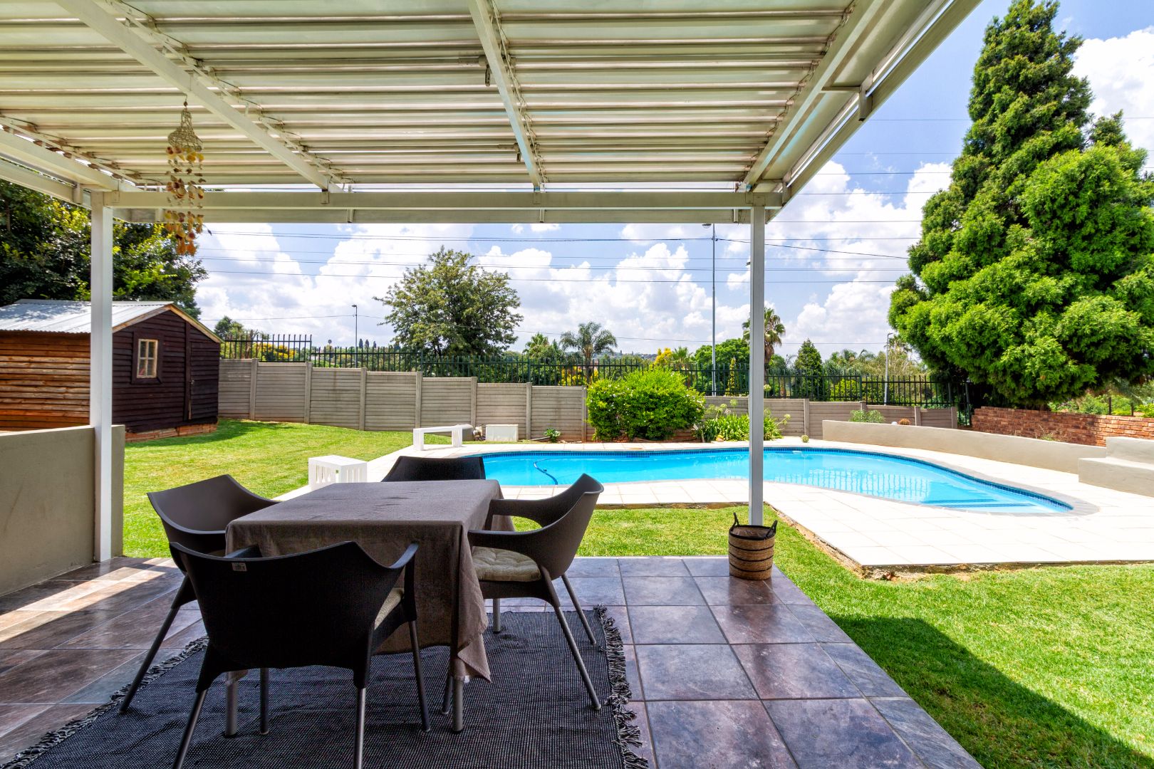 Enjoy outdoor living with a built-in braai and entertainment area overlooking a sparkling blue swimming pool. Additional features include staff quarters, a Wendy hut, and two water tanks for backup water. Solar is installed on a rental basis.