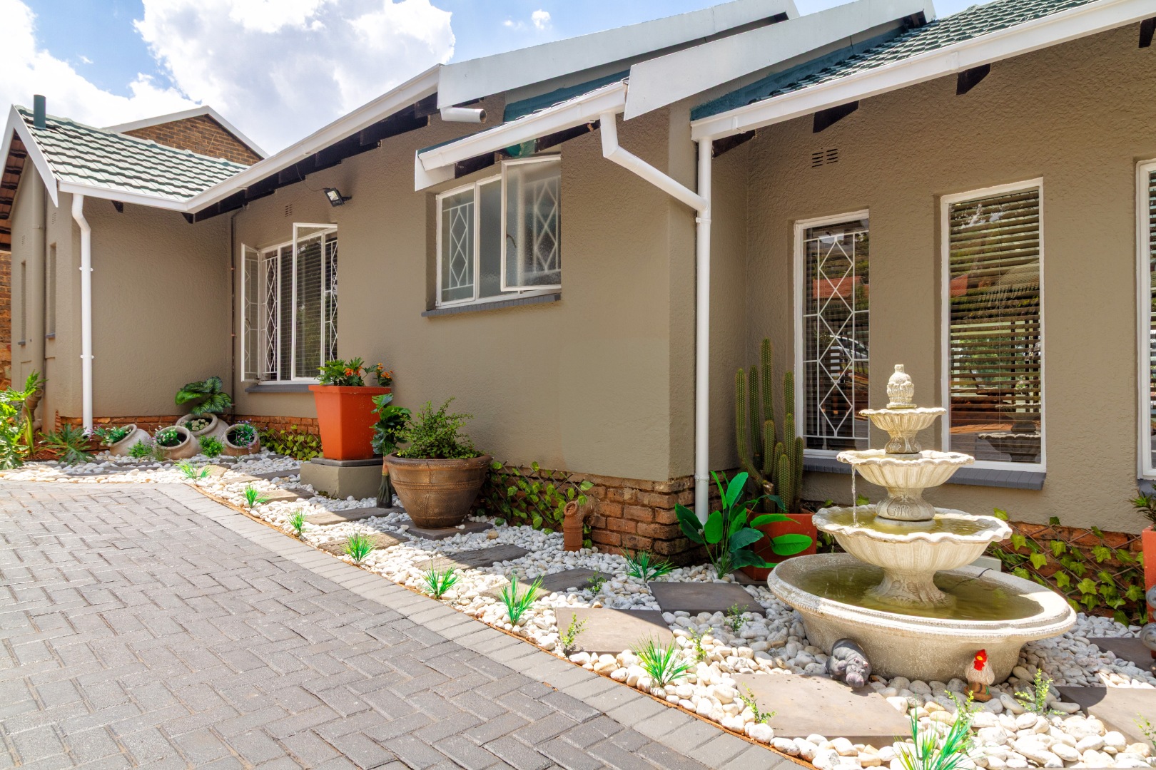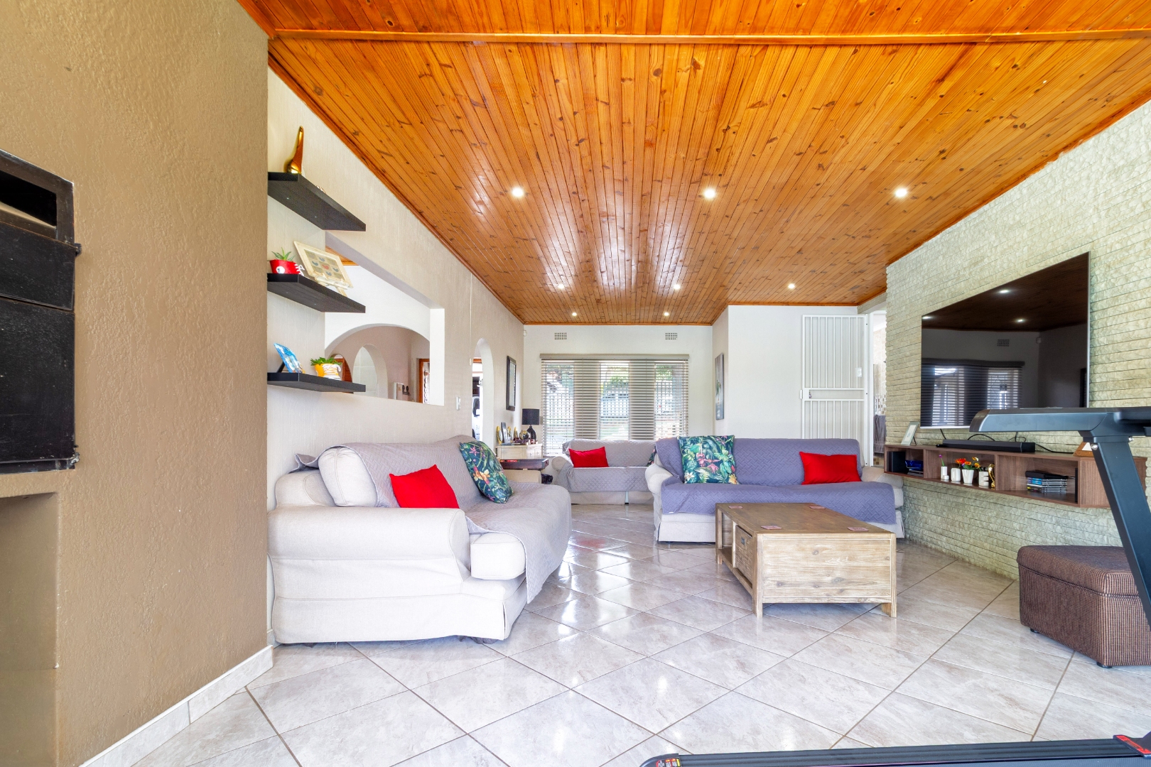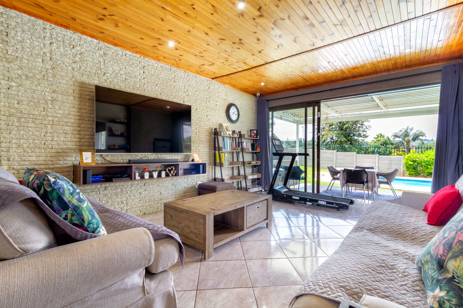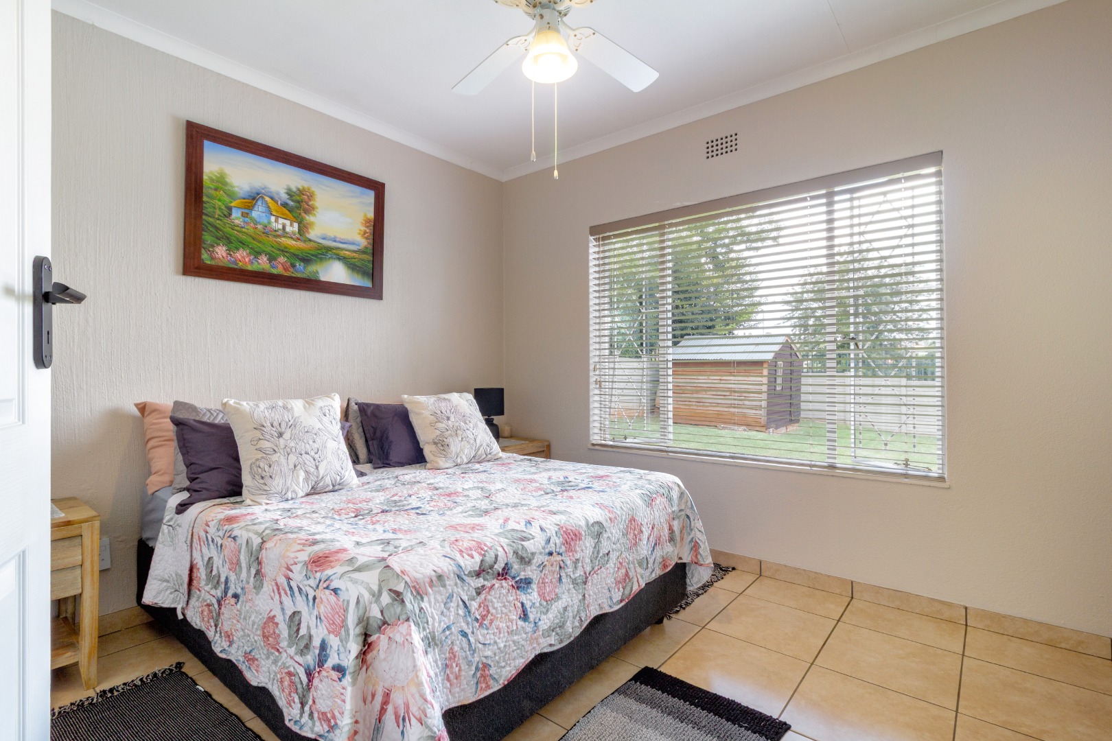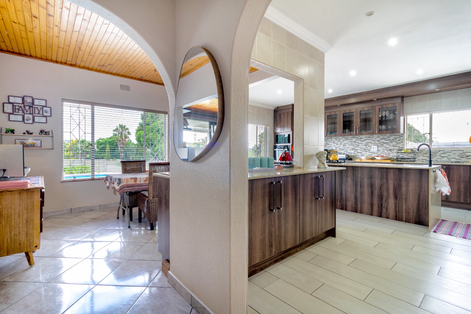 Enjoy outdoor living with a built-in braai and entertainment area overlooking a sparkling blue swimming pool. Additional features include staff quarters, a Wendy hut, and two water tanks for backup water. Solar is installed on a rental basis.