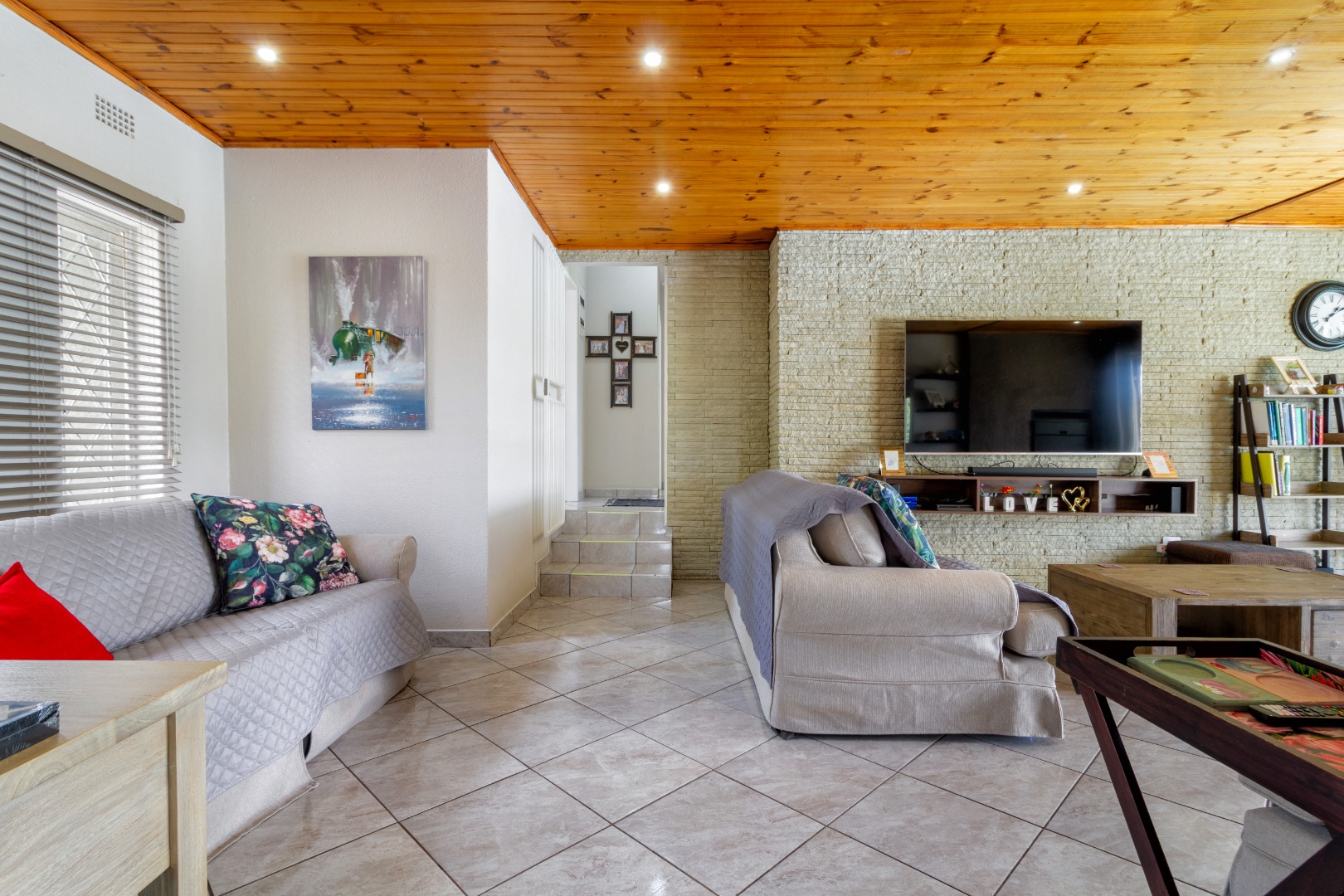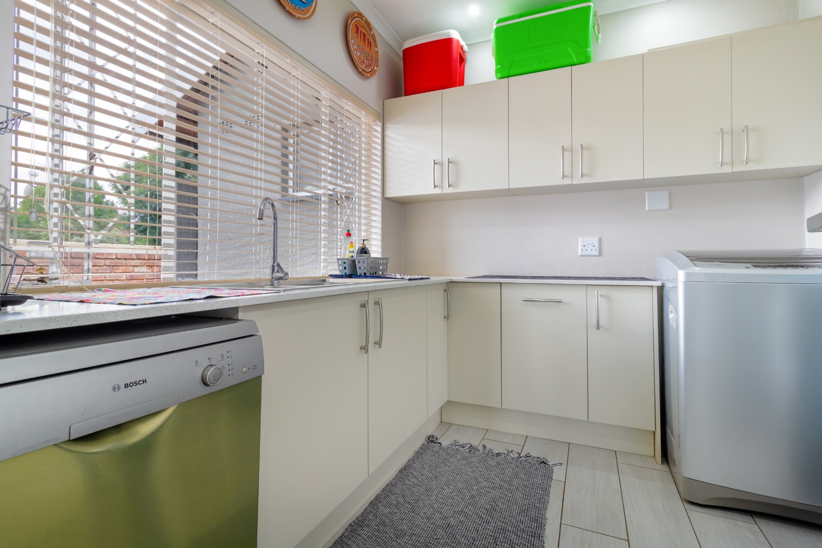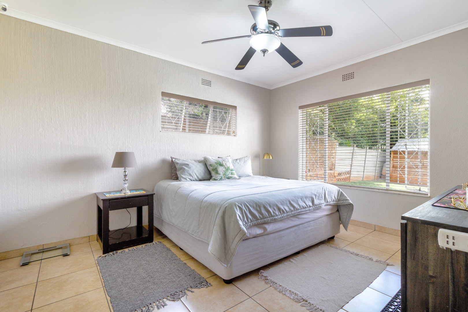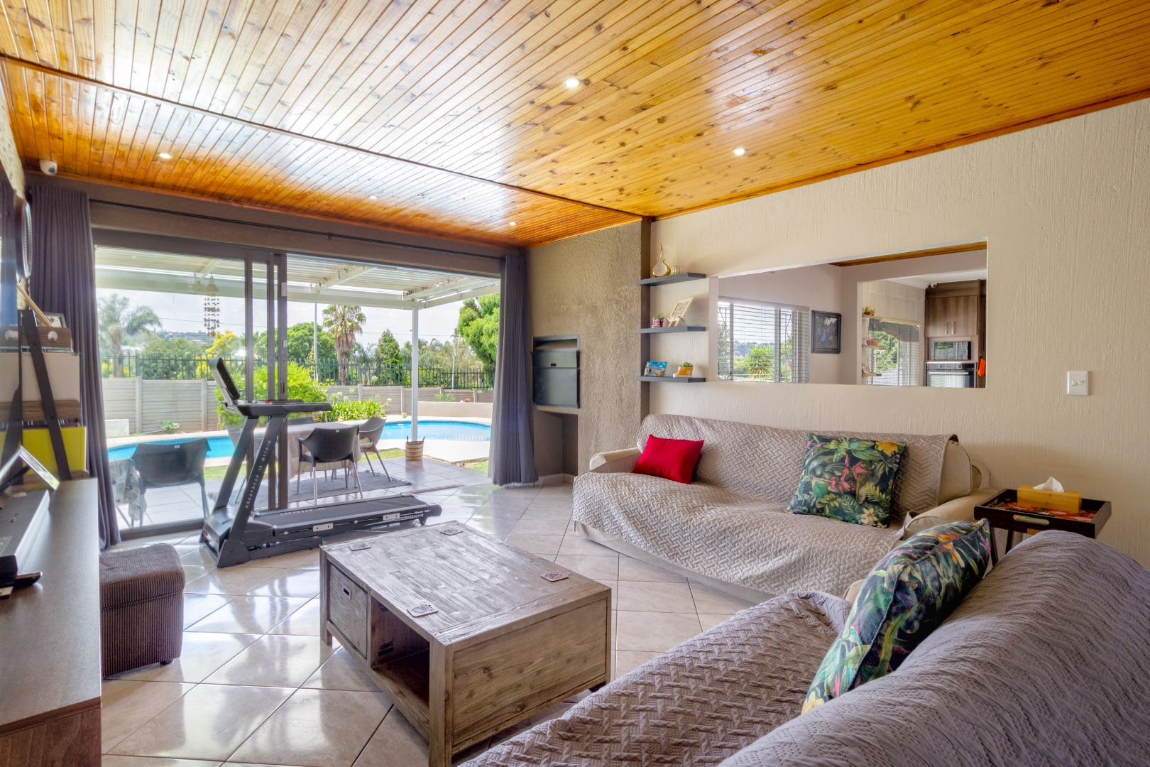 Enjoy outdoor living with a built-in braai and entertainment area overlooking a sparkling blue swimming pool. Additional features include staff quarters, a Wendy hut, and two water tanks for backup water. Solar is installed on a rental basis.