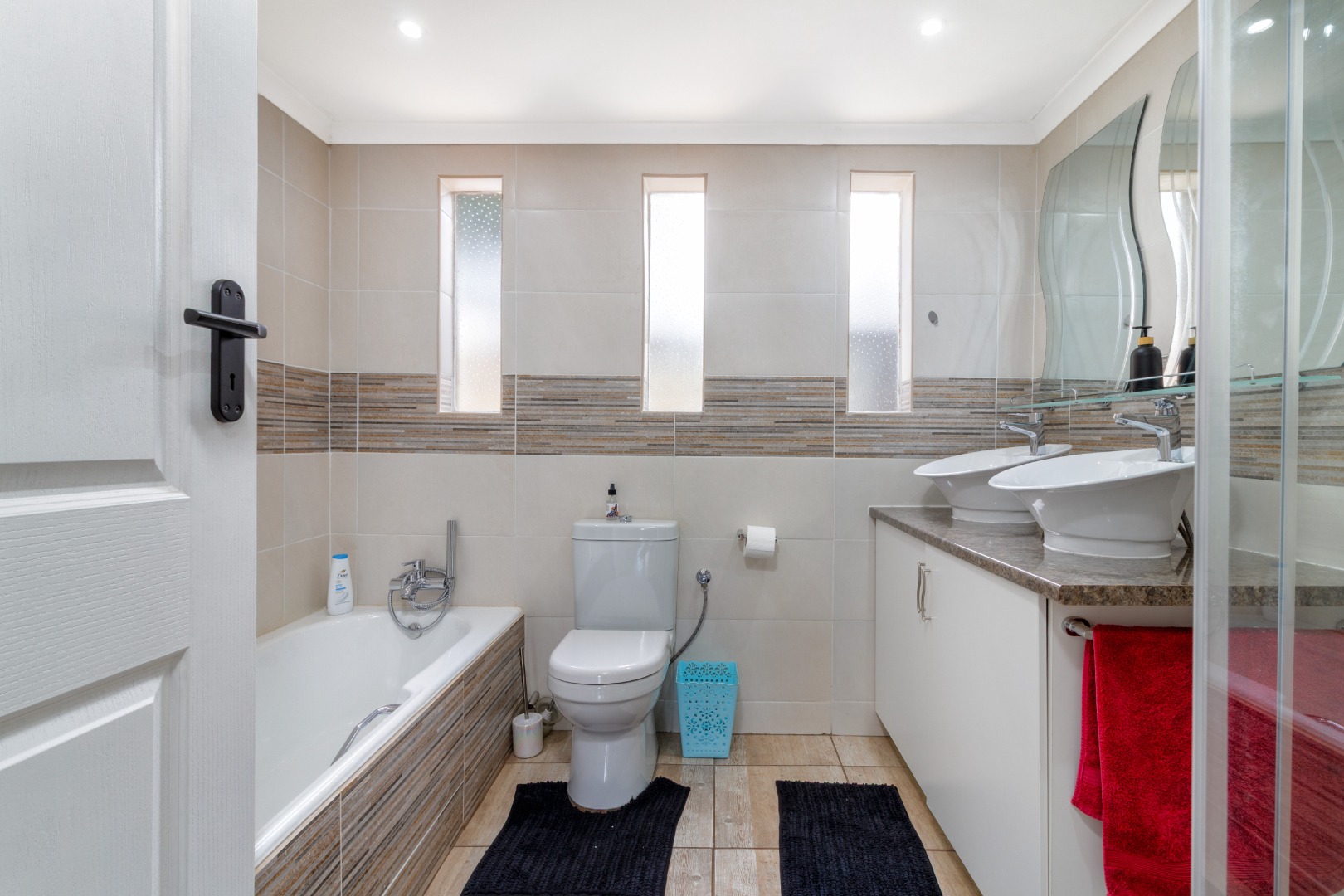 The property features 3 large bedrooms with blinds and 2 upgraded modern bathrooms. The spacious open-plan layout includes a lounge, TV room, and dining area that flows into a very large modern kitchen with extensive kitchen cupboards, breakfast nook, gas stove, pantry, and a separate laundry.