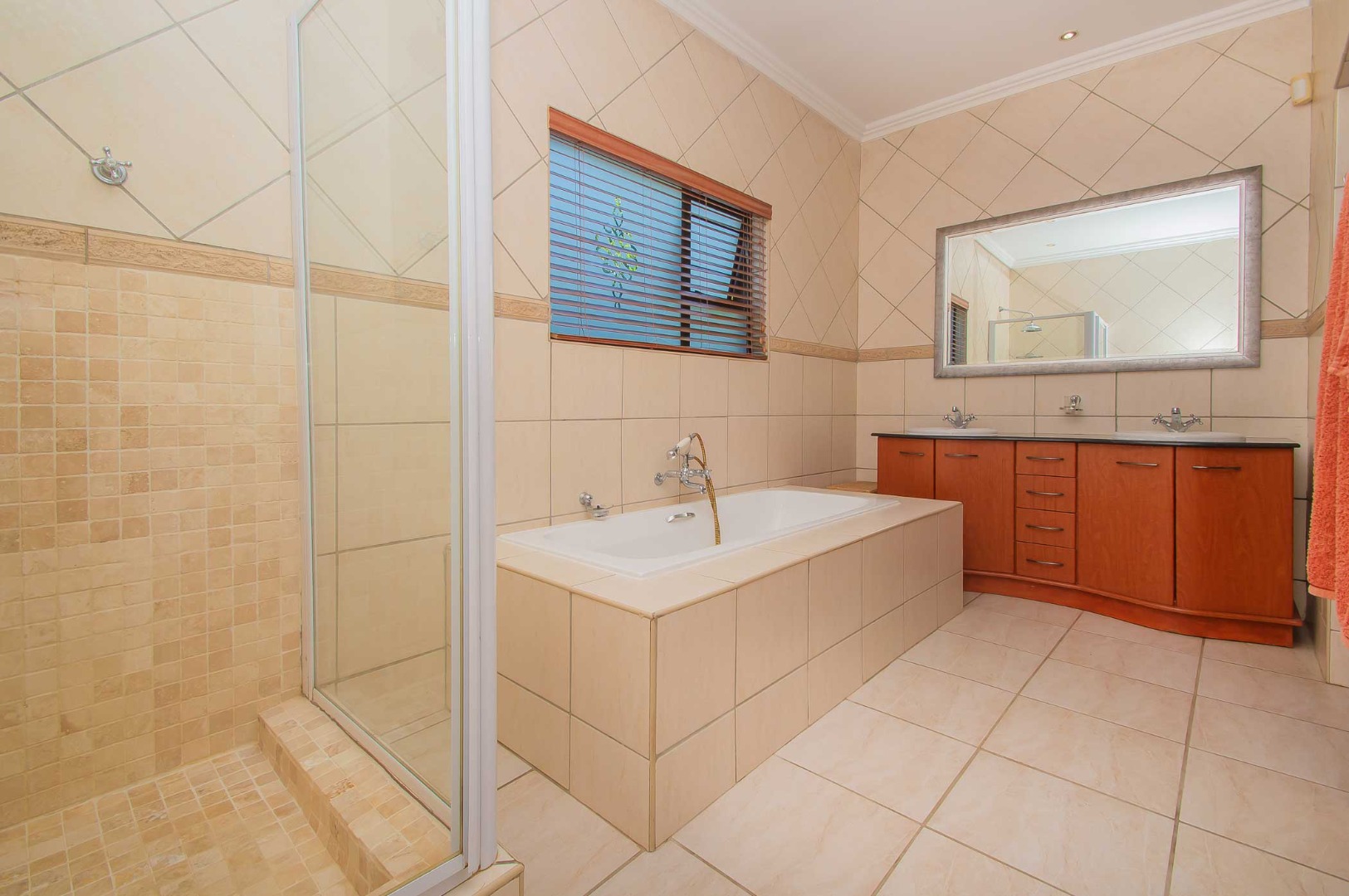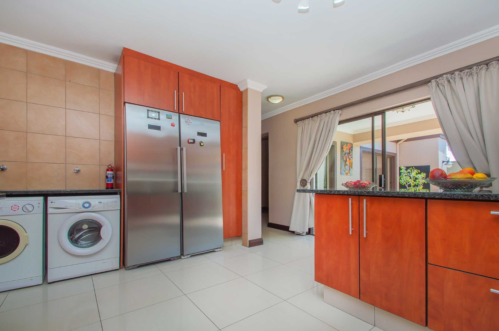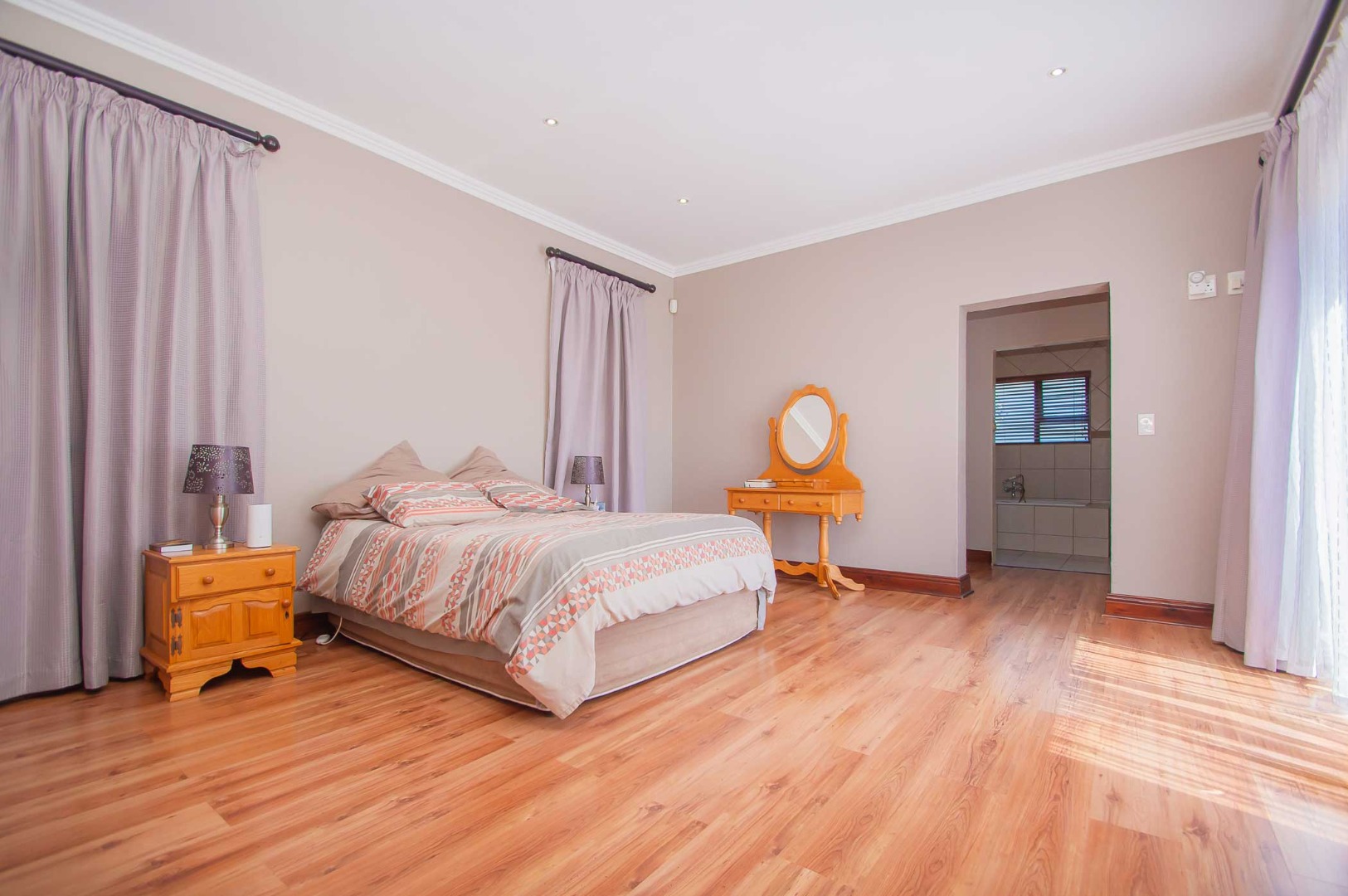 Upon entering, you are greeted by a private formal lounge that sets the tone for the elegance and comfort found throughout the home. The heart of this residence is undoubtedly the kitchen, which boasts ample cupboard space and seamlessly opens out to a covered patio. Here, you’ll find a built-in braai, perfect for entertaining, and views of the solar-heated swimming pool.