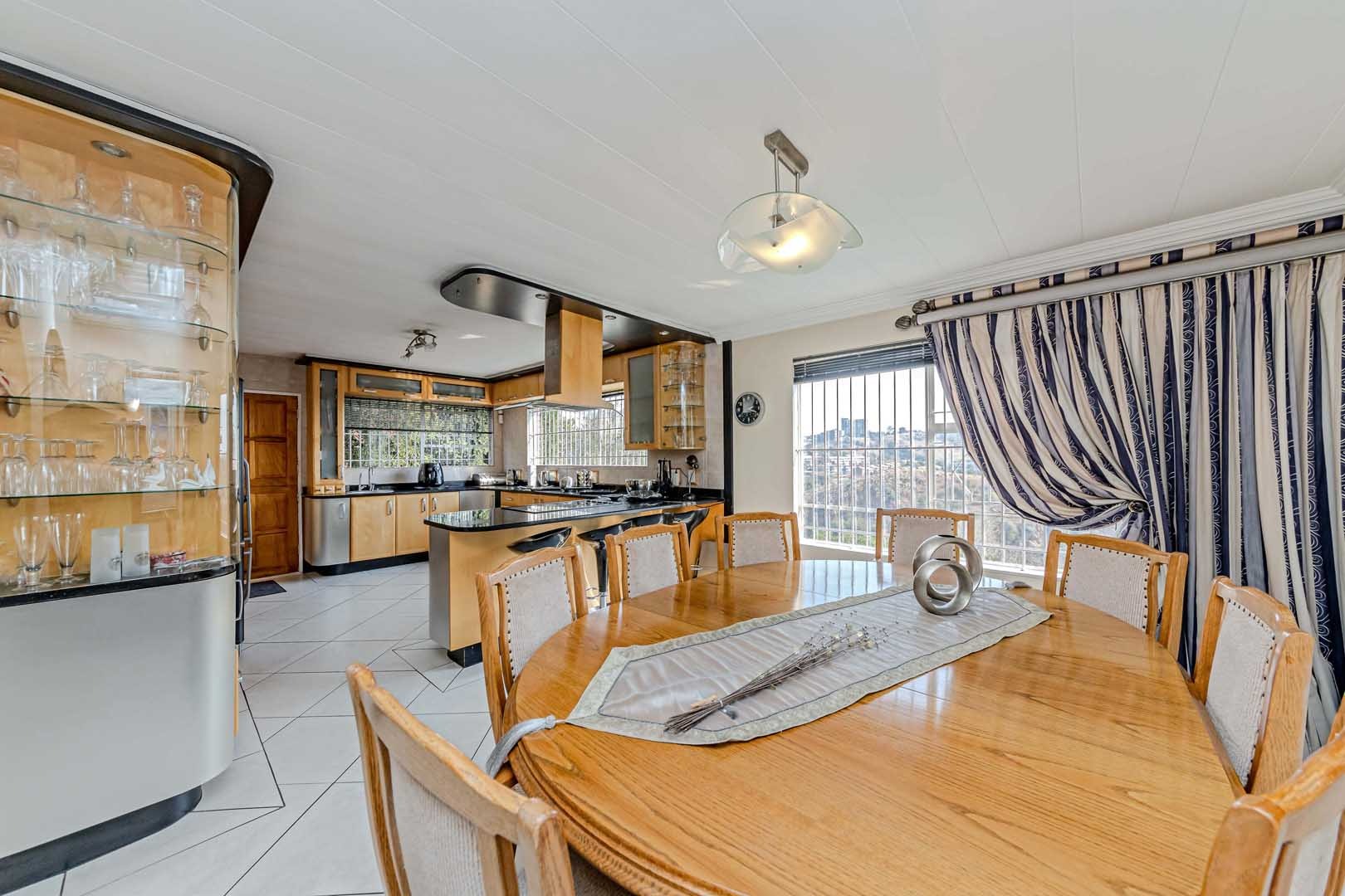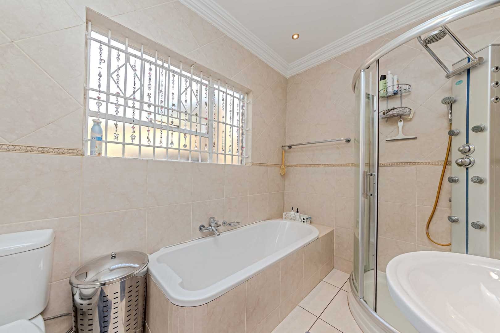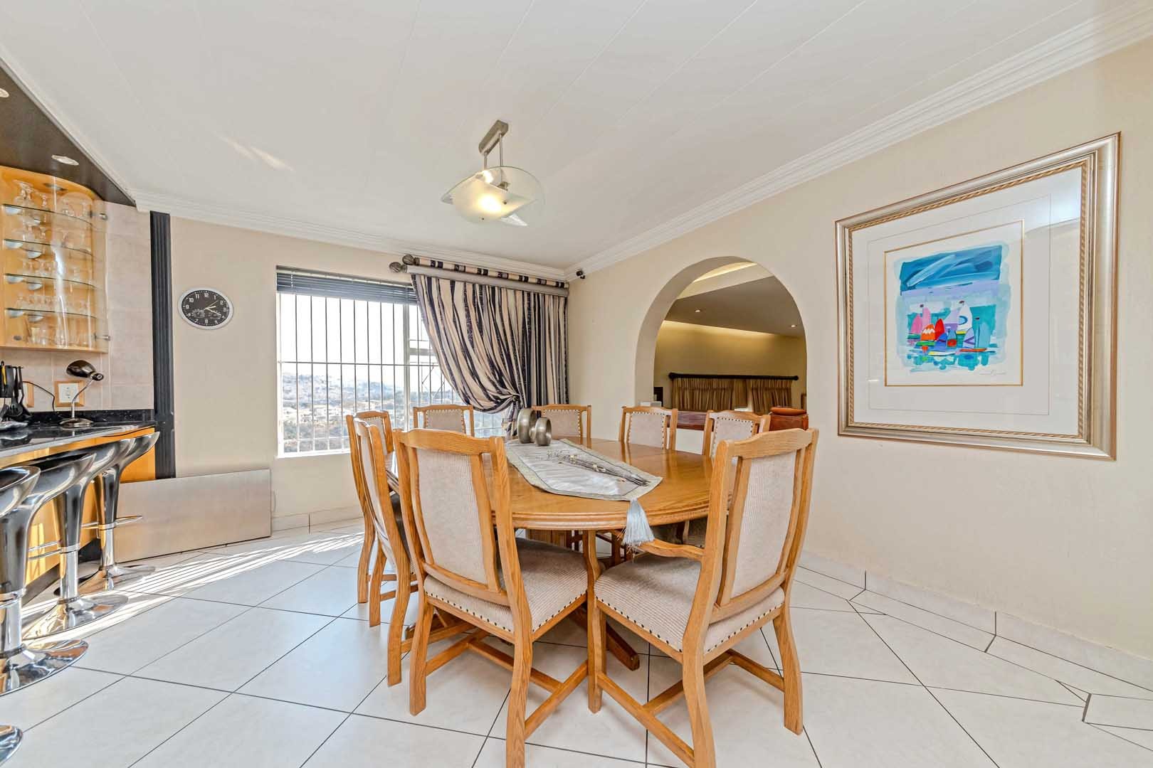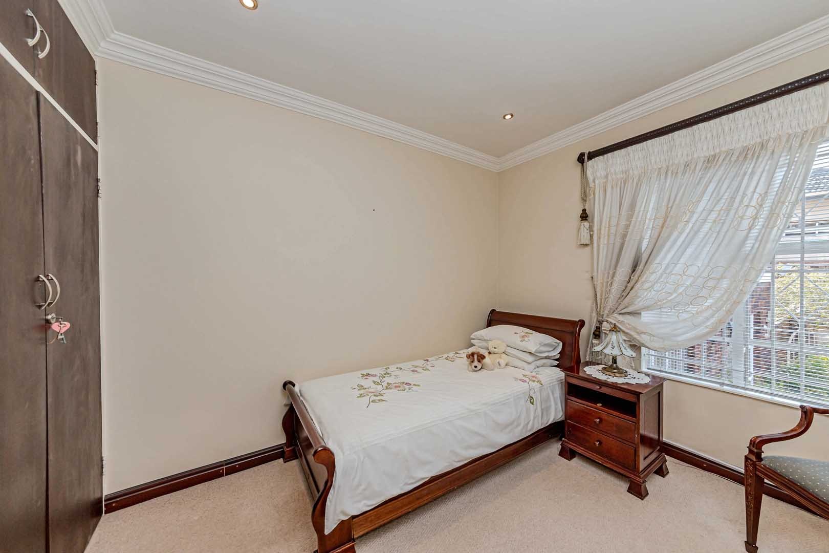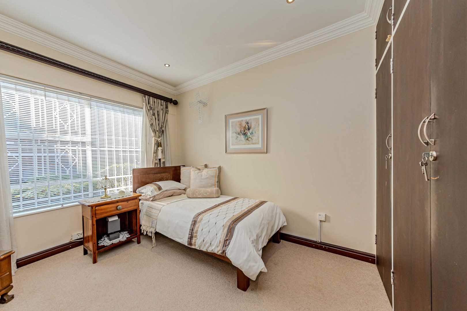 Outside, the home truly comes alive. A mature, low-maintenance garden frames the property, while the sparkling swimming pool and covered braai and entertainment area create the perfect setting for relaxed summer afternoons or elegant evening gatherings. With four secure garages, an alarm system, and a staff room, every detail has been considered to offer peace of mind and convenience.