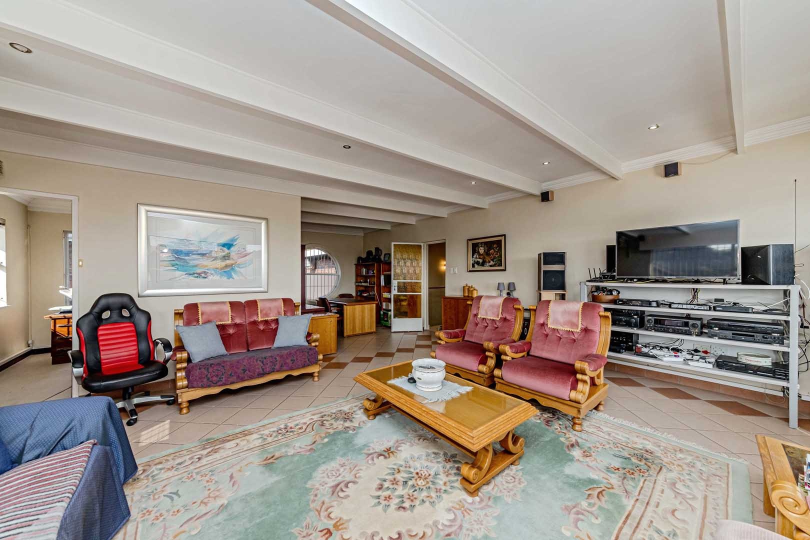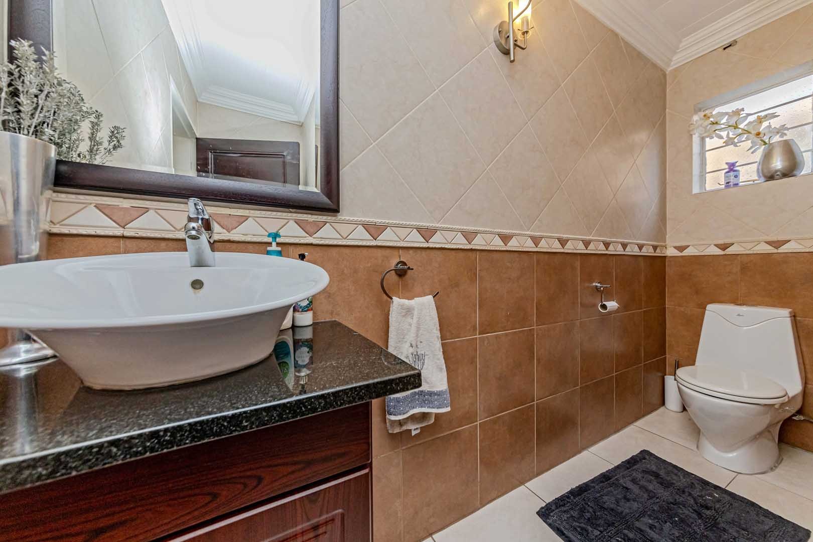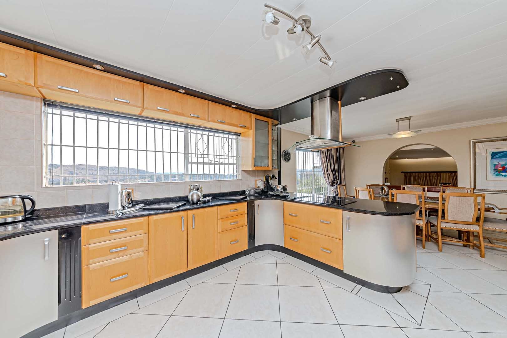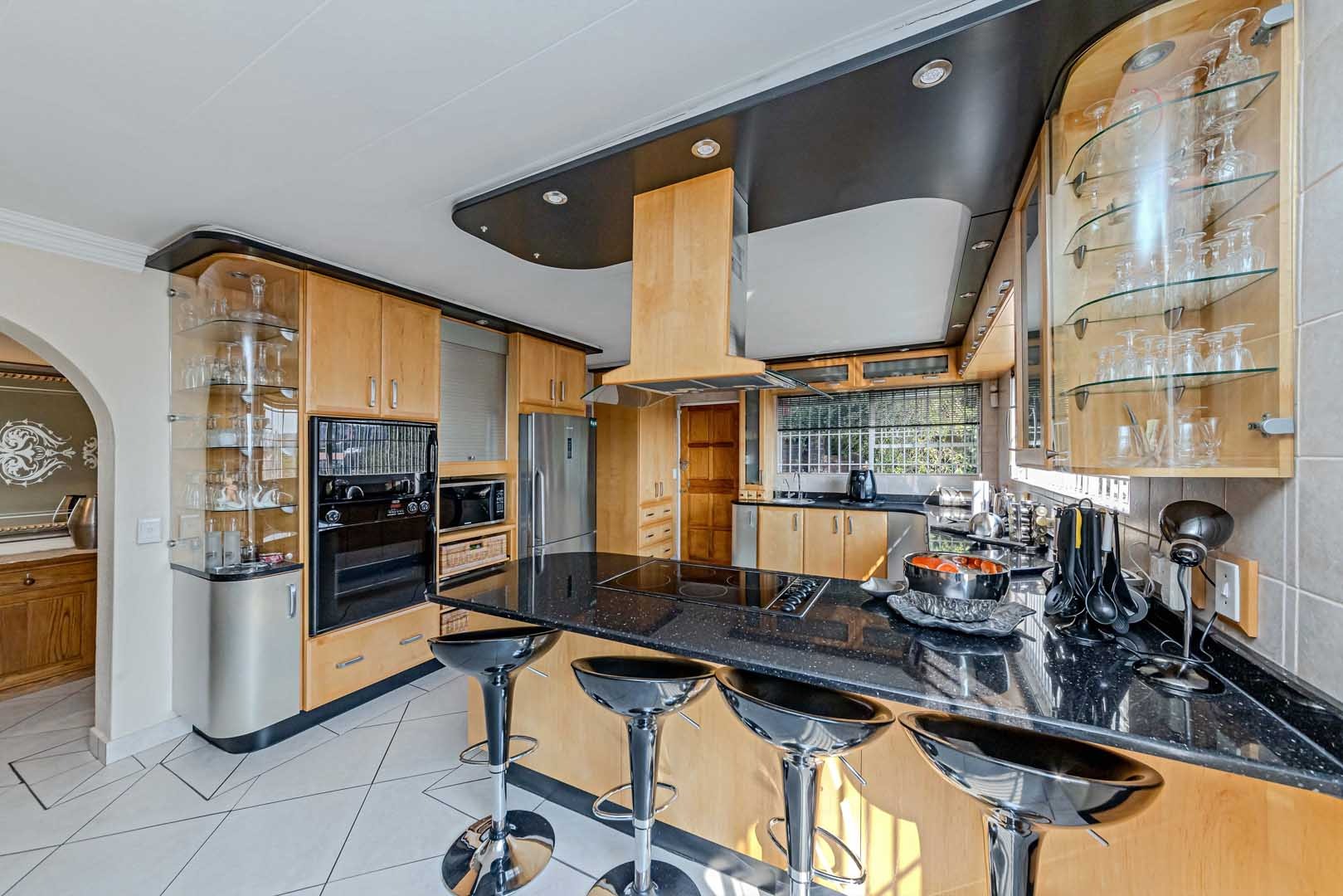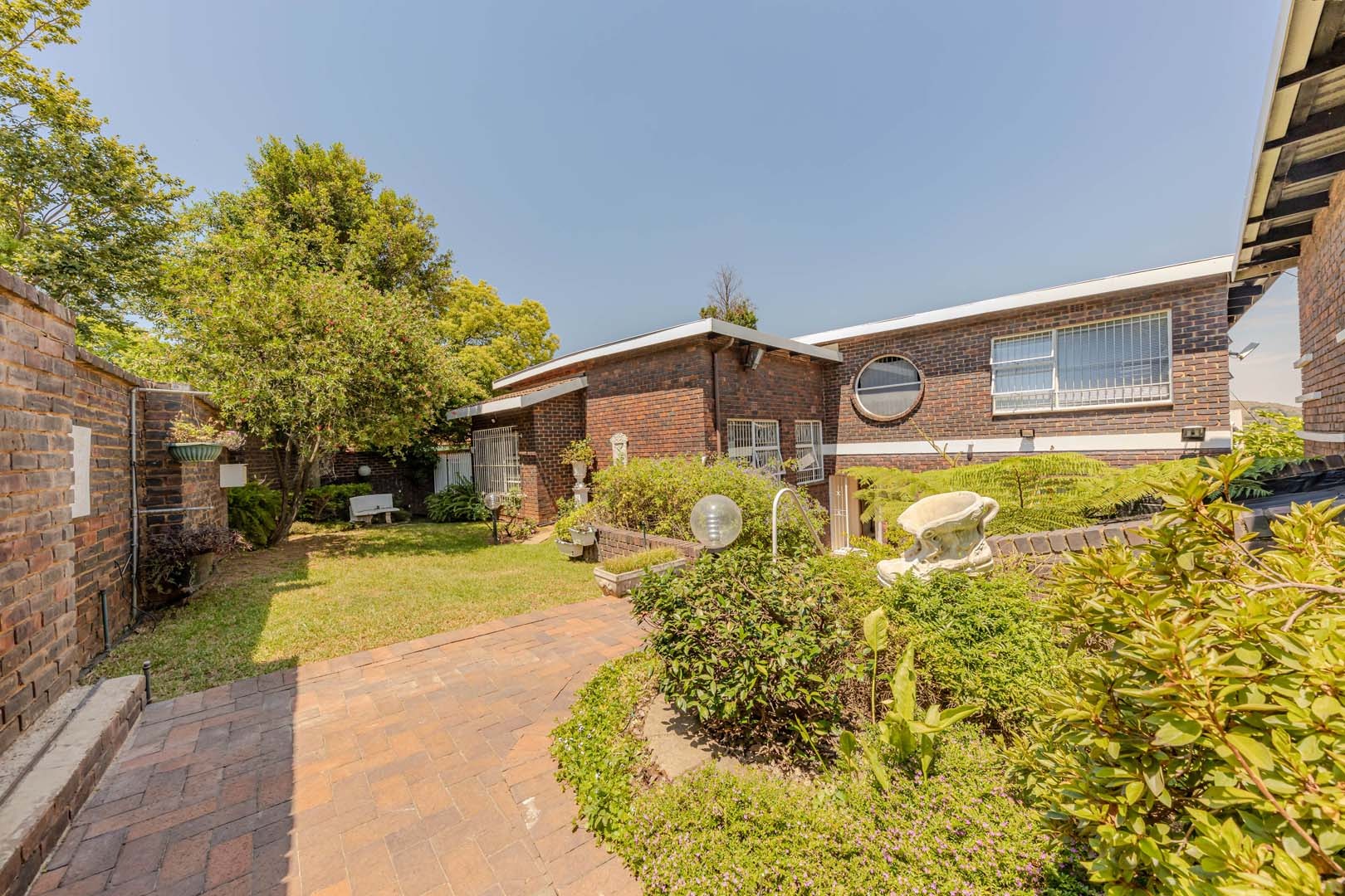 Outside, the home truly comes alive. A mature, low-maintenance garden frames the property, while the sparkling swimming pool and covered braai and entertainment area create the perfect setting for relaxed summer afternoons or elegant evening gatherings. With four secure garages, an alarm system, and a staff room, every detail has been considered to offer peace of mind and convenience.