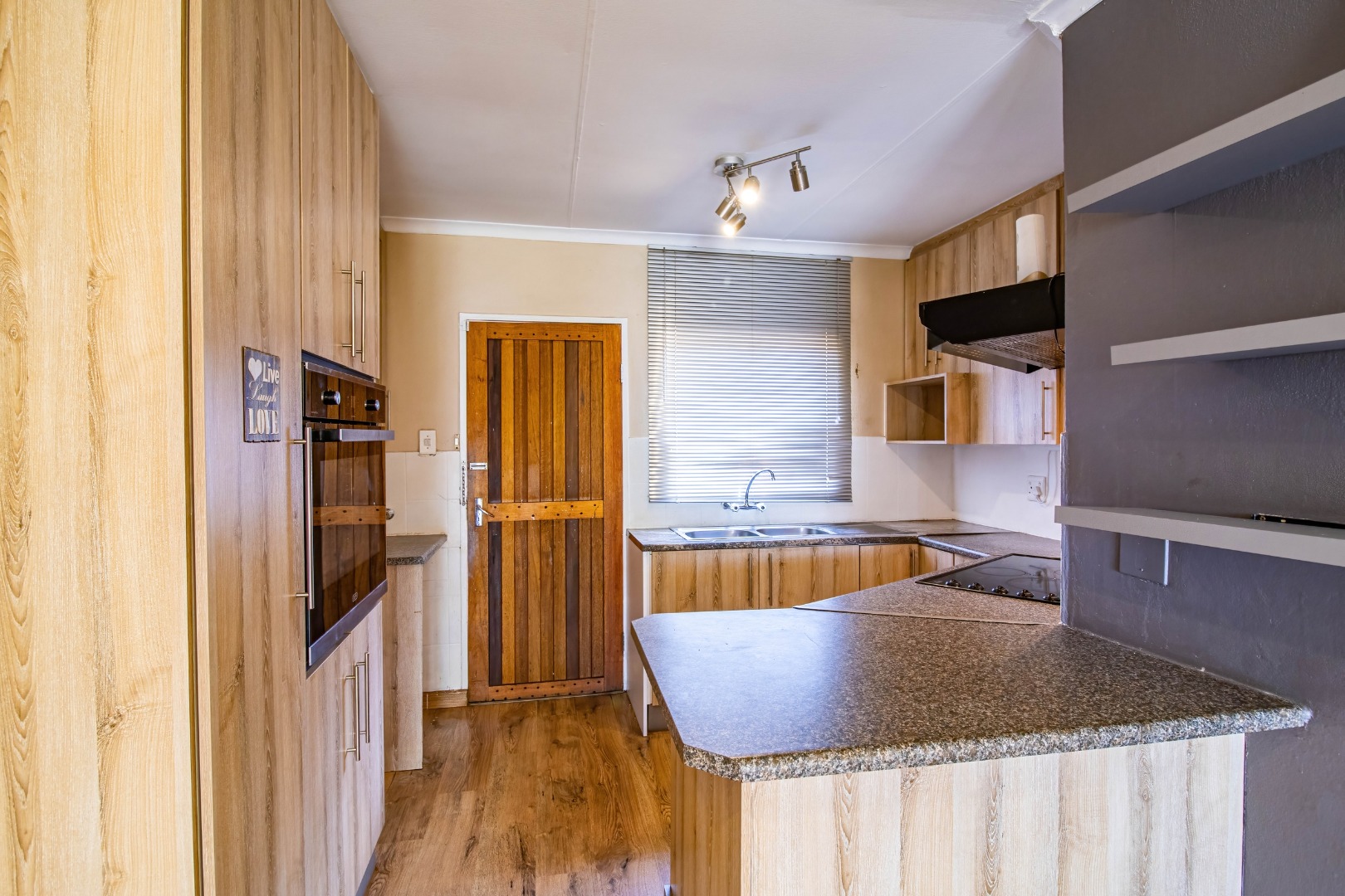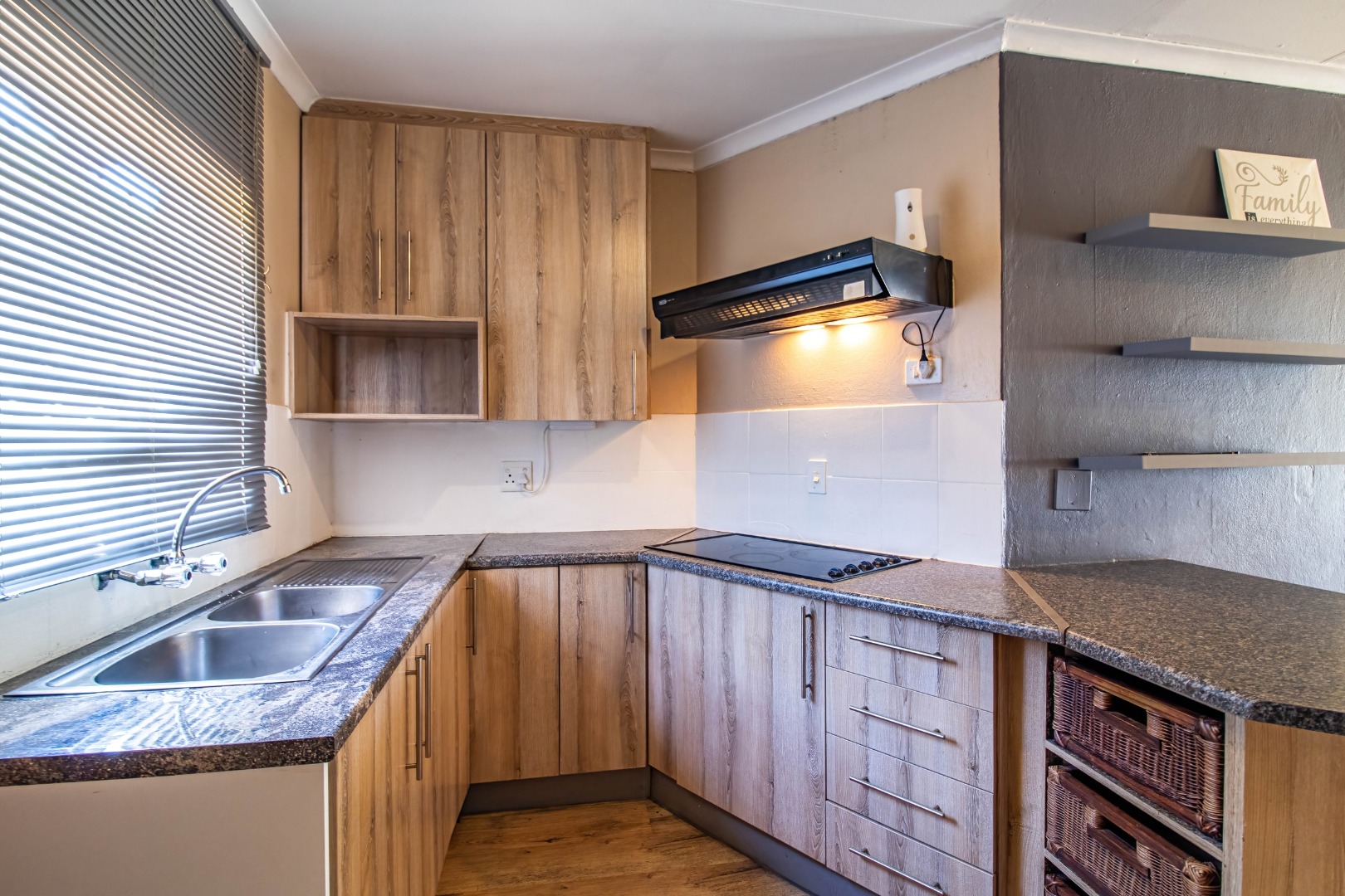 The home features 3 bedrooms and 2 bathrooms, including a main en-suite, with both bathrooms fitted with baths and overhead shower heads. The modern open-plan kitchen is fitted with an eye-level oven, counter-top stove, extractor fan and double sink, flowing seamlessly into the open-plan living and dining area for easy everyday interaction allowing you to interact easily with family or guests while cooking.