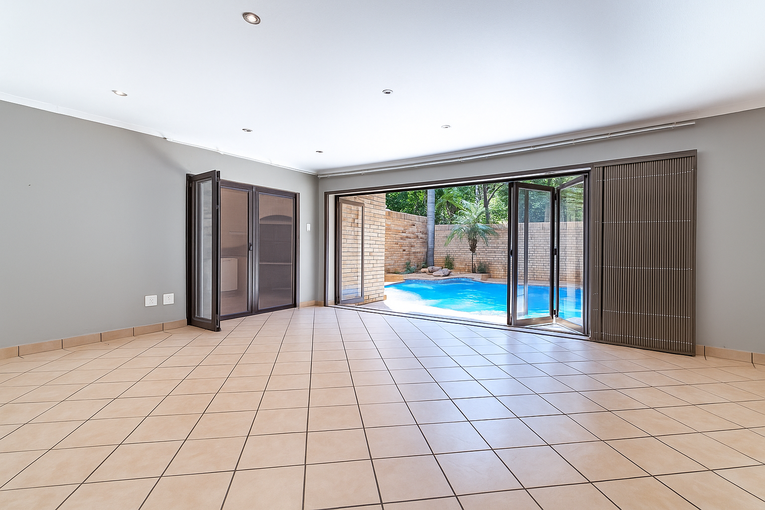 The stacking doors open from the lounge to the swimming pool, offering a peaceful retreat and the perfect setting for weekend relaxation or entertaining guests.