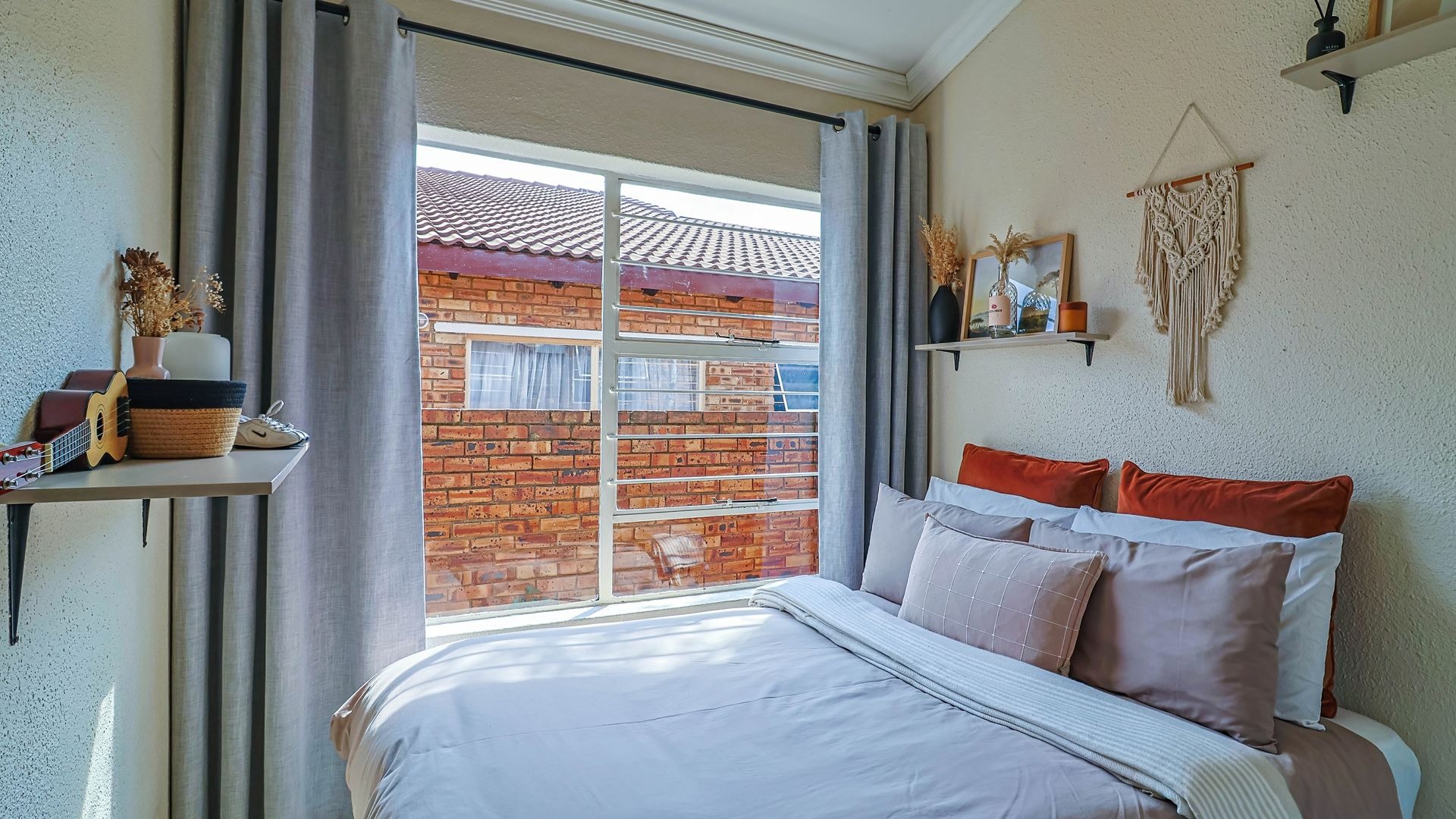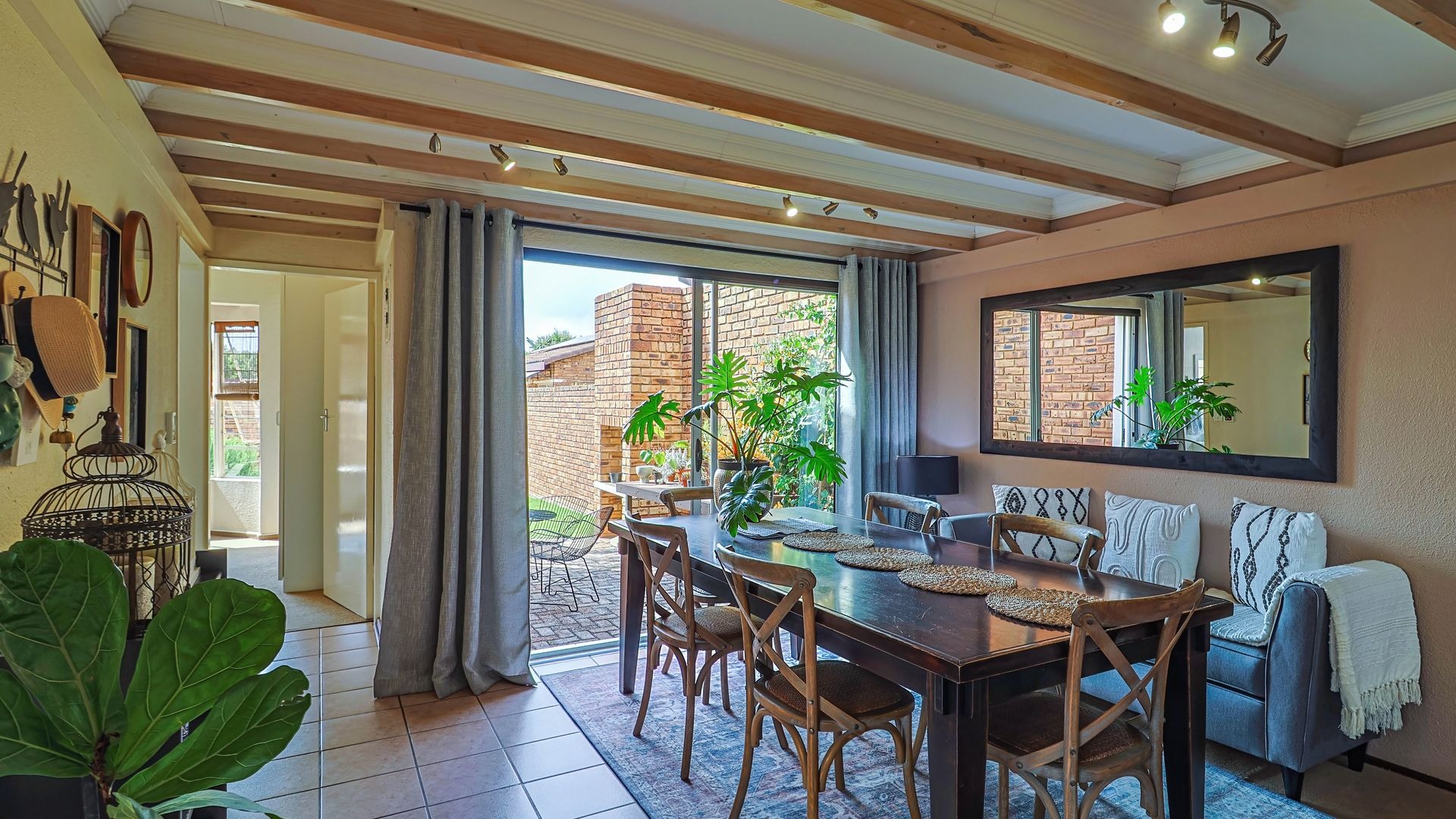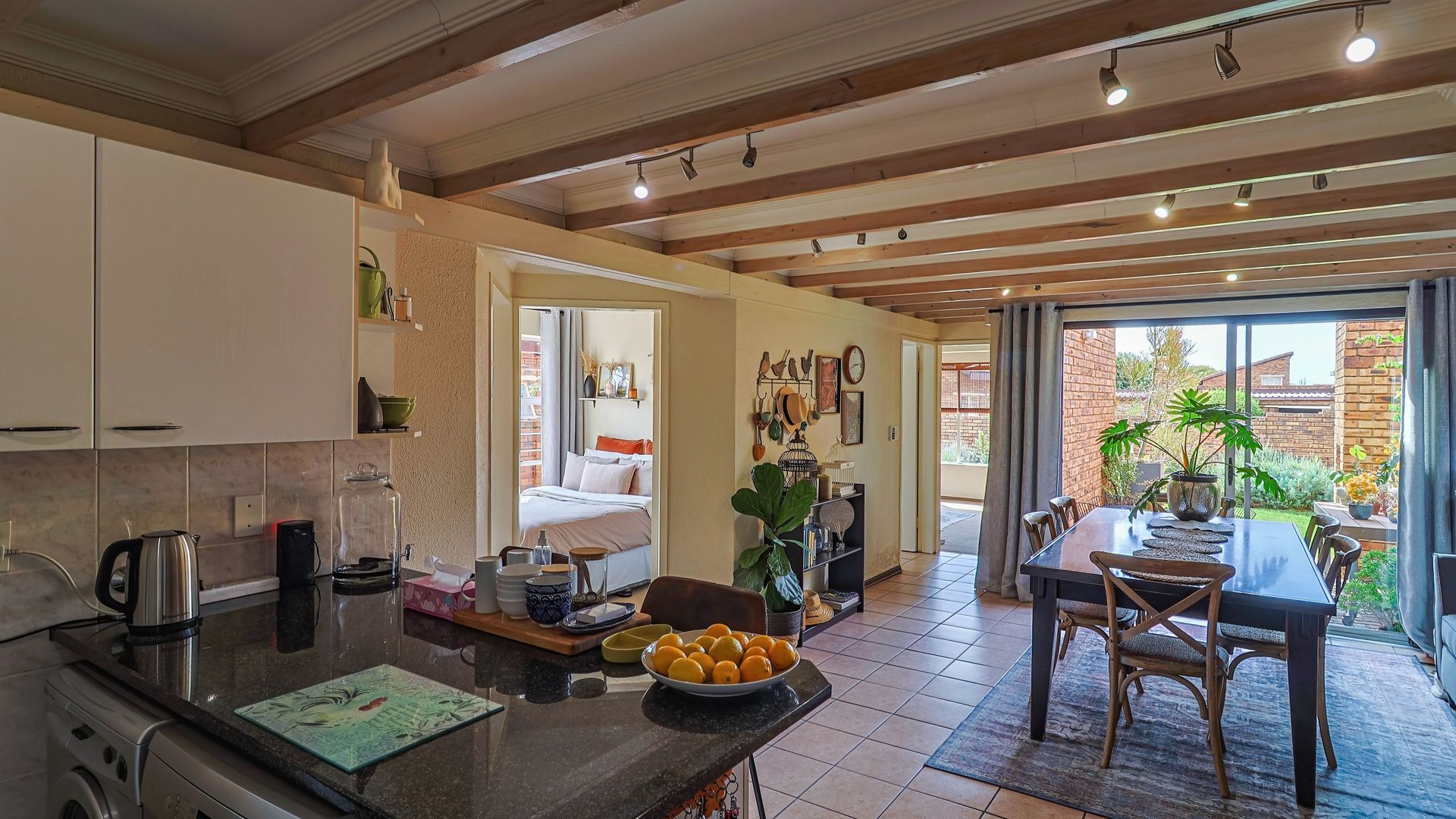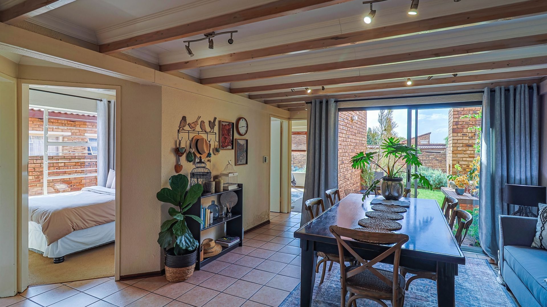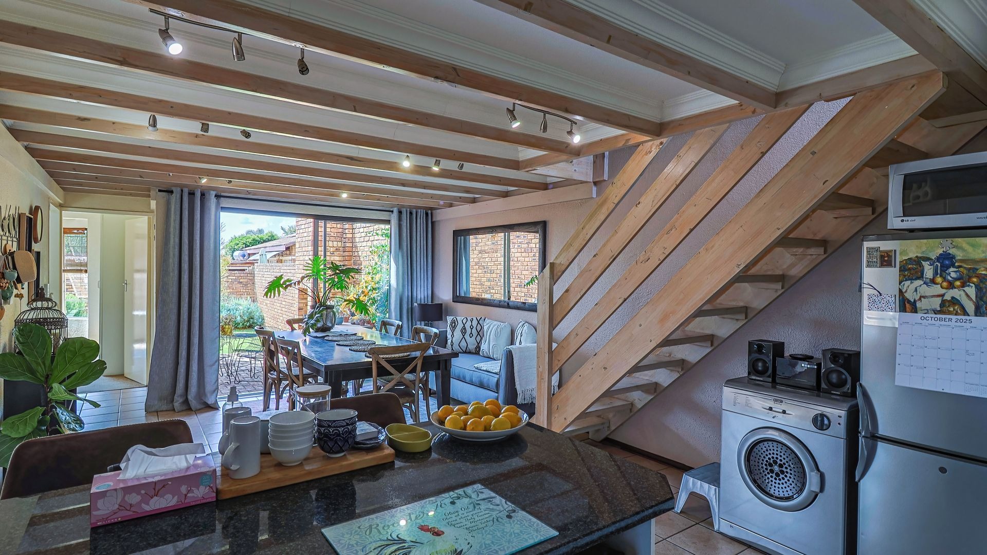 Discover comfortable living in this charming 106 sqm home located within a secure complex in Radiokop, Roodepoort. This property offers a blend of functional design and inviting spaces, perfect for a modern lifestyle. The open-plan layout seamlessly connects the living, dining, and kitchen areas, creating a spacious and interactive environment. Character is added by exposed wooden ceiling beams and track lighting, while the kitchen features white cabinetry with granite countertops, a practical island with seating, and space for your essential appliances. A natural wood staircase provides access to the upper level. Upstairs, you will find a versatile loft — perfect as an additional lounge, extra guest bedroom, home office, gym, or whatever your heart desires.
