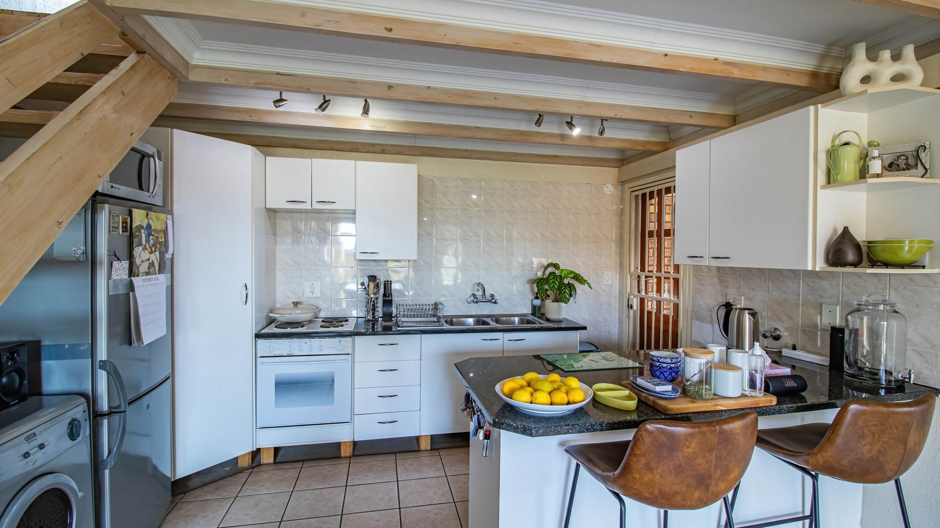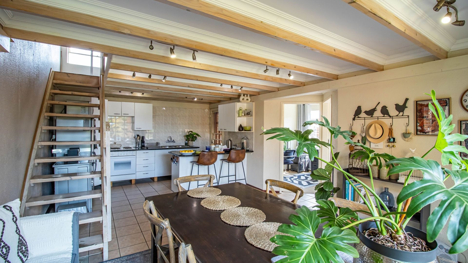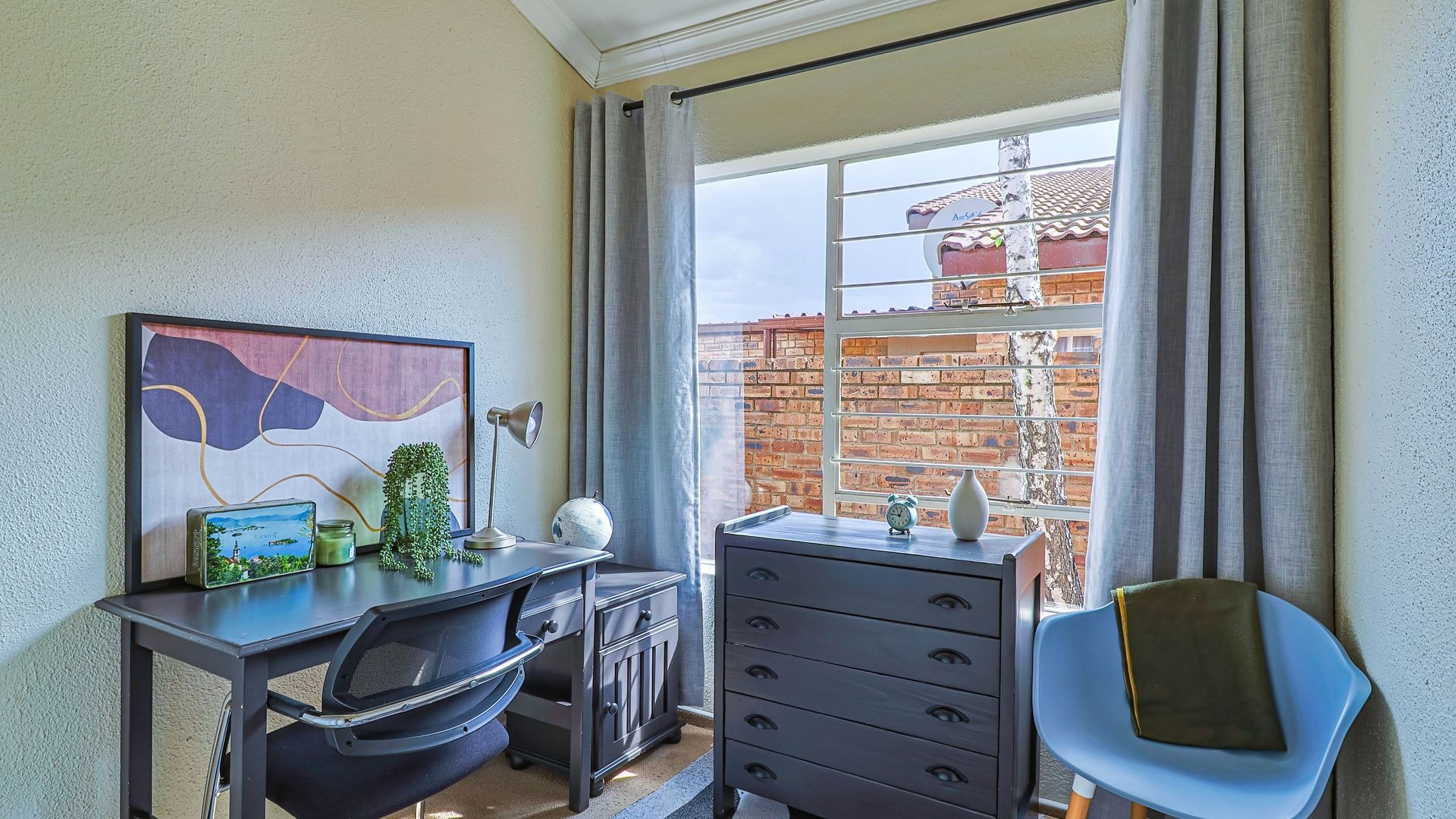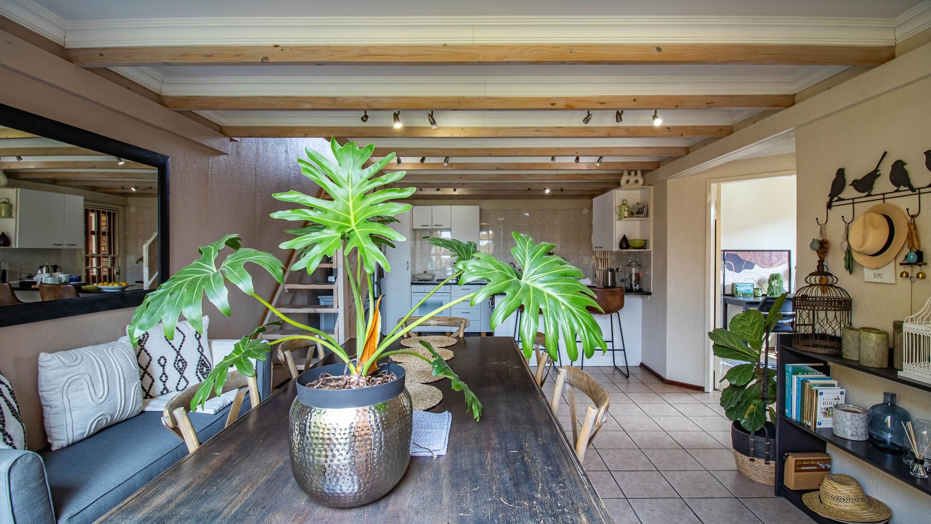 Discover comfortable living in this charming 106 sqm home located within a secure complex in Radiokop, Roodepoort. This property offers a blend of functional design and inviting spaces, perfect for a modern lifestyle. The open-plan layout seamlessly connects the living, dining, and kitchen areas, creating a spacious and interactive environment. Character is added by exposed wooden ceiling beams and track lighting, while the kitchen features white cabinetry with granite countertops, a practical island with seating, and space for your essential appliances. A natural wood staircase provides access to the upper level. Upstairs, you will find a versatile loft — perfect as an additional lounge, extra guest bedroom, home office, gym, or whatever your heart desires.