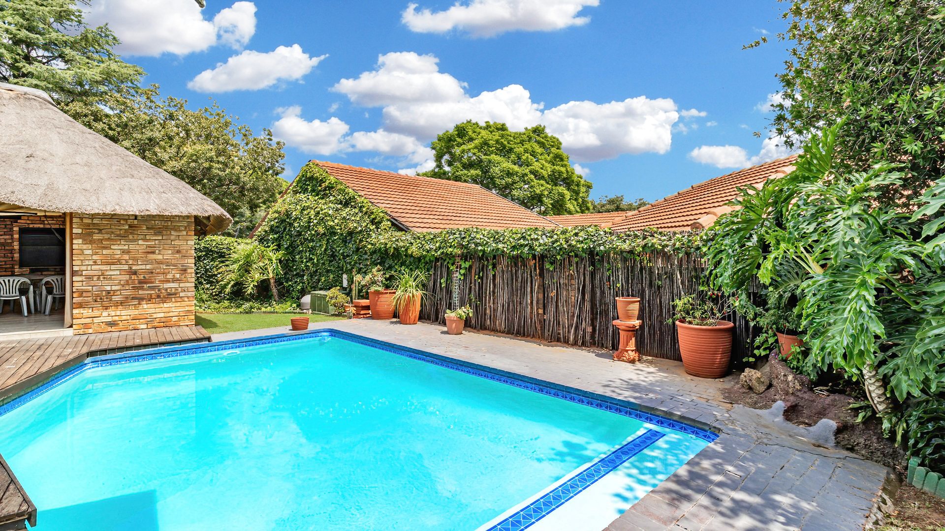Step outside to your own private oasis, complete with a sparkling swimming pool, ideal for relaxation and family fun. The outdoor area also features a charming lapa, built-in braai, and a spacious patio, perfect for entertaining while overlooking the well-maintained garden. Parking is plentiful with two garages and four additional open parking bays.