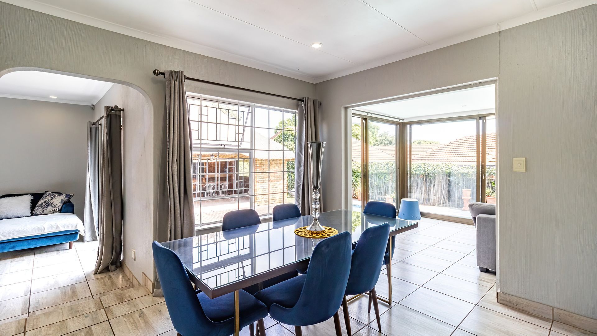 The interior boasts an expansive layout ideal for both relaxed family living and effortless entertaining. From the moment you enter, you are welcomed by a sense of space and openness. The home features two distinct lounges, a dedicated dining room, and a well-appointed kitchen with a pantry, perfect for culinary enthusiasts. An additional entrance lounge adds flexibility, while the enclosed patio room with large sliding glass doors allows for an abundance of natural light and smooth indoor-outdoor living.