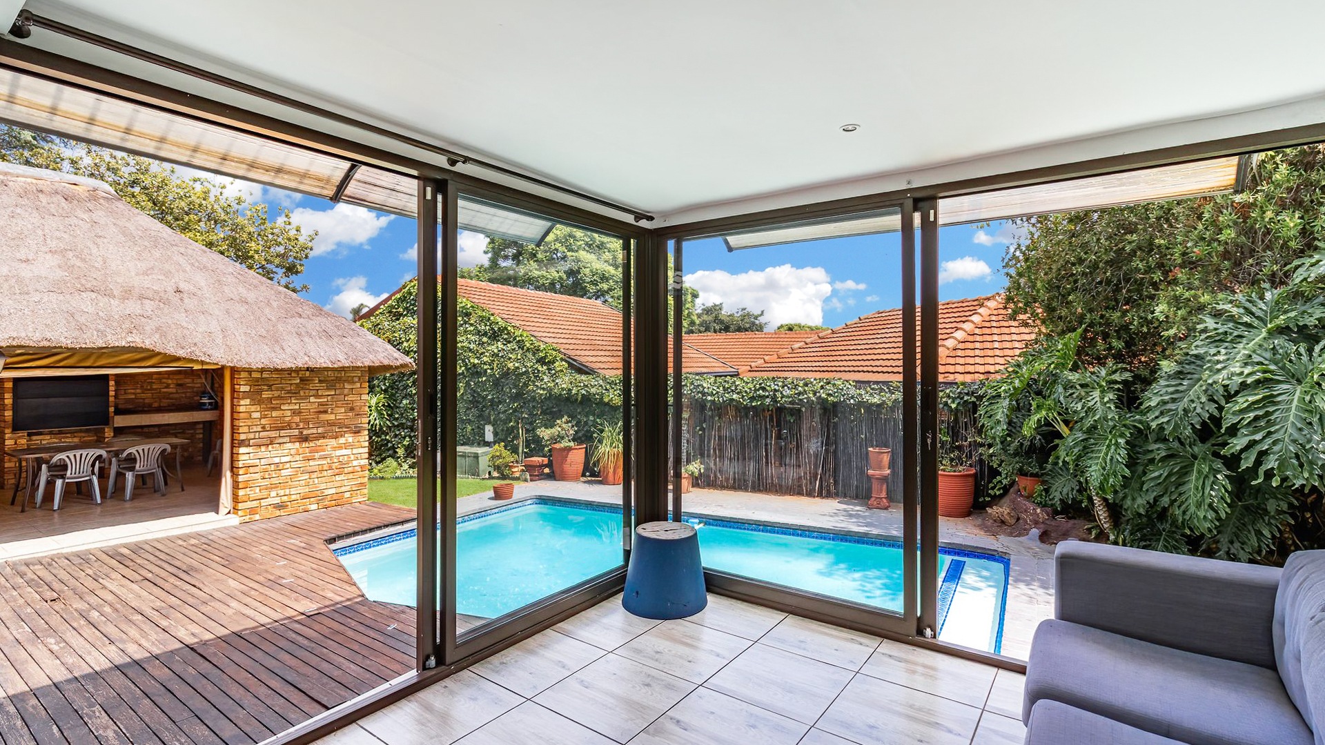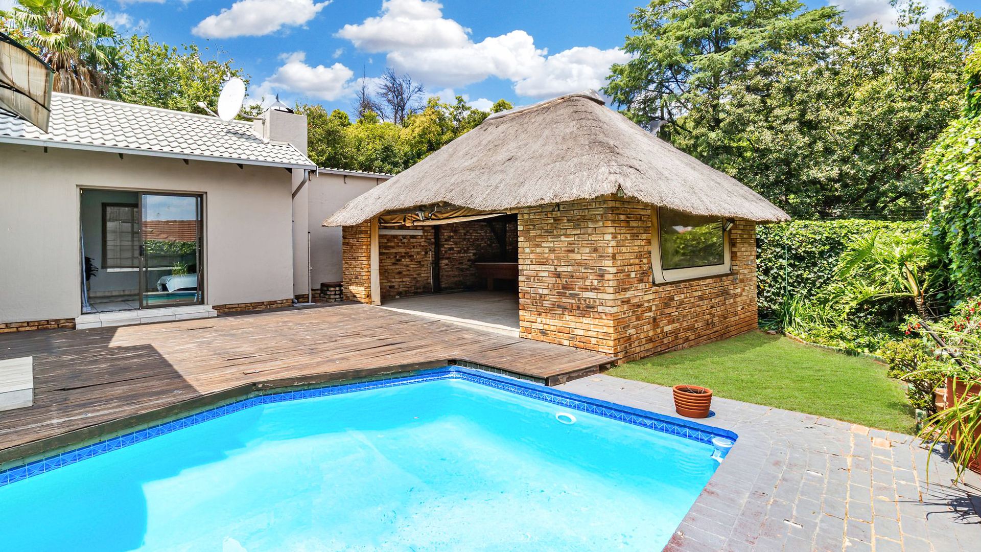 Step outside to your own private oasis, complete with a sparkling swimming pool, ideal for relaxation and family fun. The outdoor area also features a charming lapa, built-in braai, and a spacious patio, perfect for entertaining while overlooking the well-maintained garden. Parking is plentiful with two garages and four additional open parking bays.