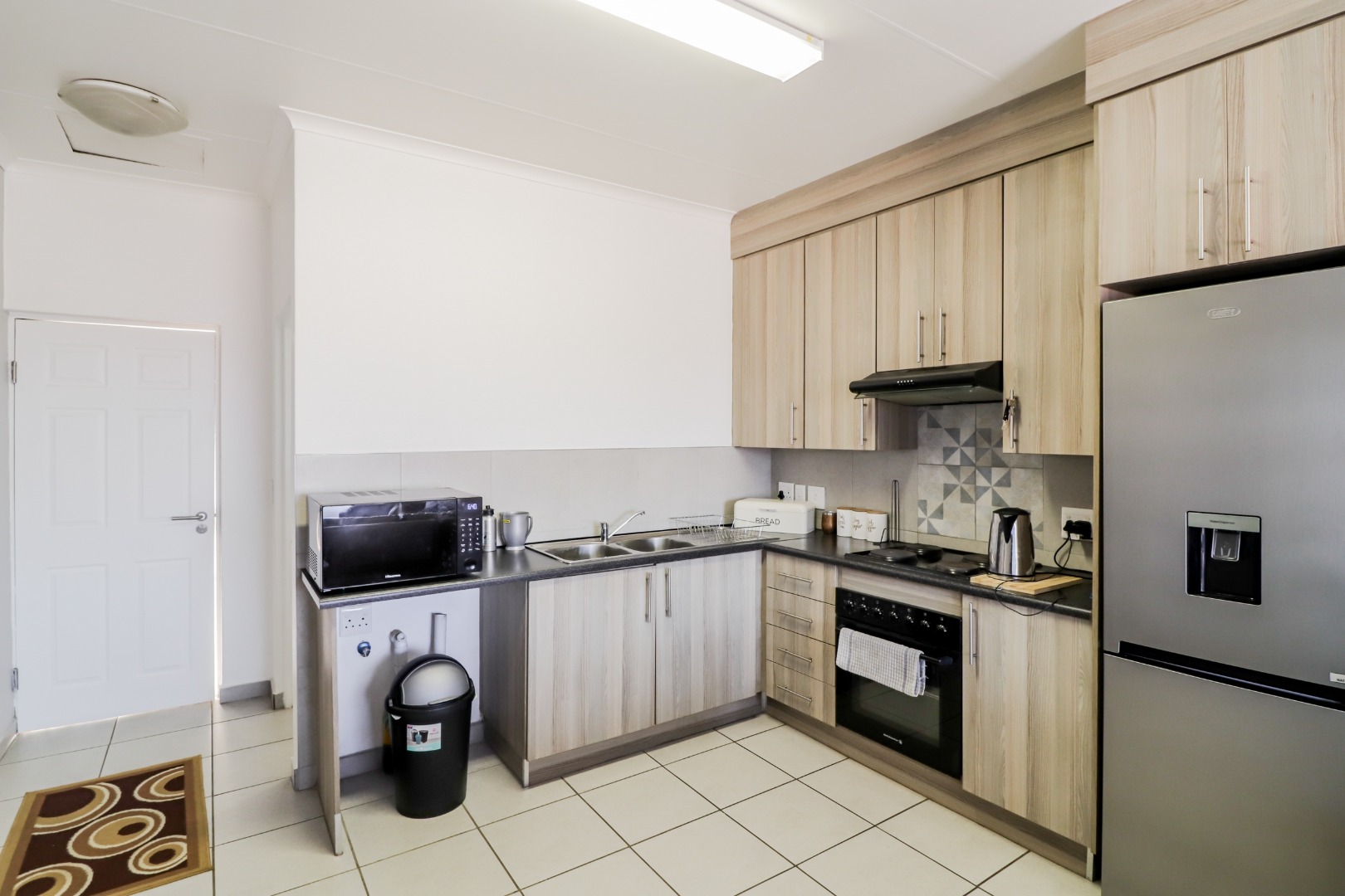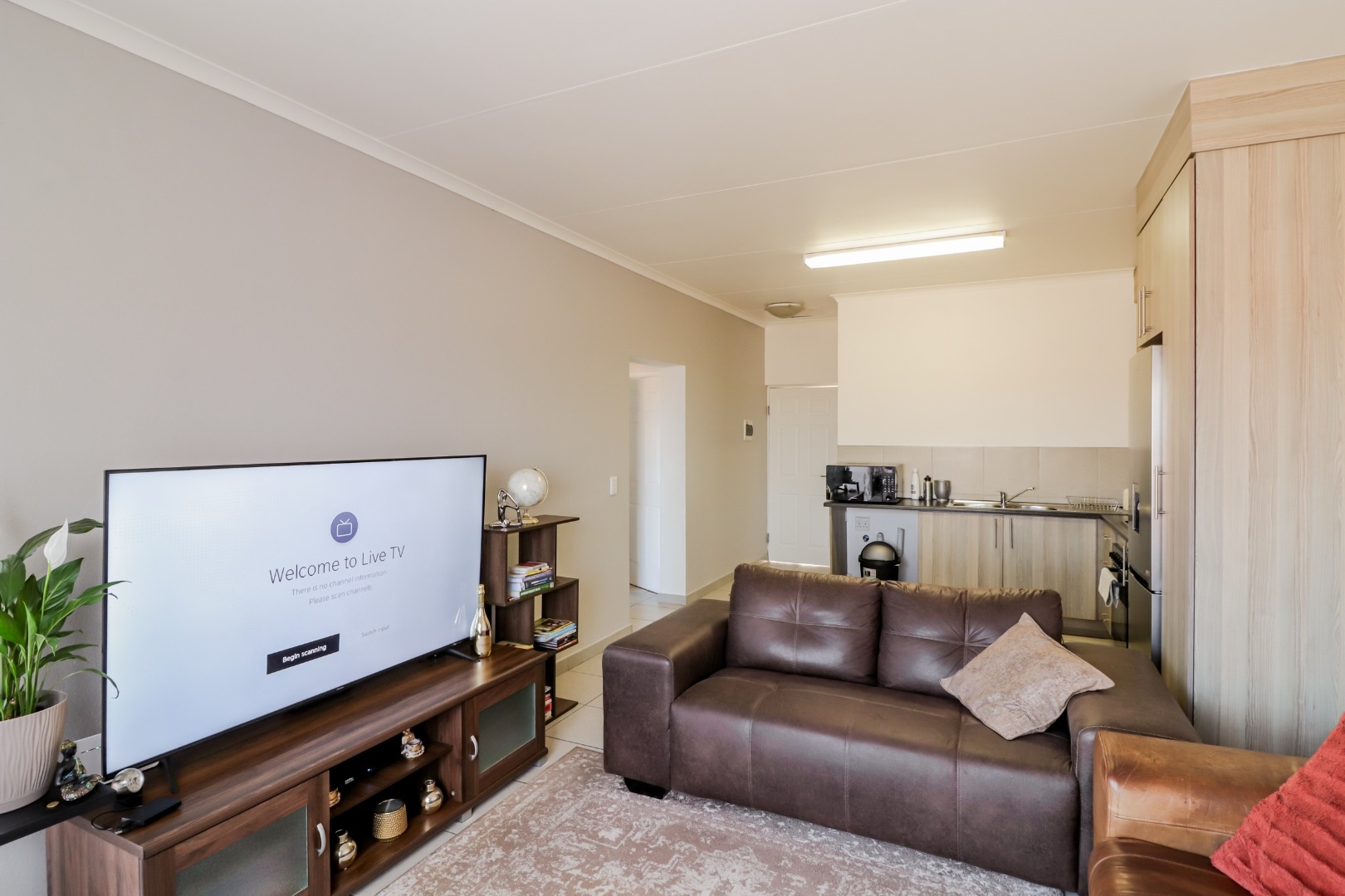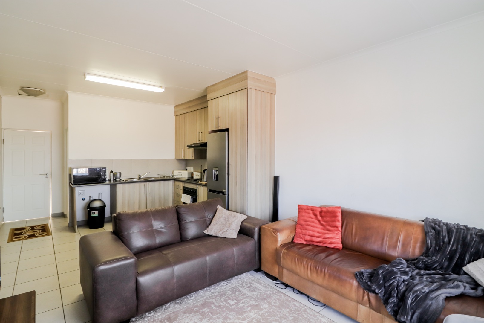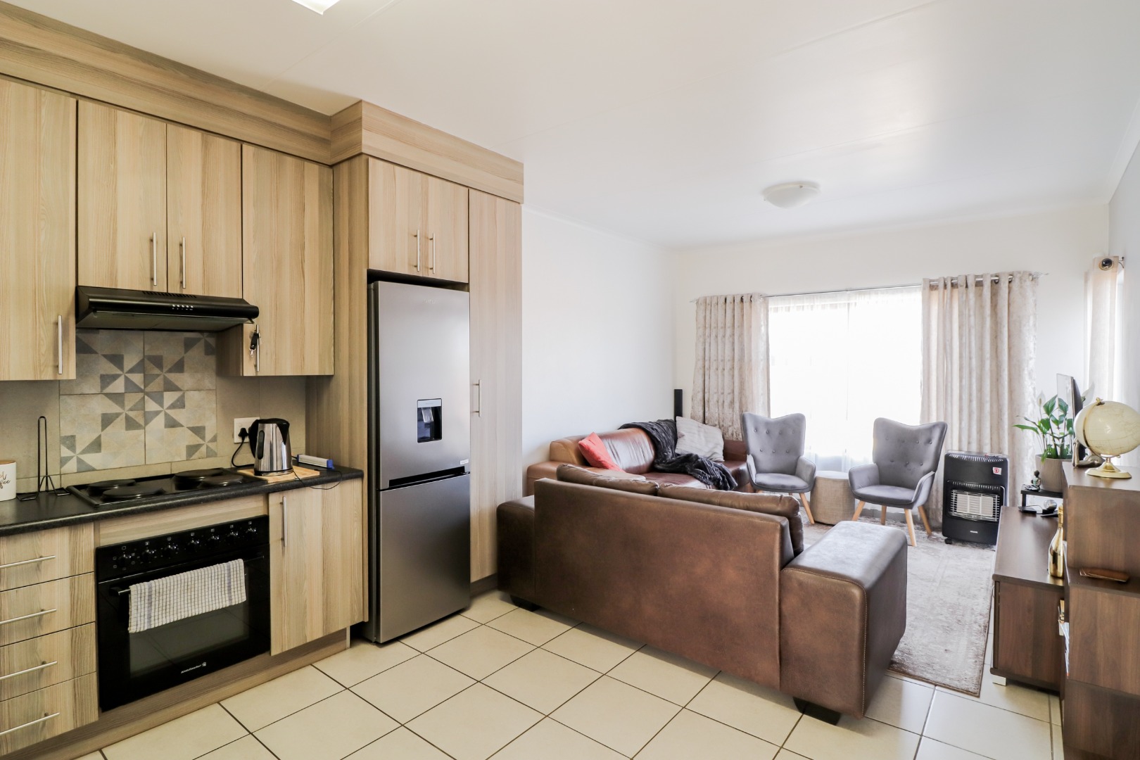 Step inside and discover a bright, open-plan living area that flows seamlessly into a modern kitchen. The kitchen is super practical with light wood-look cabinetry, built-in oven, hob, and extractor fan, plus a large stainless steel fridge. Tiled flooring throughout makes for easy cleaning, and there's loads of natural light pouring in, making the space feel airy and inviting. It’s perfect for chilling out or having friends over.