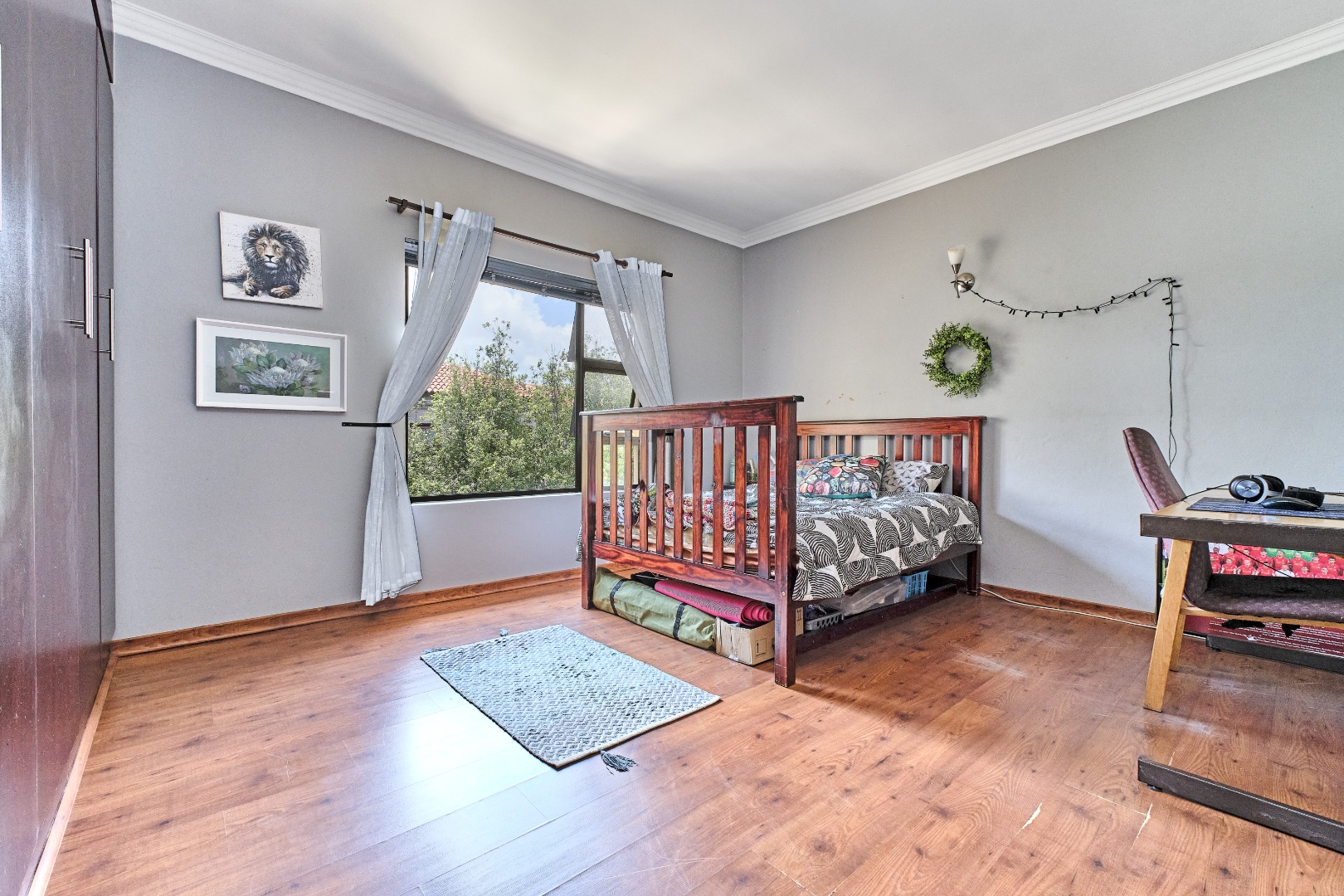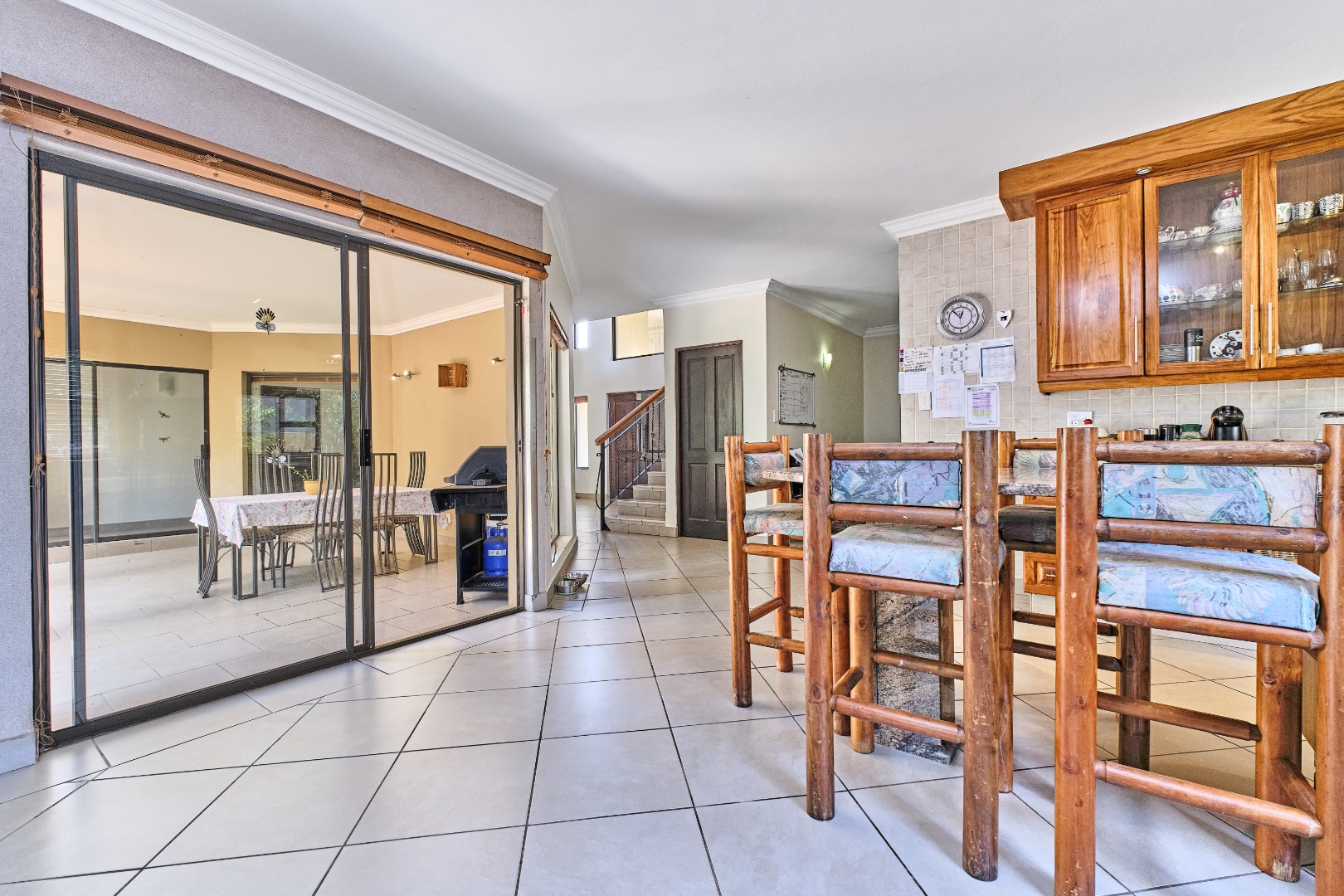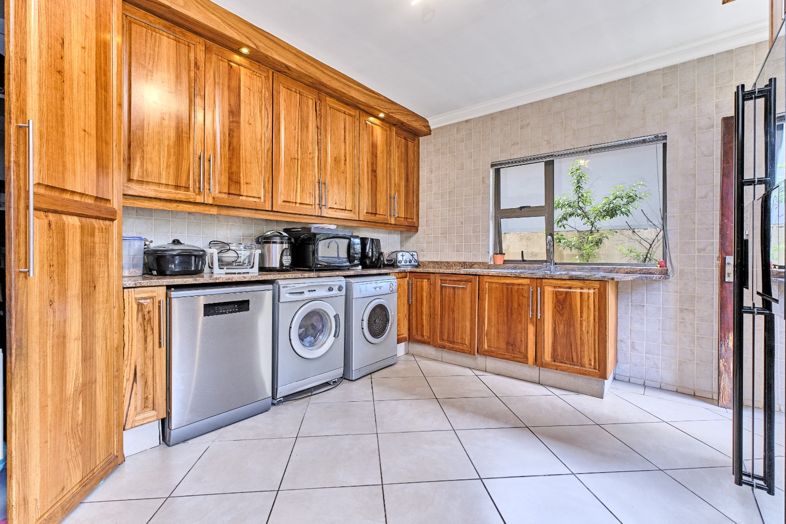 Discover this inviting family residence situated within a prestigious golf estate in Ruimsig, Roodepoort. The home welcomes you with a spacious entrance featuring high ceilings and elegant dark wooden double doors, setting a grand tone. Inside, the layout offers two distinct lounges downstairs, a pyjama lounge upstairs, and a dedicated dining room, providing ample space for both relaxation and entertaining. The heart of the home is a well-appointed kitchen, boasting extensive wooden cabinetry, durable granite countertops, and tiled flooring. Equipped with a built-in oven, hob, and extractor fan, it benefits from abundant natural light and seamlessly connects to an open-plan living area, complete with a practical breakfast bar.