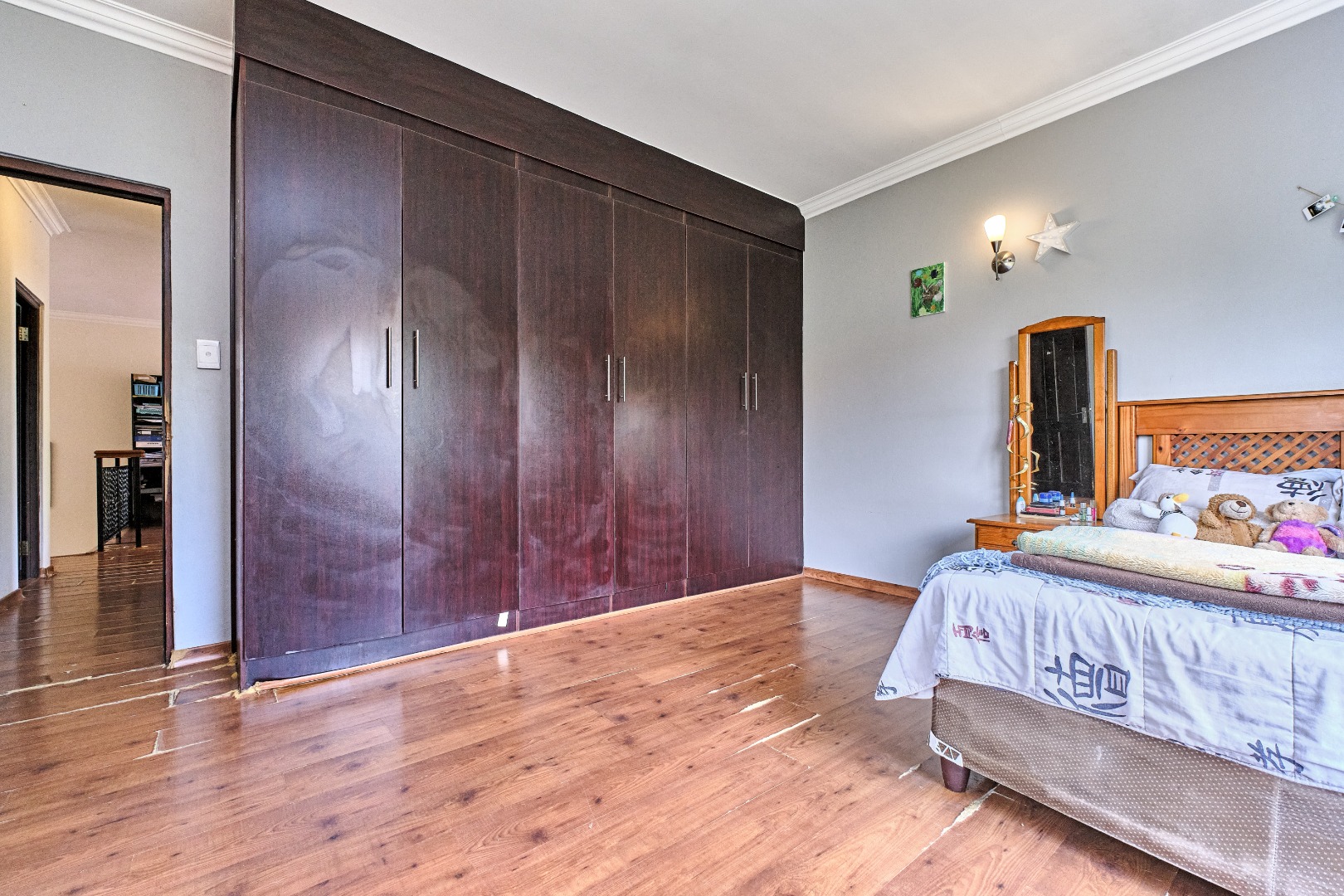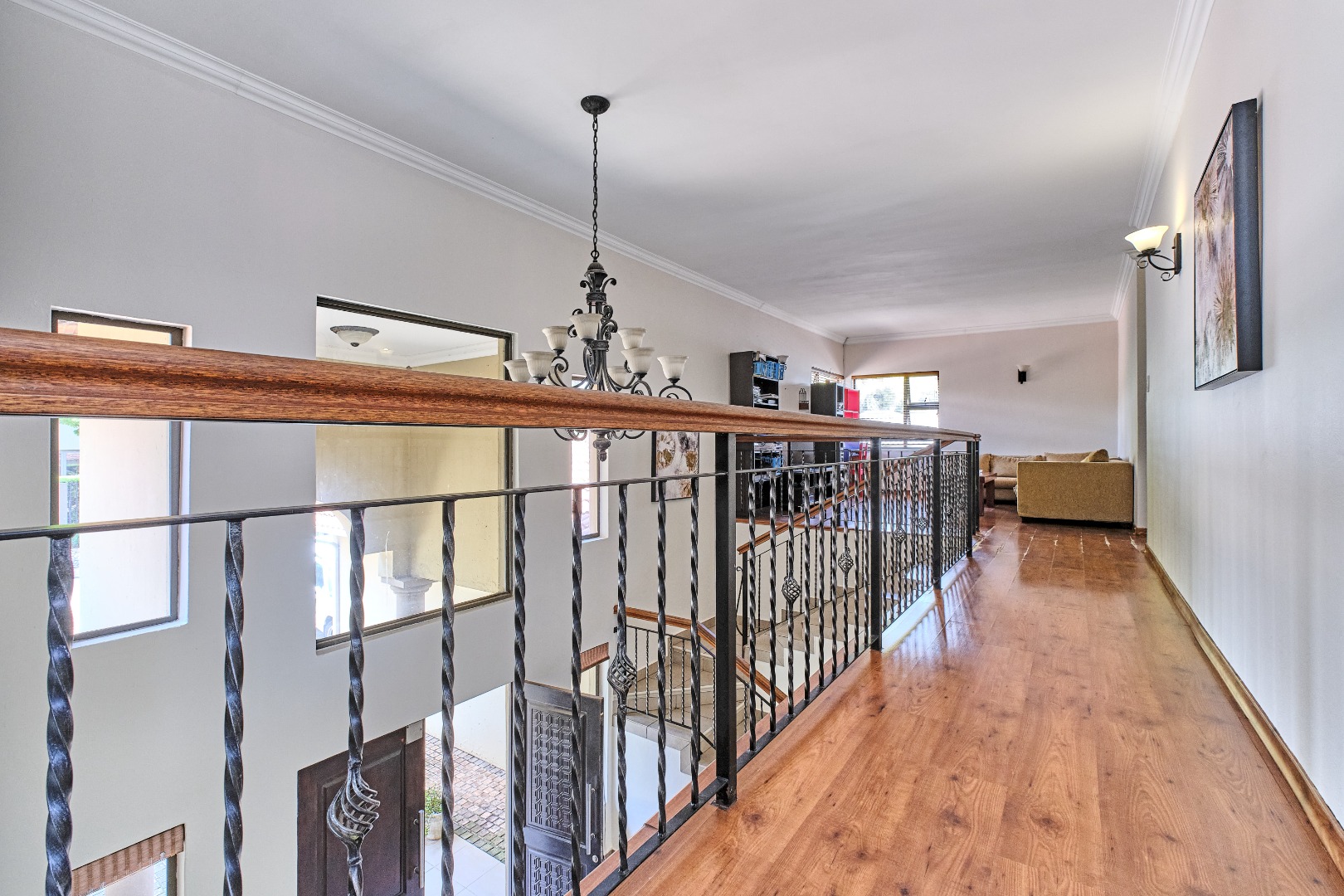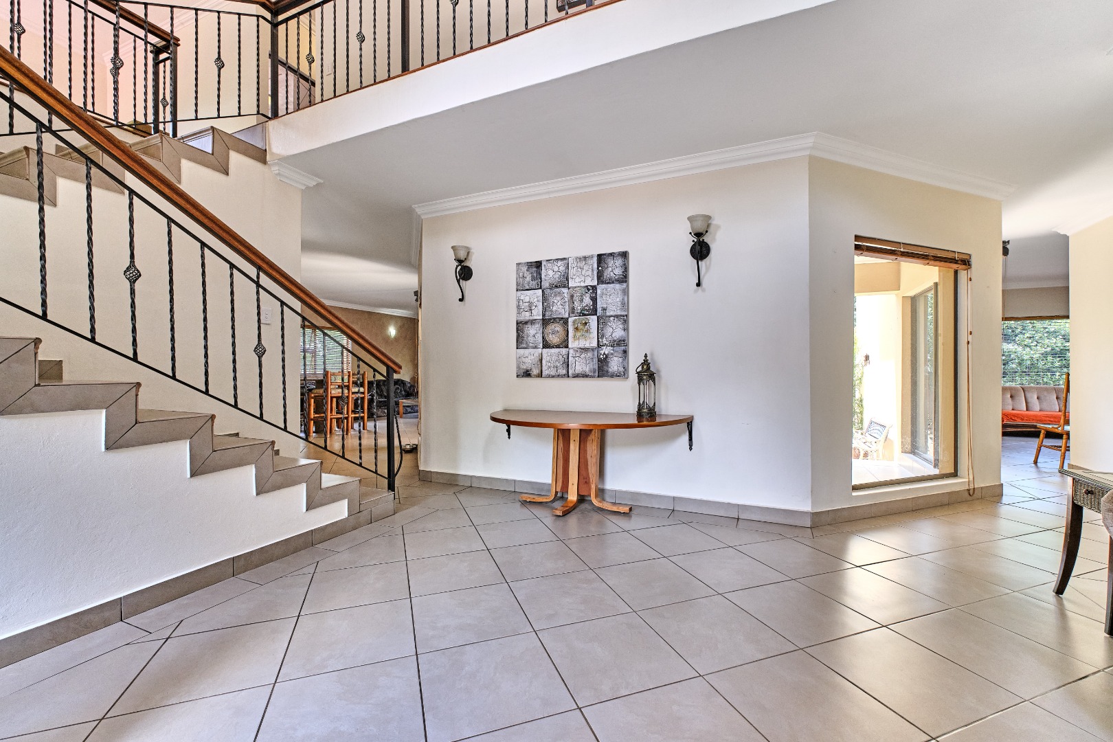 Discover this inviting family residence situated within a prestigious golf estate in Ruimsig, Roodepoort. The home welcomes you with a spacious entrance featuring high ceilings and elegant dark wooden double doors, setting a grand tone. Inside, the layout offers two distinct lounges downstairs, a pyjama lounge upstairs, and a dedicated dining room, providing ample space for both relaxation and entertaining. The heart of the home is a well-appointed kitchen, boasting extensive wooden cabinetry, durable granite countertops, and tiled flooring. Equipped with a built-in oven, hob, and extractor fan, it benefits from abundant natural light and seamlessly connects to an open-plan living area, complete with a practical breakfast bar.