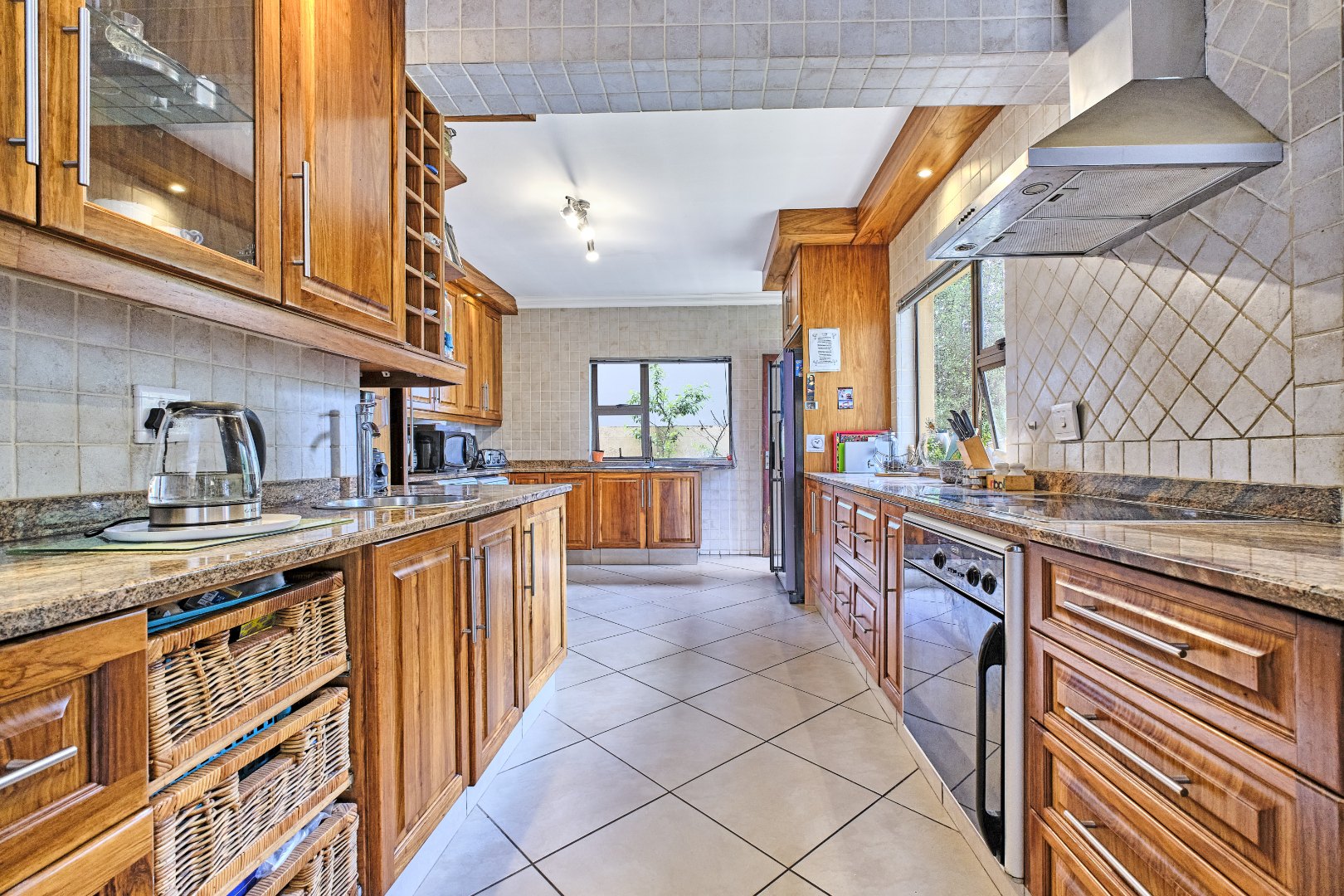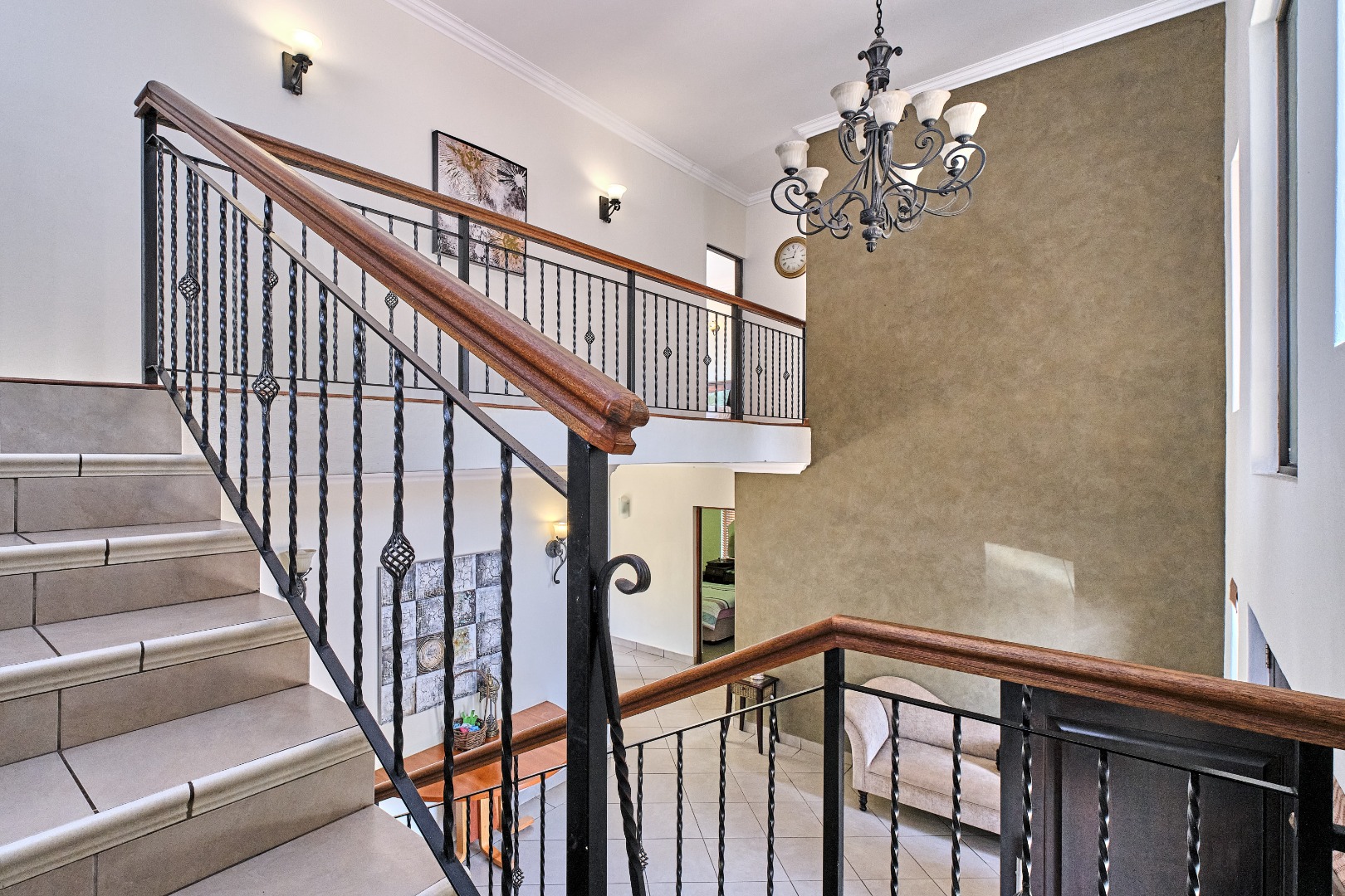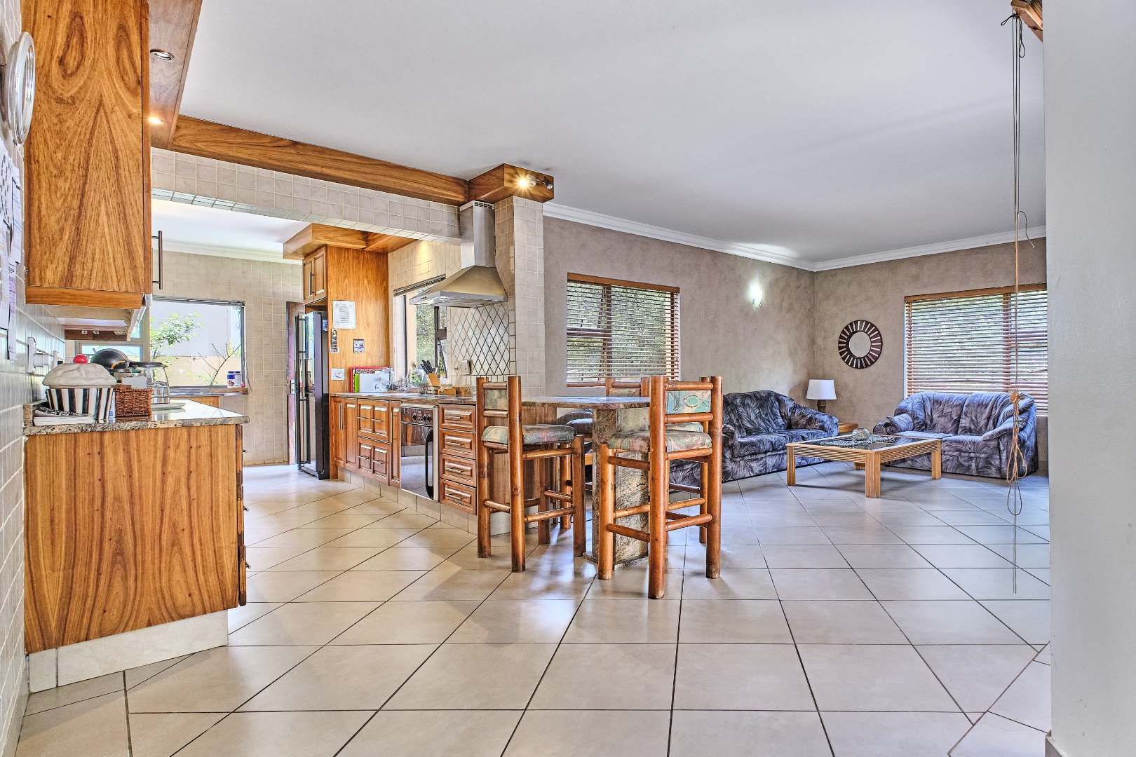 Discover this inviting family residence situated within a prestigious golf estate in Ruimsig, Roodepoort. The home welcomes you with a spacious entrance featuring high ceilings and elegant dark wooden double doors, setting a grand tone. Inside, the layout offers two distinct lounges downstairs, a pyjama lounge upstairs, and a dedicated dining room, providing ample space for both relaxation and entertaining. The heart of the home is a well-appointed kitchen, boasting extensive wooden cabinetry, durable granite countertops, and tiled flooring. Equipped with a built-in oven, hob, and extractor fan, it benefits from abundant natural light and seamlessly connects to an open-plan living area, complete with a practical breakfast bar.