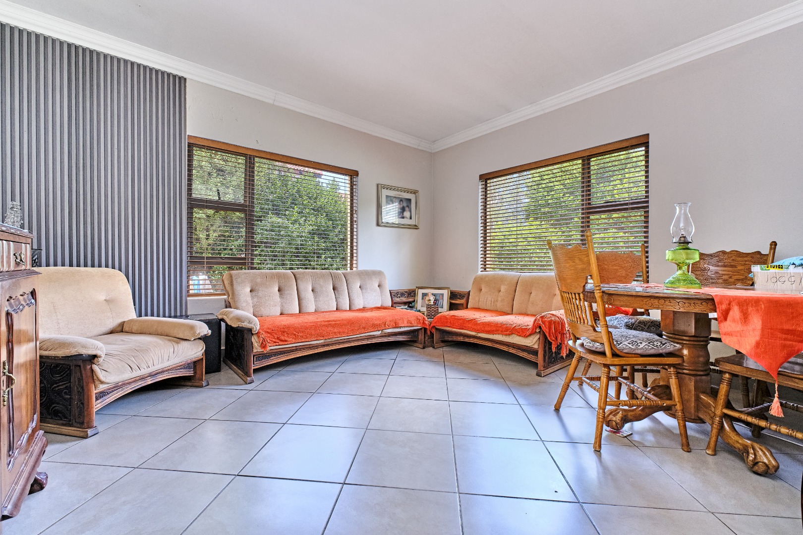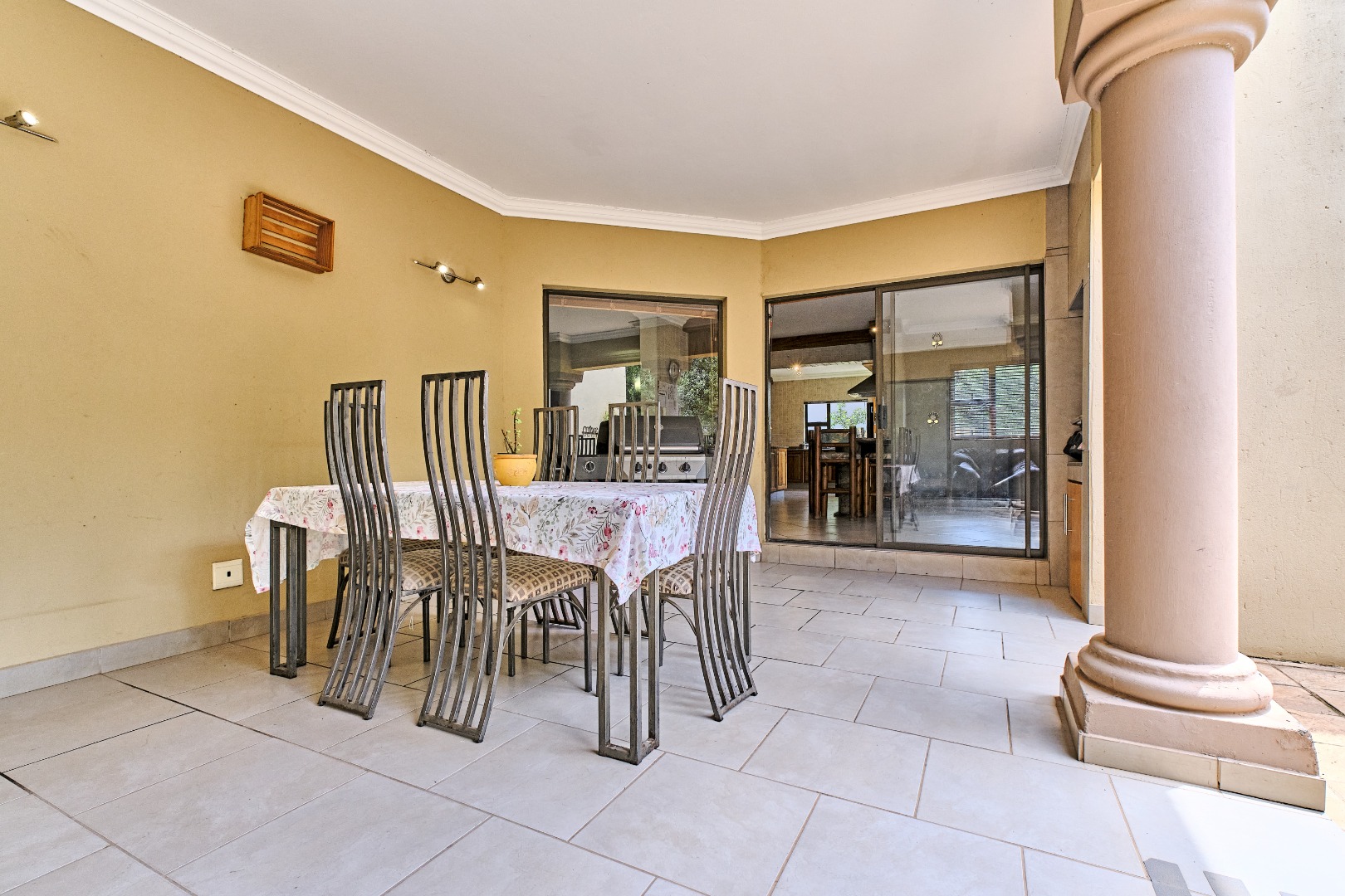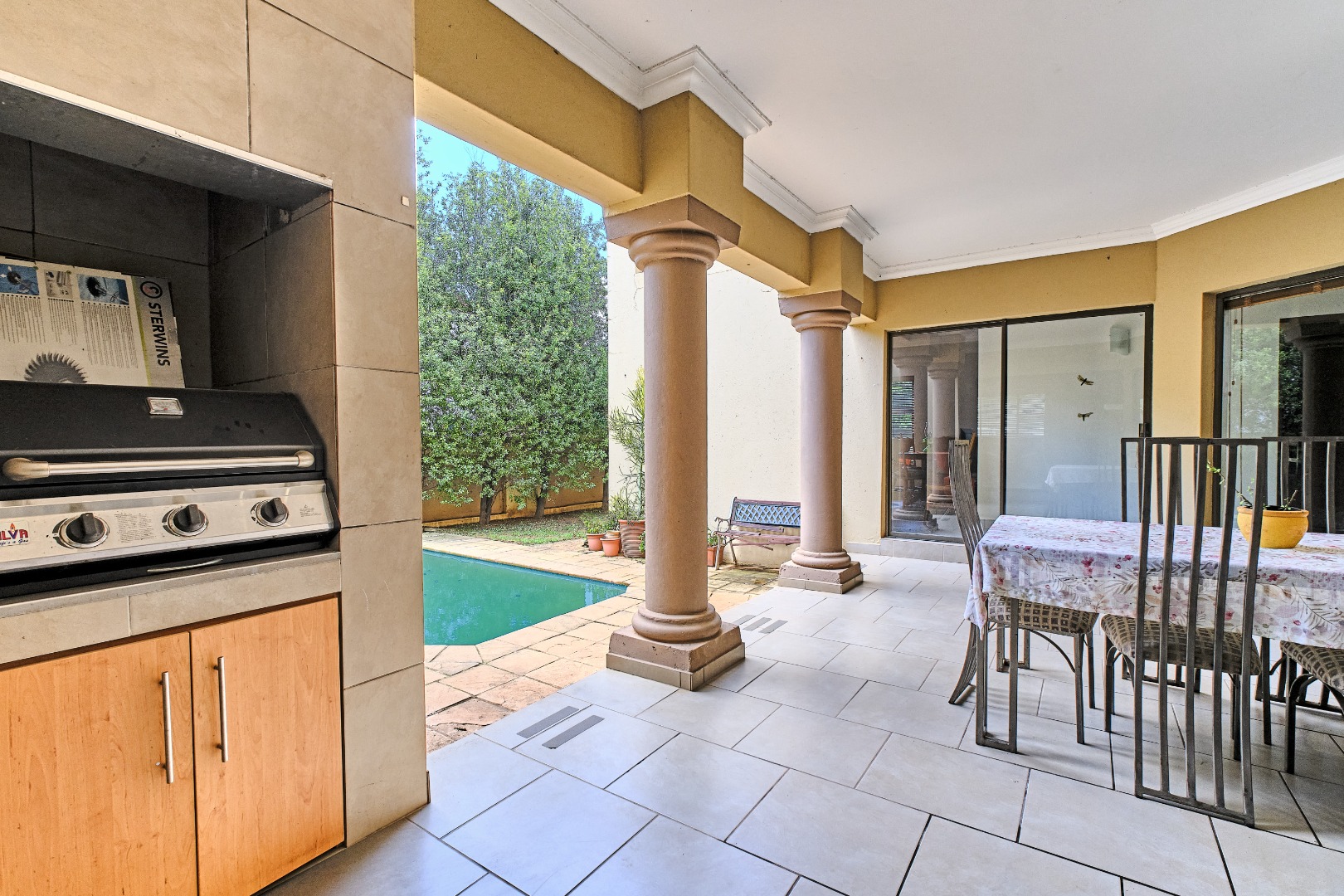 Set on an expansive 858 sqm erf, the property extends its appeal outdoors with a refreshing swimming pool, a welcoming covered patio, with a built-in gas braai, perfect for outdoor entertaining. The established garden provides a serene backdrop. Practical amenities include three garages and four additional parking spaces, catering to multiple vehicles. For added convenience, staff quarters are also available. Residing within a secure estate, with access to the golf course for members, residents benefit from 24-hour security and controlled access, ensuring peace of mind. Fibre connectivity is also available.