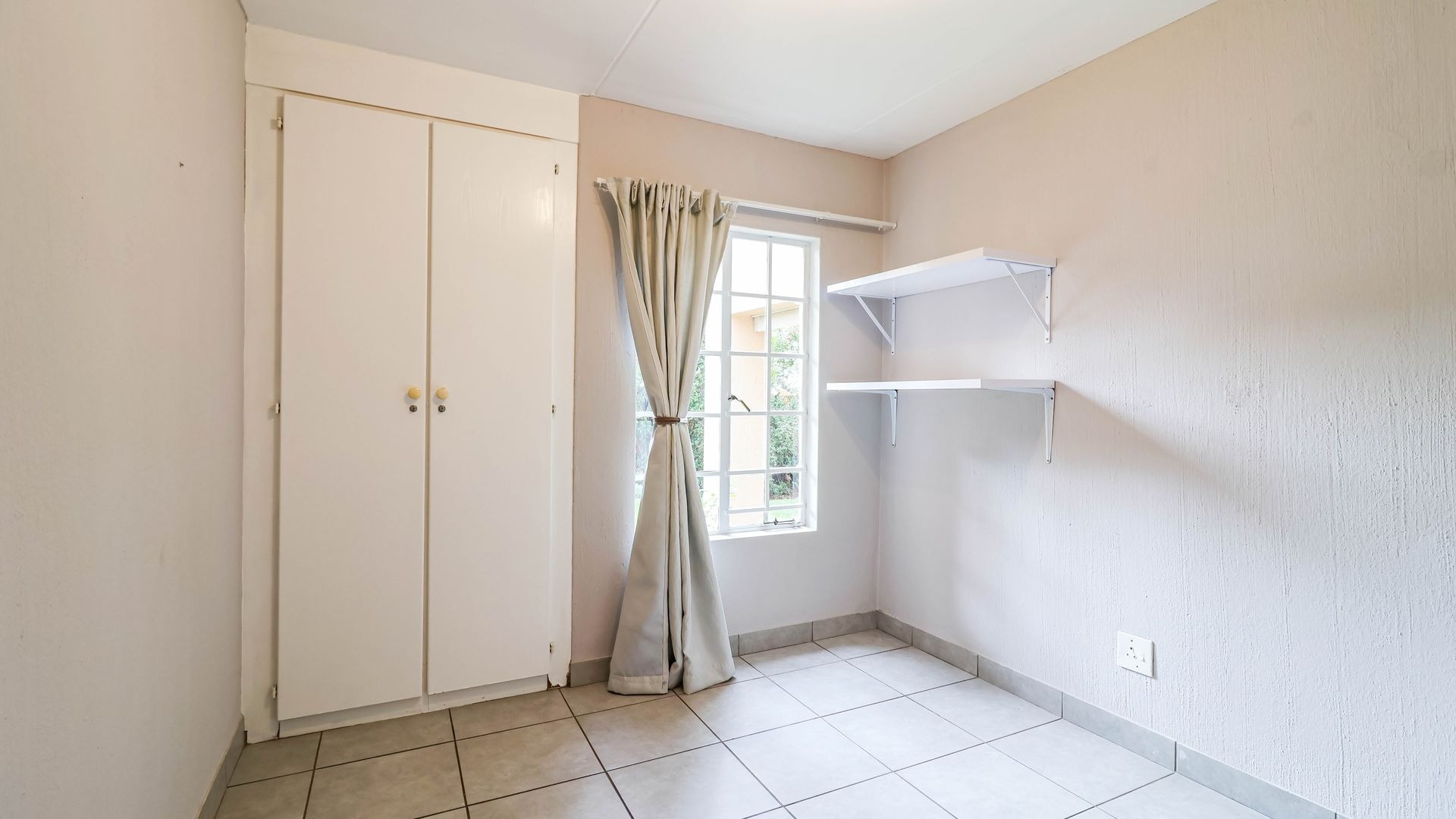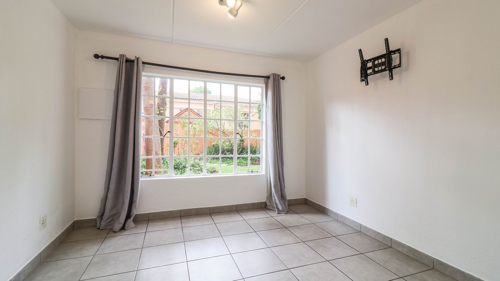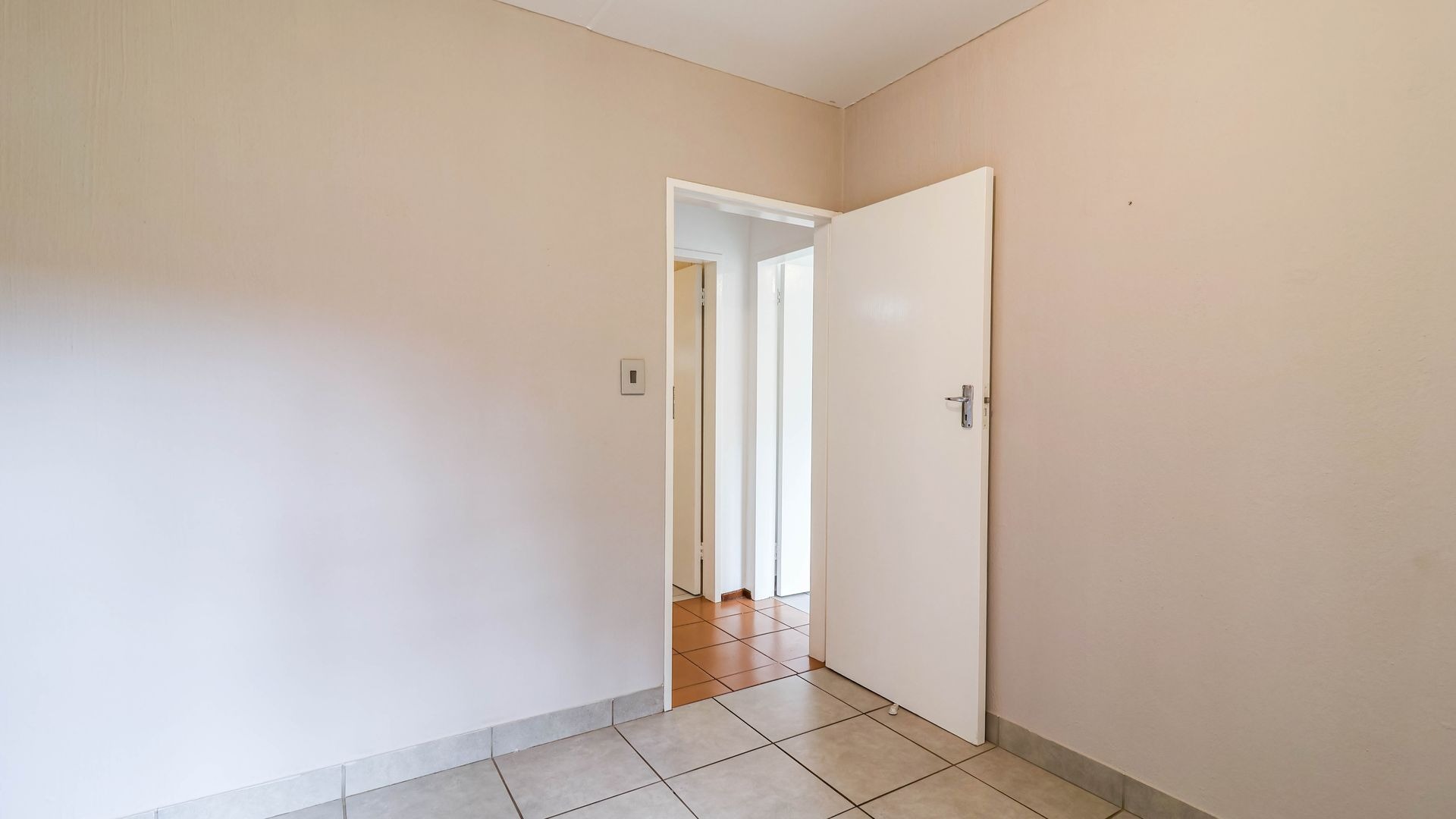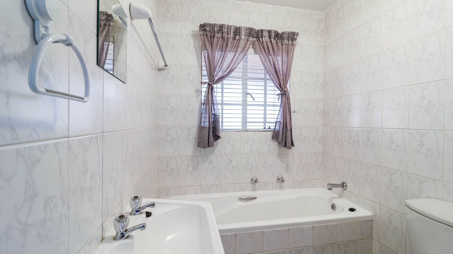 Entrance with security gate. Tiled lounge/dining area with glass door to covered tiled patio with 2 dropdown blinds . Spacious kitchen on. Space for a fridge, 2 appliances and microwave, double sink, under-counter oven, solid hob. Lots of cupboards. Large main bedroom (tiled) 7 BIC, TV bracket. MES with loo, basin and shower. 2nd bedrooom (tiled) 2 BIC and shelving. 2nd bathroom, with loo, vanity and bath. Linen cupboard. Courtyard with washline. Double electric fencing on perimeter. Single carport. Lots of visitors parking. Pool, lapa in complex. Pet friendly for dogs and cats.