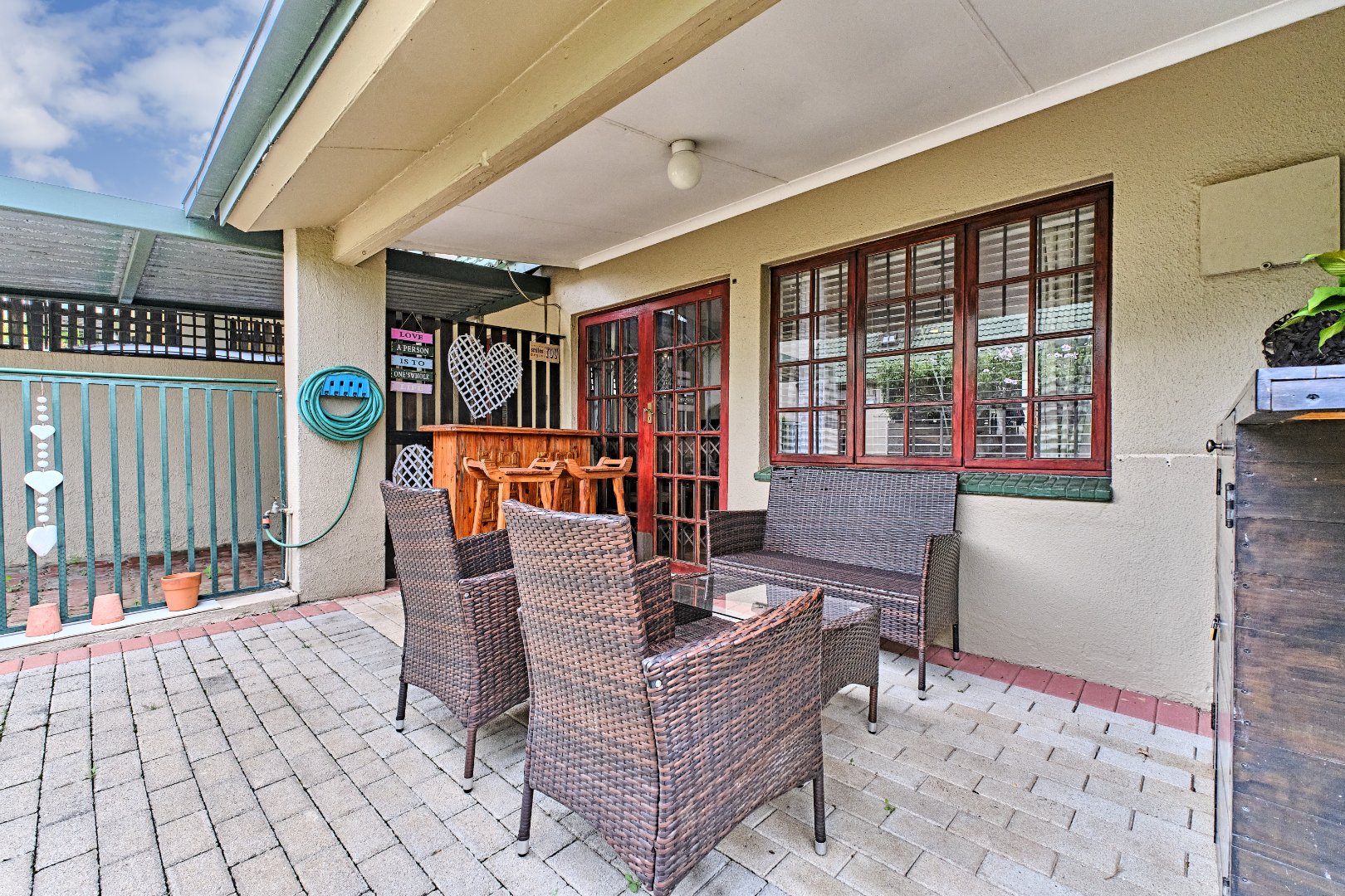 Step outside to a charming covered patio, perfect for outdoor relaxation and entertaining, which extends to a private garden area. The complex also boasts a communal swimming pool, ideal for leisure and recreation. Parking is well-catered for with multiple spaces. This property is pet-friendly (except cats), allowing for a complete family lifestyle.