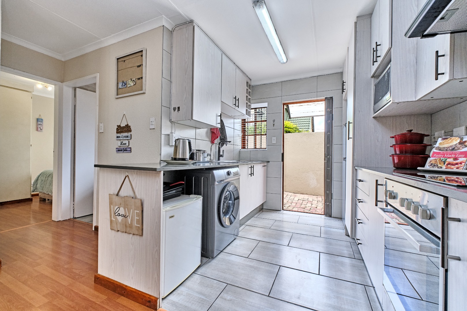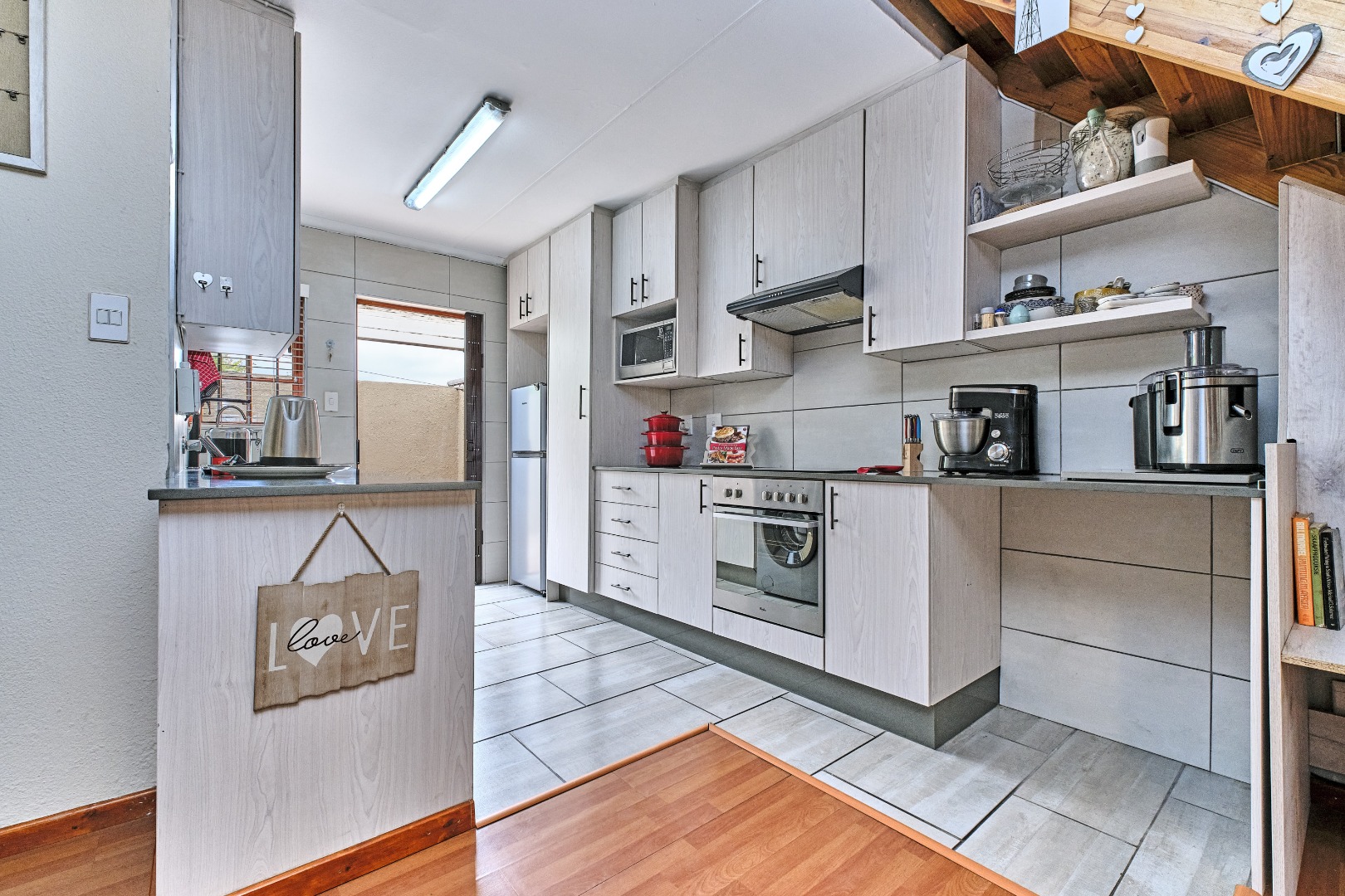 Discover this inviting 2-bedroom, 2-bathroom residence nestled within a secure gated community in Weltevreden Park, Roodepoort. Spanning 78 square metres, this home offers a thoughtfully designed open-plan layout that seamlessly integrates the living, dining, and kitchen areas, creating a spacious and functional environment. The modern kitchen is a highlight, featuring light-toned cabinetry, integrated appliances including an oven, hob, and microwave, and a practical breakfast bar. Warm laminate flooring extends throughout the main living spaces, complemented by natural light from well-placed windows and doors.