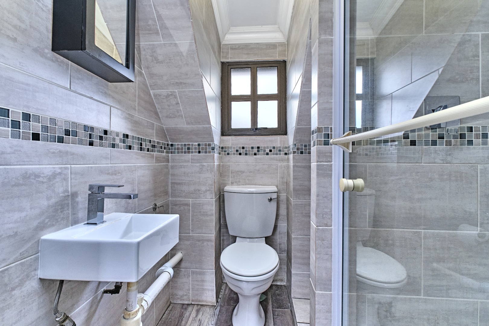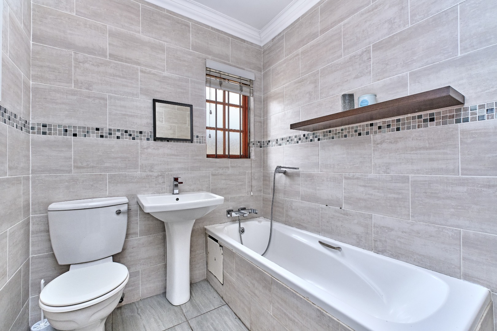 The two comfortable bedrooms provide private retreats, with the main bedroom benefiting from an en-suite bathroom. Both bathrooms are appointed with modern grey tiling, mosaic accent bands, and include a bathtub with a handheld shower attachment, ensuring both style and convenience. Built-in wardrobes offer ample storage, maintaining a neat and organised living space.