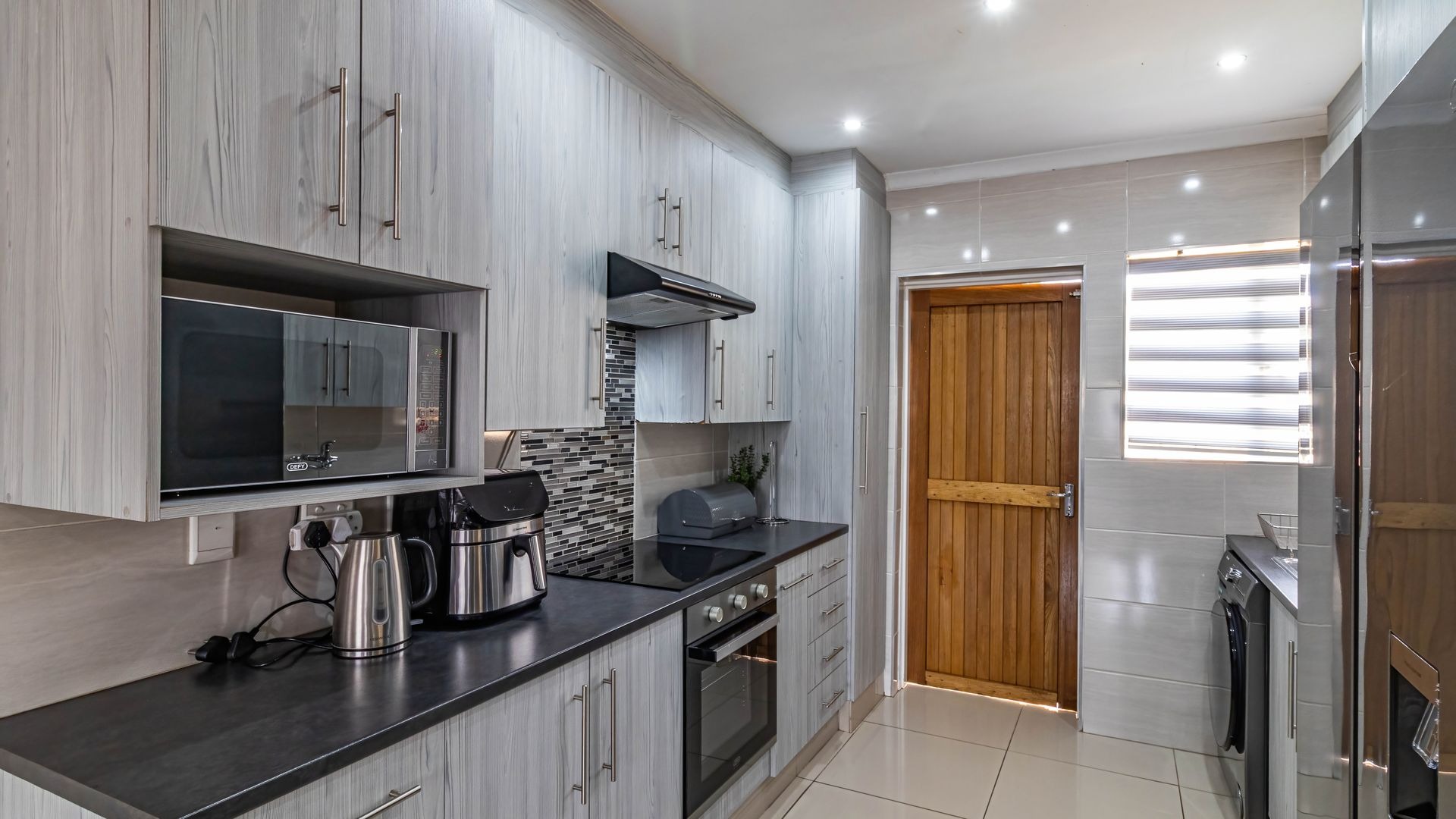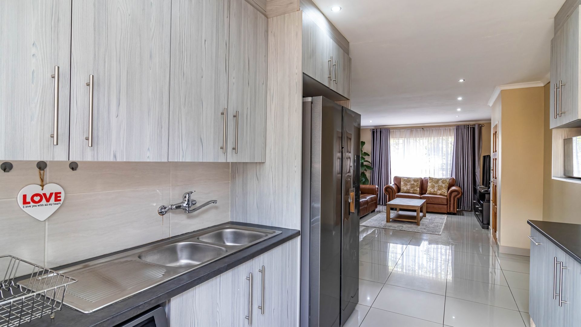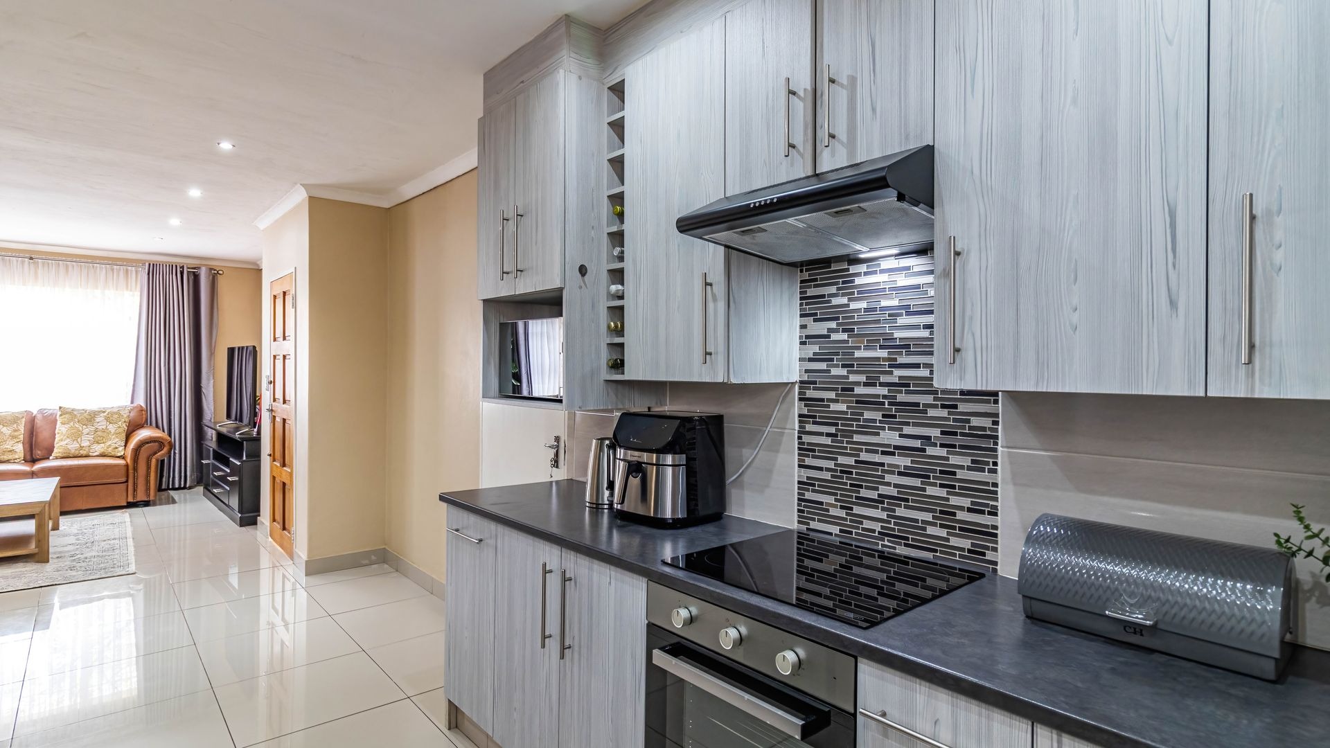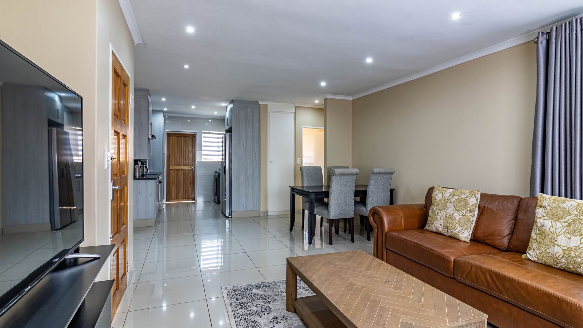 Step inside to discover a modern, recently renovated interior designed with style and functionality in mind. The open plan layout seamlessly combines a well-appointed kitchen, dining area, and lounge, creating a bright and airy living space perfect for everyday life or entertaining. The kitchen features ample cupboard and counter space, thoughtfully designed for convenience, and has room for a double fridge, making storage and meal prep effortless. Downlights throughout the living areas add a warm and contemporary ambiance.