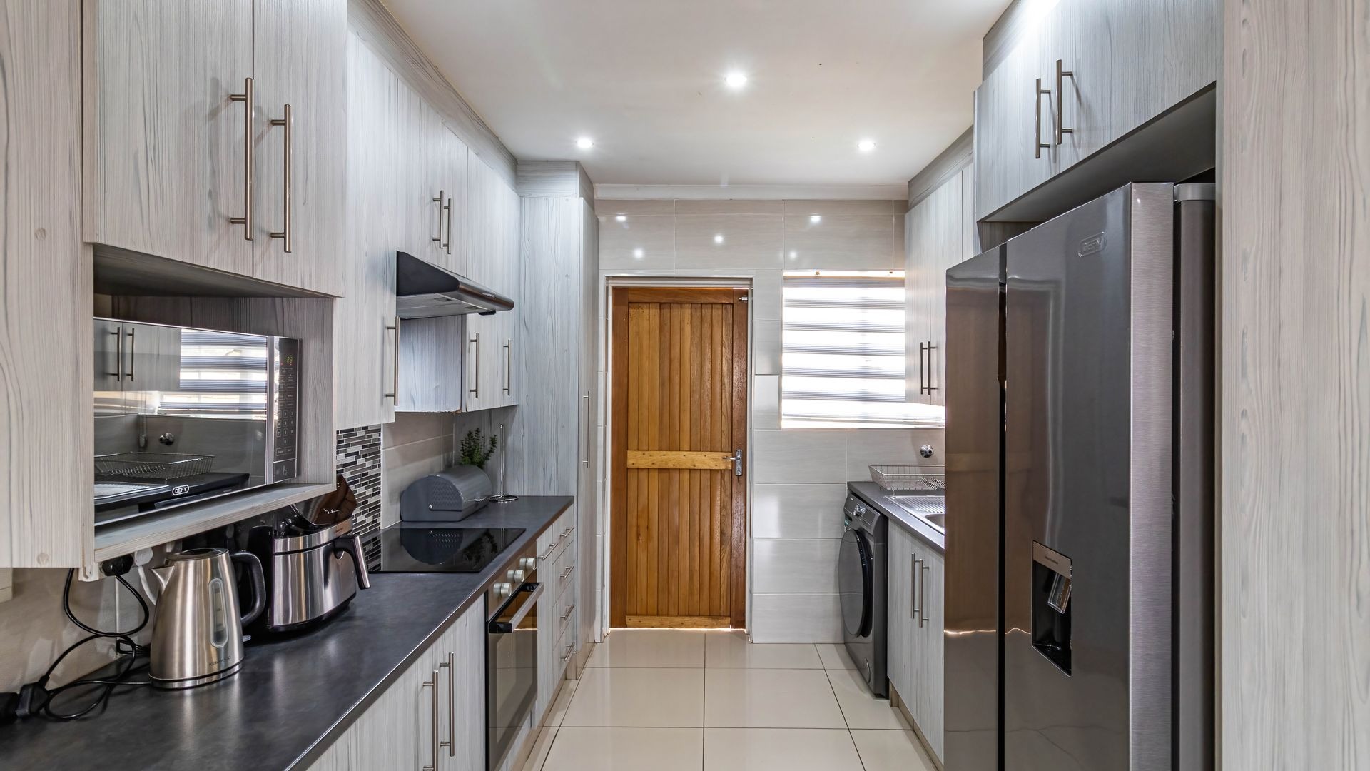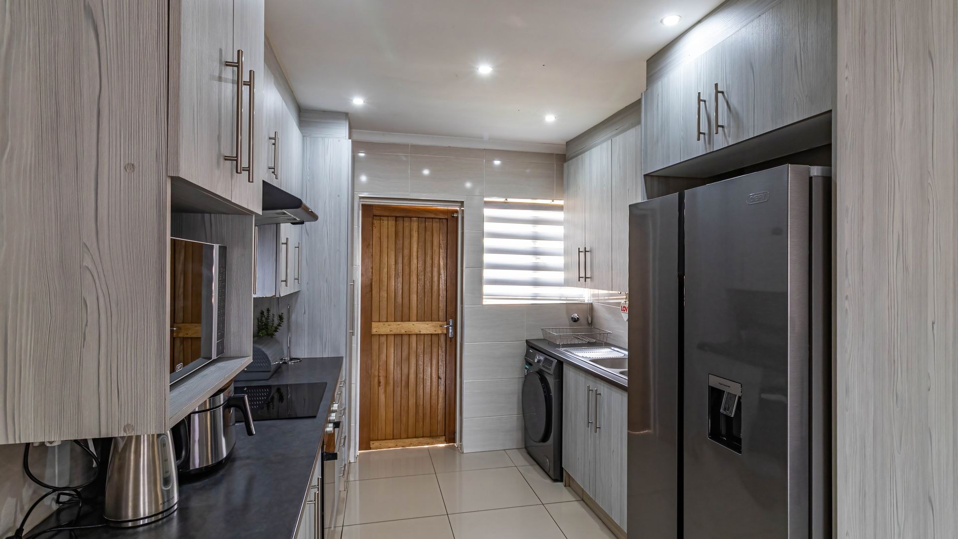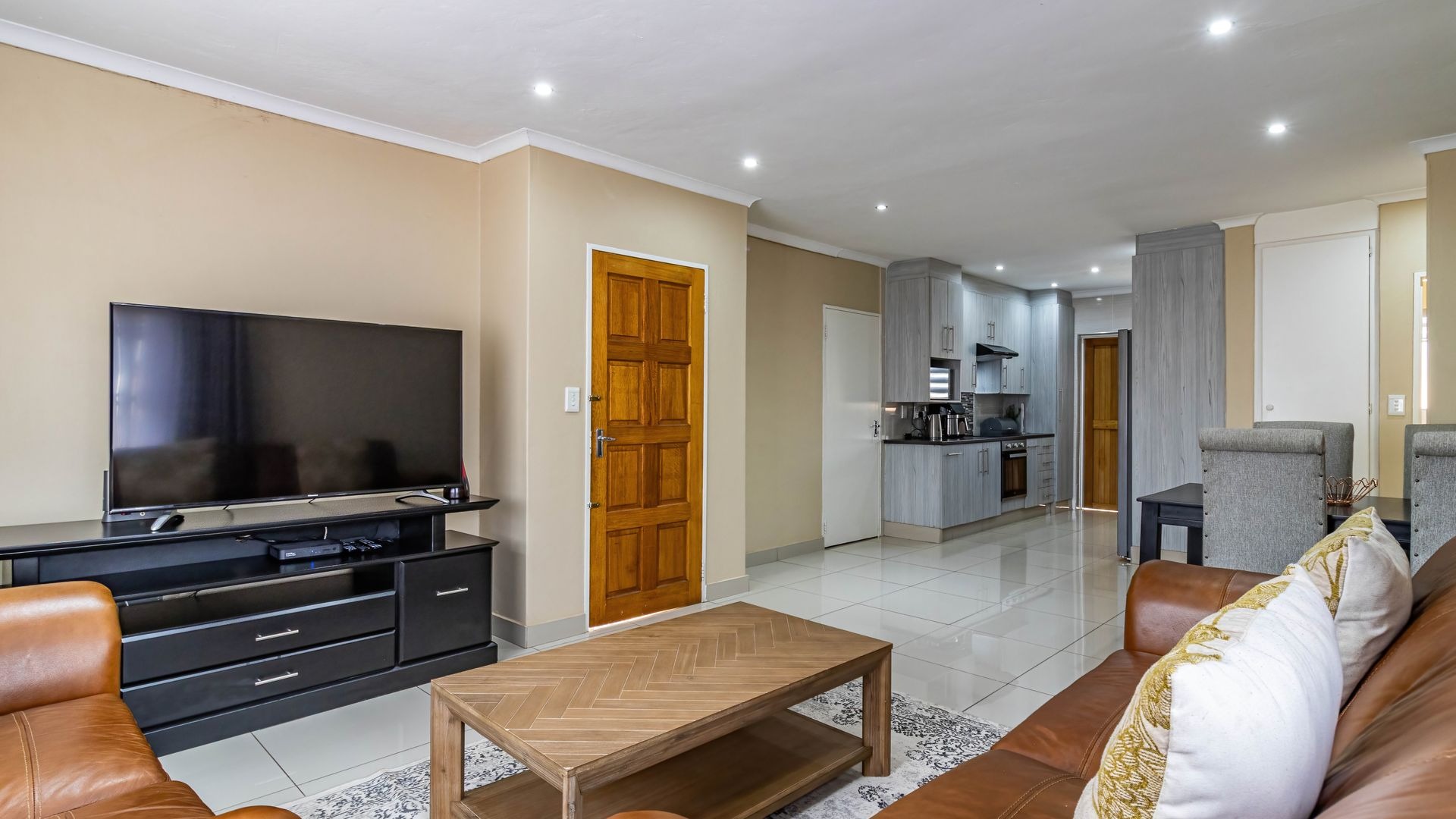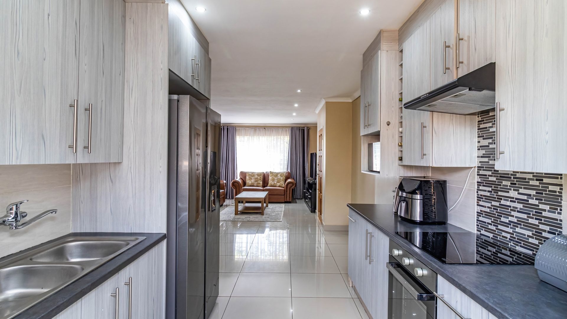 Step inside to discover a modern, recently renovated interior designed with style and functionality in mind. The open plan layout seamlessly combines a well-appointed kitchen, dining area, and lounge, creating a bright and airy living space perfect for everyday life or entertaining. The kitchen features ample cupboard and counter space, thoughtfully designed for convenience, and has room for a double fridge, making storage and meal prep effortless. Downlights throughout the living areas add a warm and contemporary ambiance.