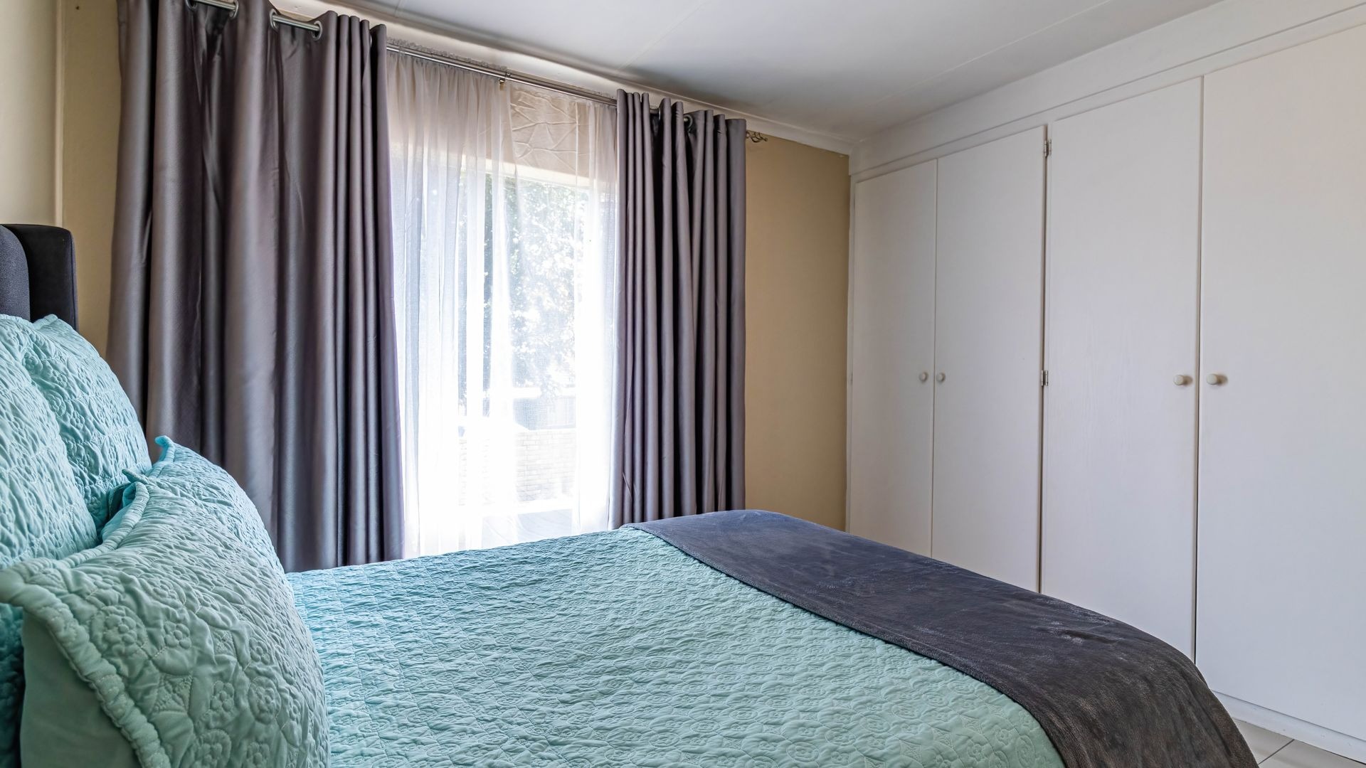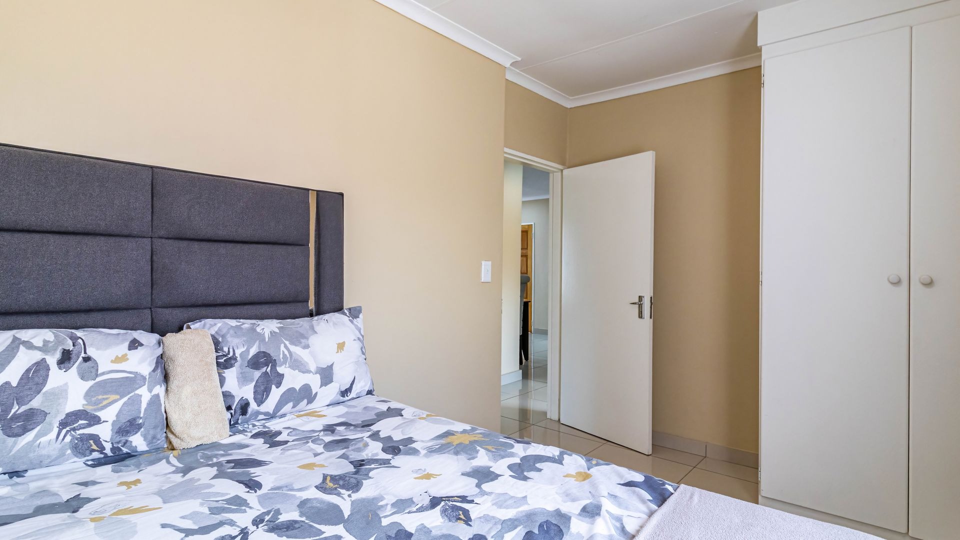 The home offers two generously sized bedrooms, each fitted with built-in cupboards to maximize storage. The main bedroom includes a private en suite bathroom with a sleek, modern shower, providing a relaxing retreat at the end of the day. The second bedroom is perfect for children, guests, or a home office, offering flexibility to suit your lifestyle. Additional storage is available in the garage with built-in cupboards, making organization simple and practical.