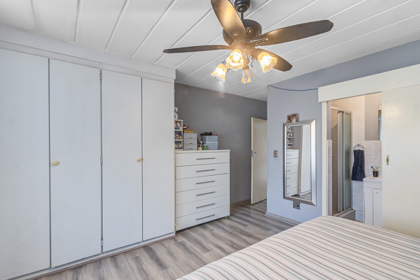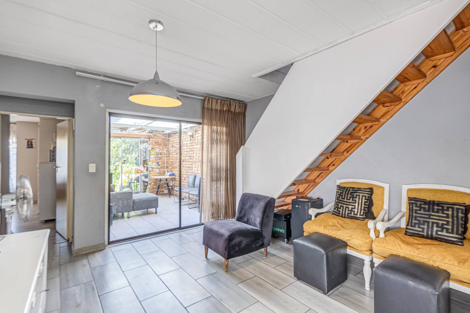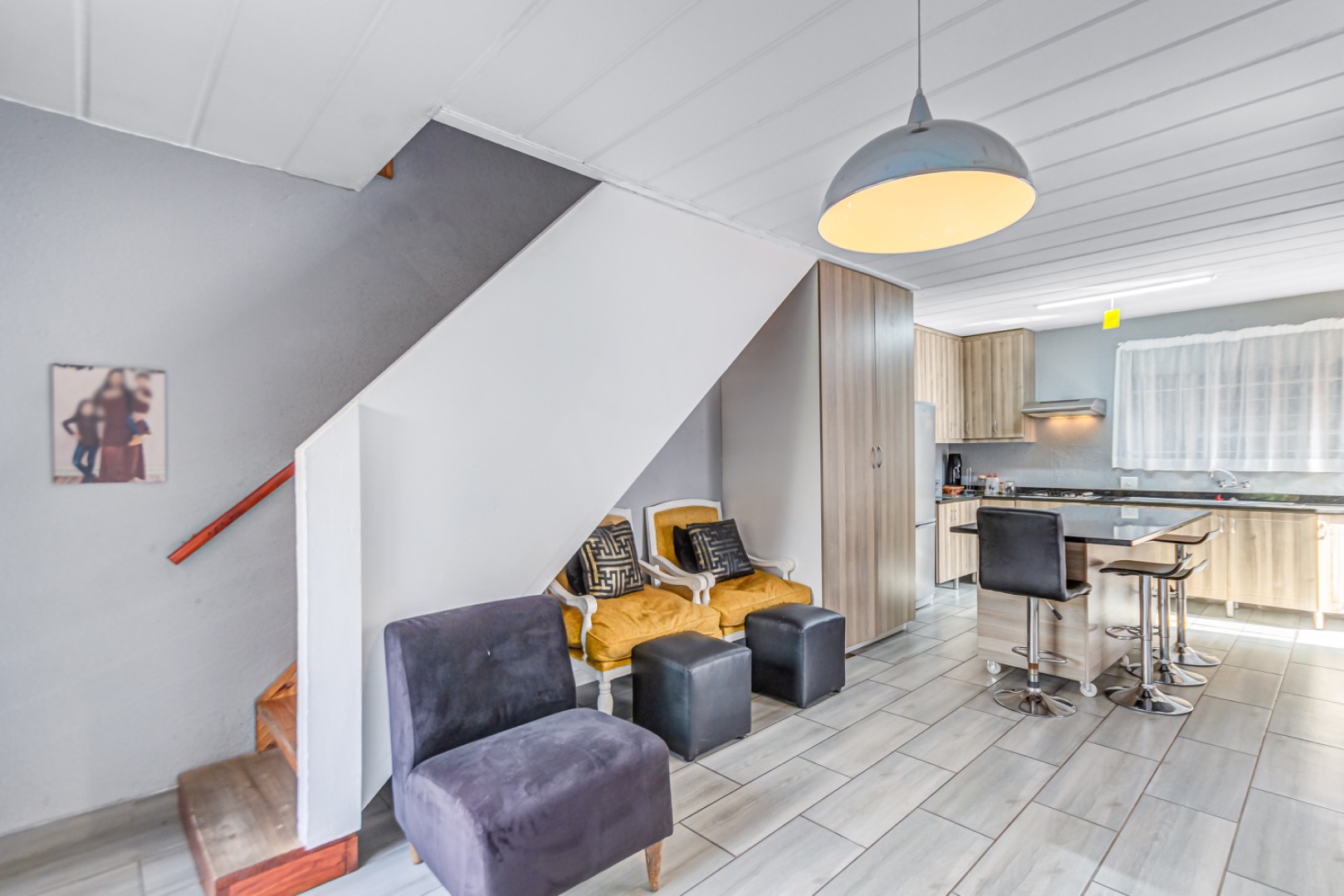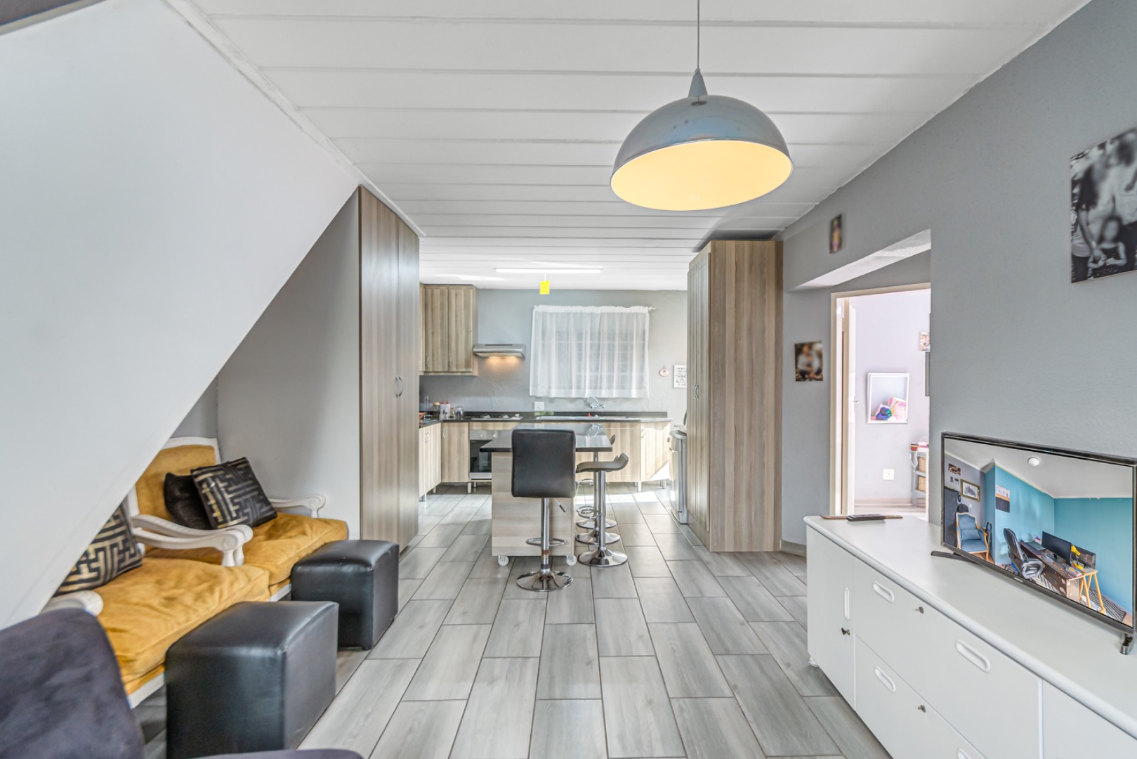 The downstairs living area includes three bedrooms and two bathrooms, with the main bedroom boasting an en-suite and the second being a full family bathroom. The lounge flows effortlessly into a sunny additional room with a louvered roof that, when opened, lets in an abundance of natural light. From here, sliding doors lead to a covered braai area and an expansive garden with a charming lemon tree, creating the perfect indoor-outdoor lifestyle.
