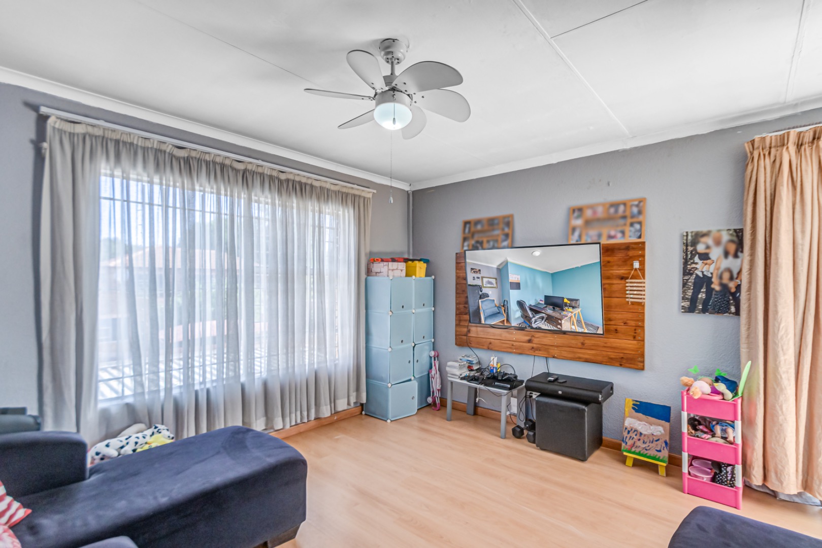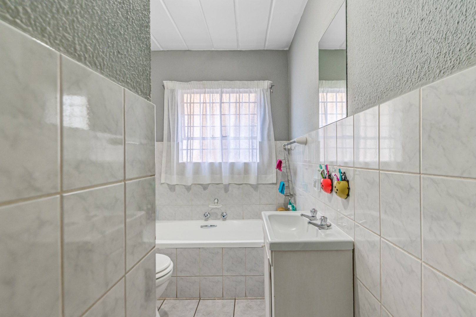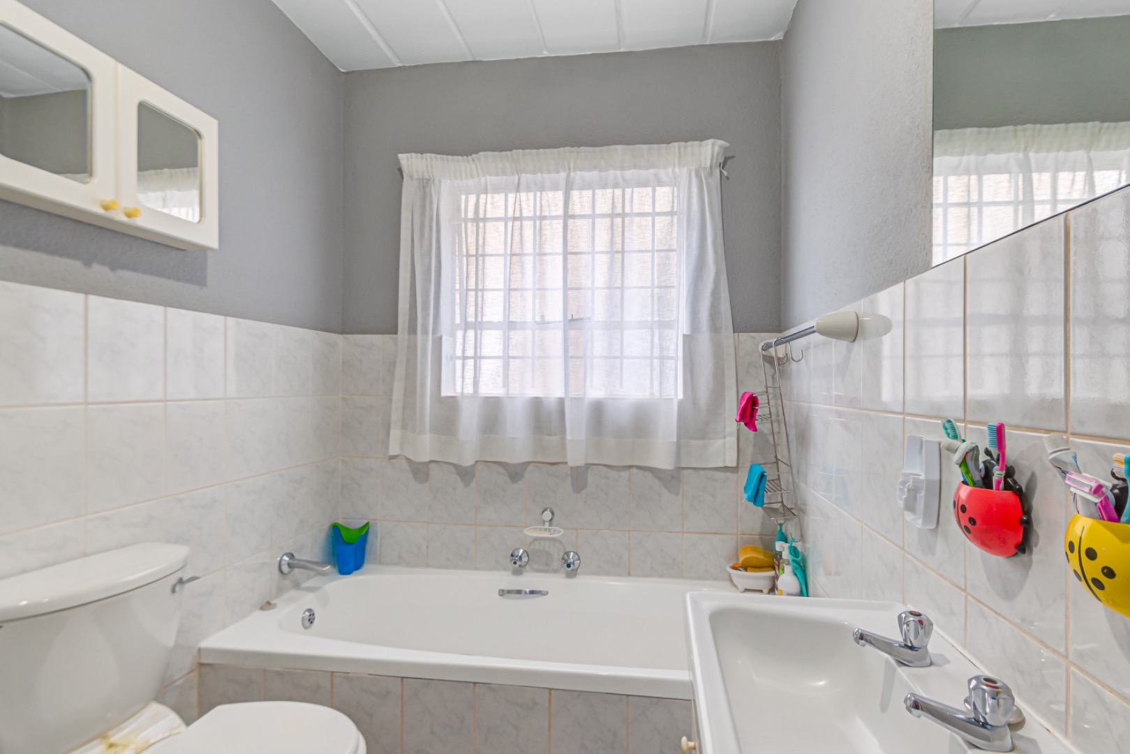 The downstairs living area includes three bedrooms and two bathrooms, with the main bedroom boasting an en-suite and the second being a full family bathroom. The lounge flows effortlessly into a sunny additional room with a louvered roof that, when opened, lets in an abundance of natural light. From here, sliding doors lead to a covered braai area and an expansive garden with a charming lemon tree, creating the perfect indoor-outdoor lifestyle.