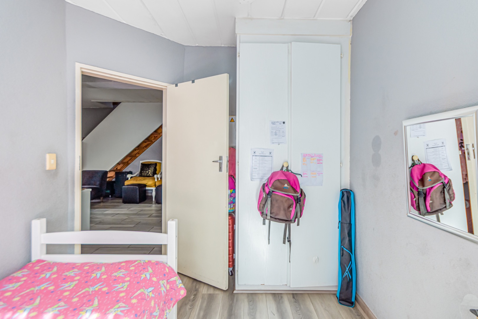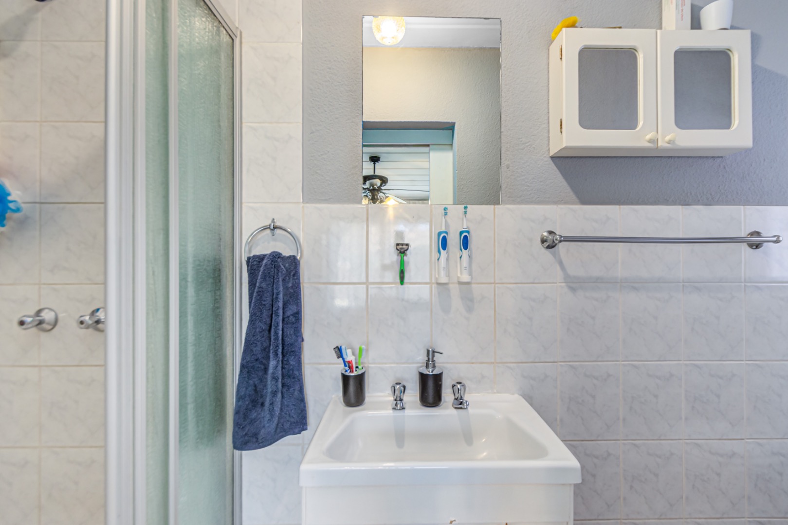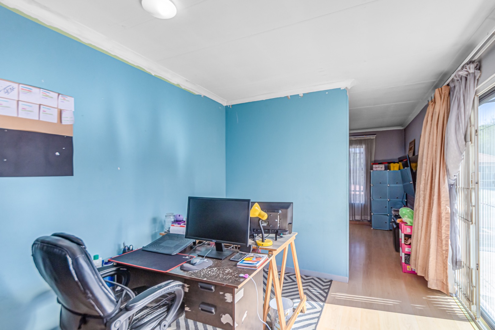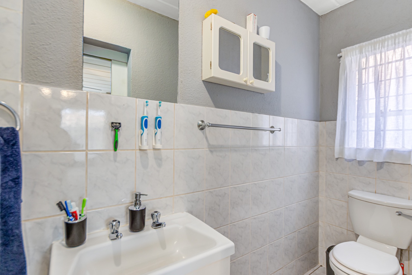 The downstairs living area includes three bedrooms and two bathrooms, with the main bedroom boasting an en-suite and the second being a full family bathroom. The lounge flows effortlessly into a sunny additional room with a louvered roof that, when opened, lets in an abundance of natural light. From here, sliding doors lead to a covered braai area and an expansive garden with a charming lemon tree, creating the perfect indoor-outdoor lifestyle.
