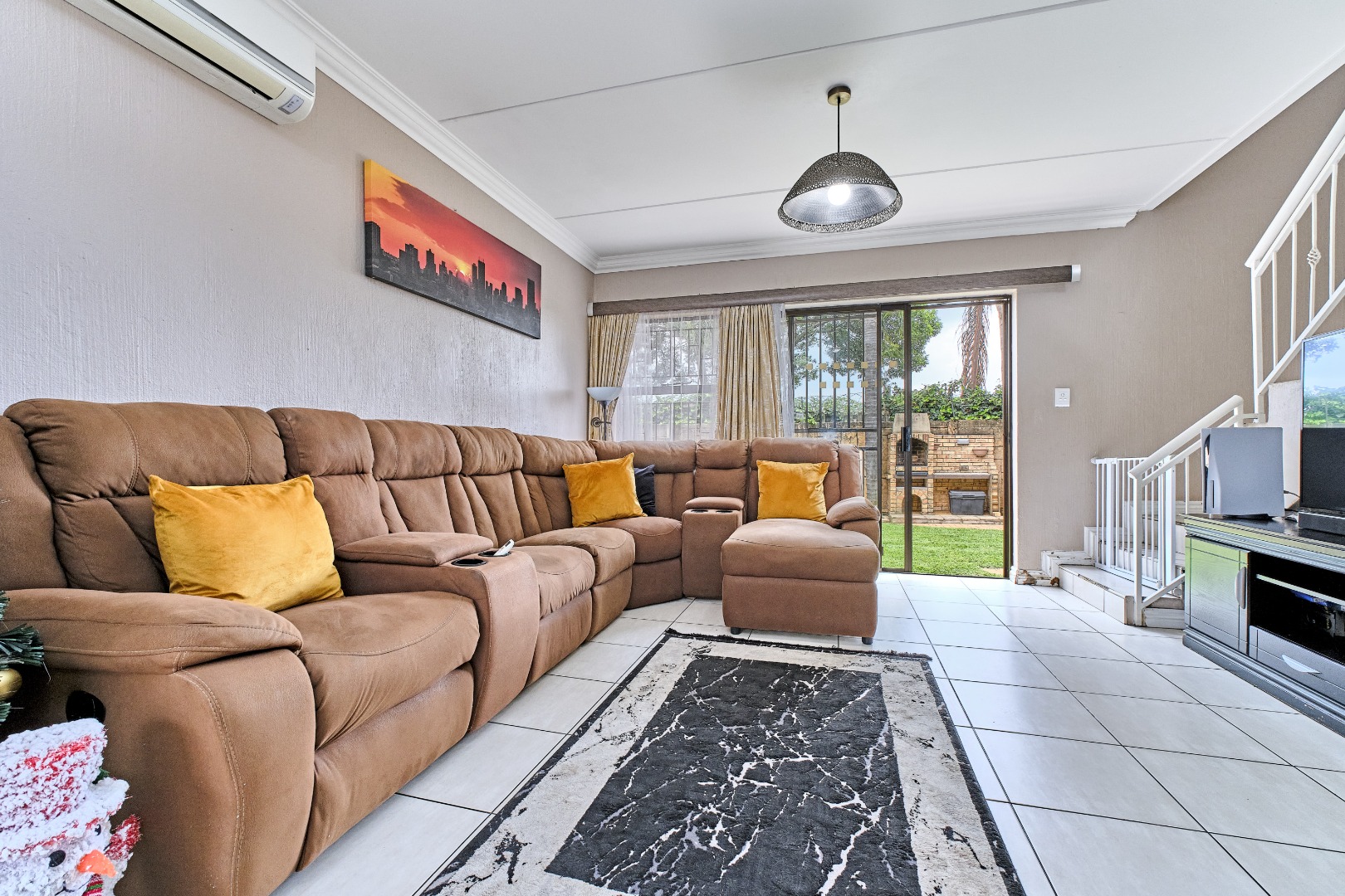 The interior boasts an open-plan living area, seamlessly connecting the lounge and dining spaces, both featuring easy-to-maintain tiled flooring. Large sliding doors enhance the flow, providing direct access to the outdoor entertainment area. The kitchen is well-appointed with modern built-in appliances, ample cabinetry, and a convenient breakfast bar, perfect for casual dining. Air conditioning units are present in key living areas, ensuring comfort throughout the seasons.