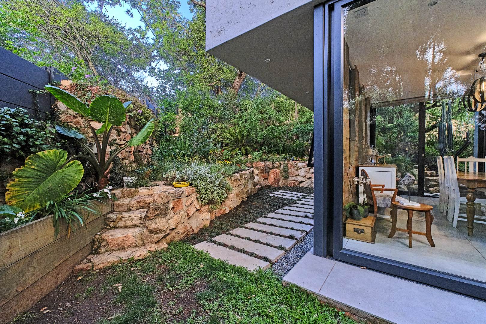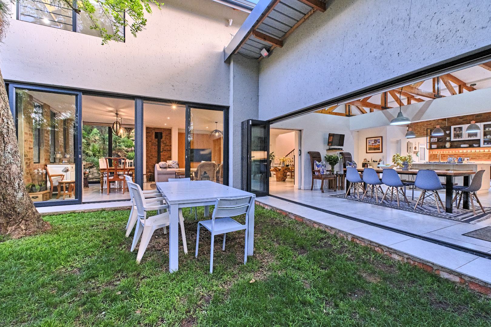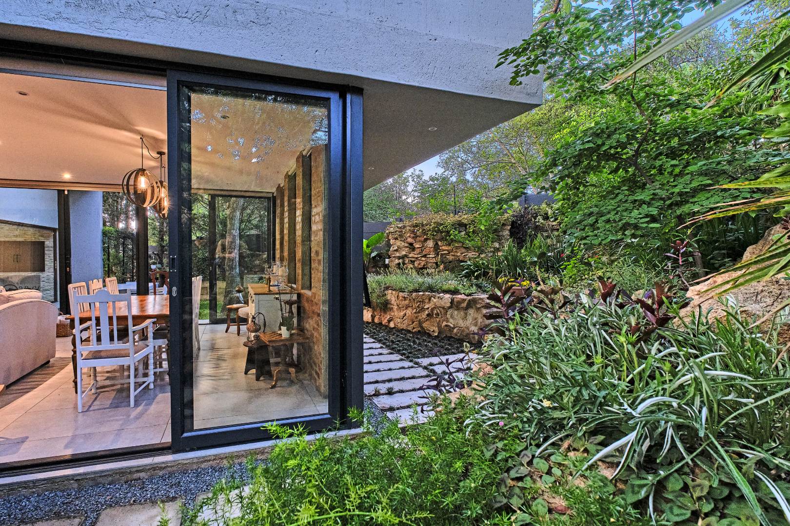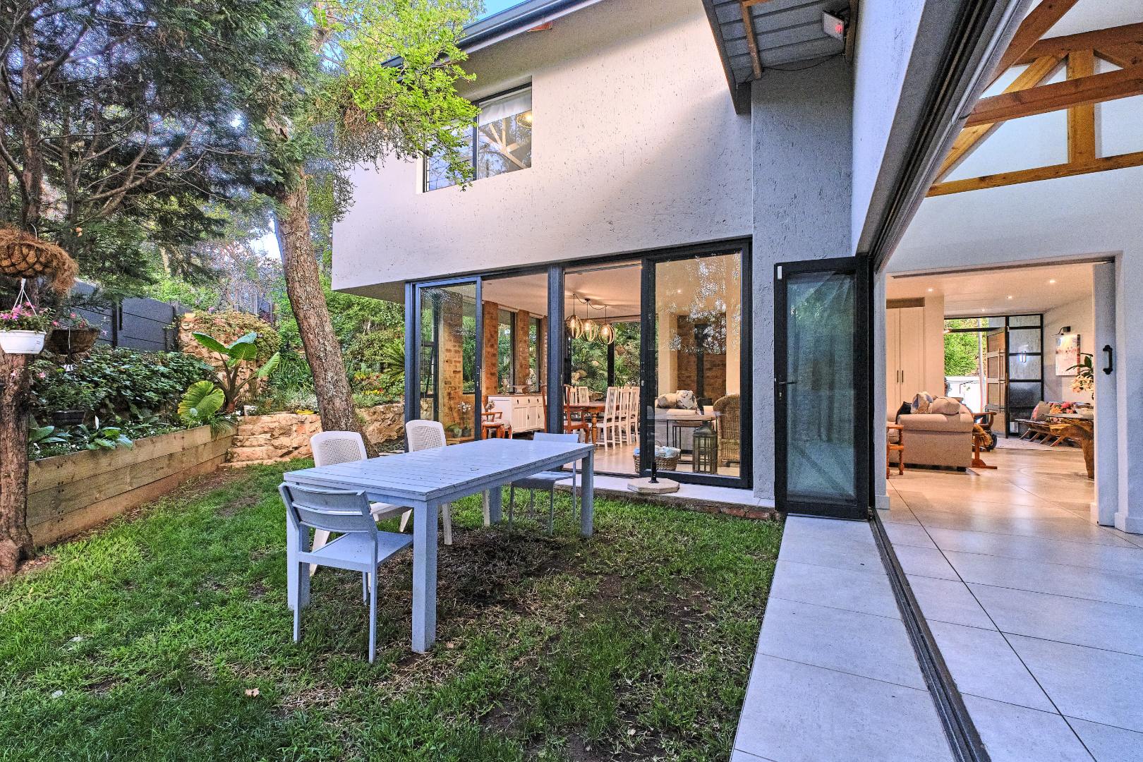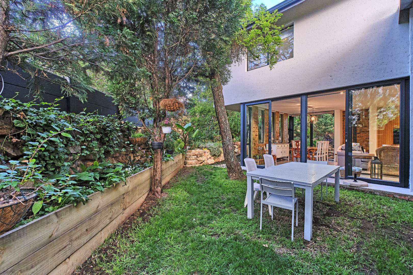 Stacking glass doors open out to a serene, storybook garden where lush greenery and tranquil surroundings create the perfect outdoor retreat.