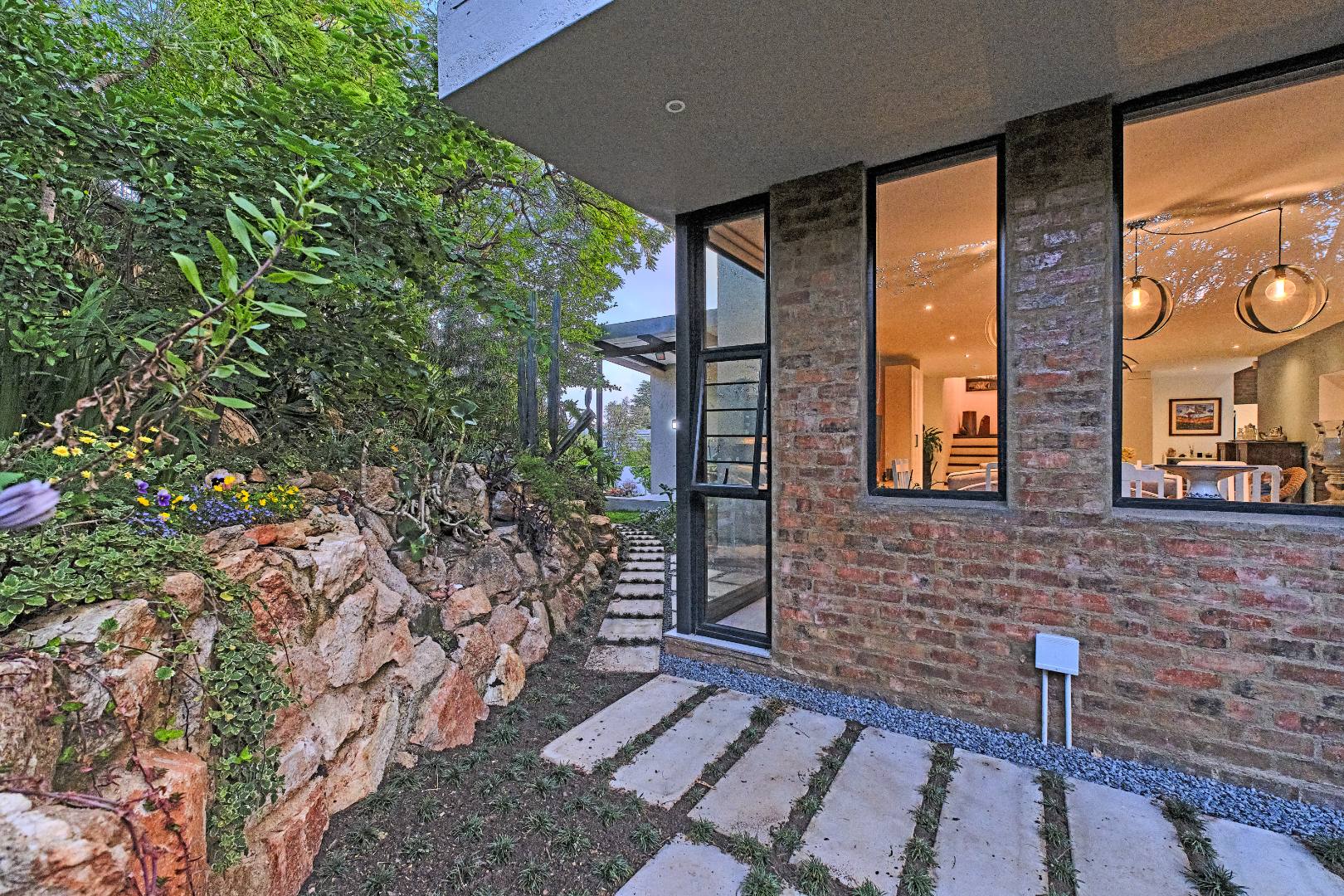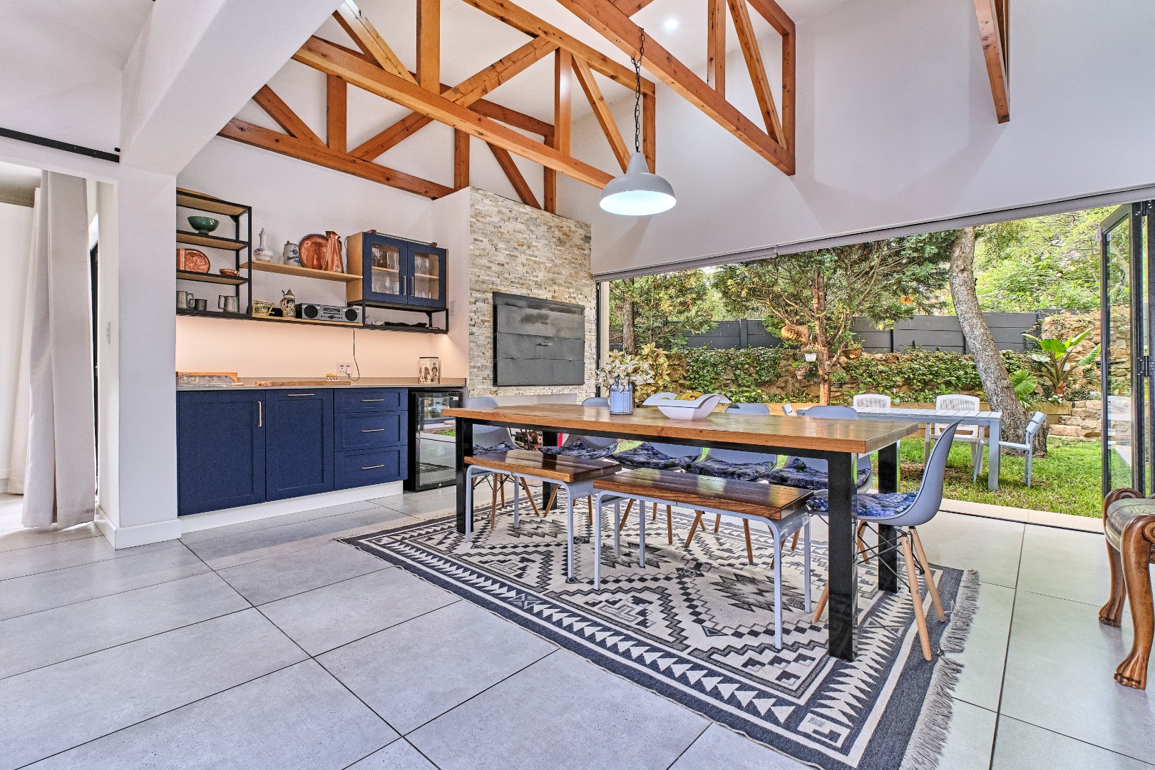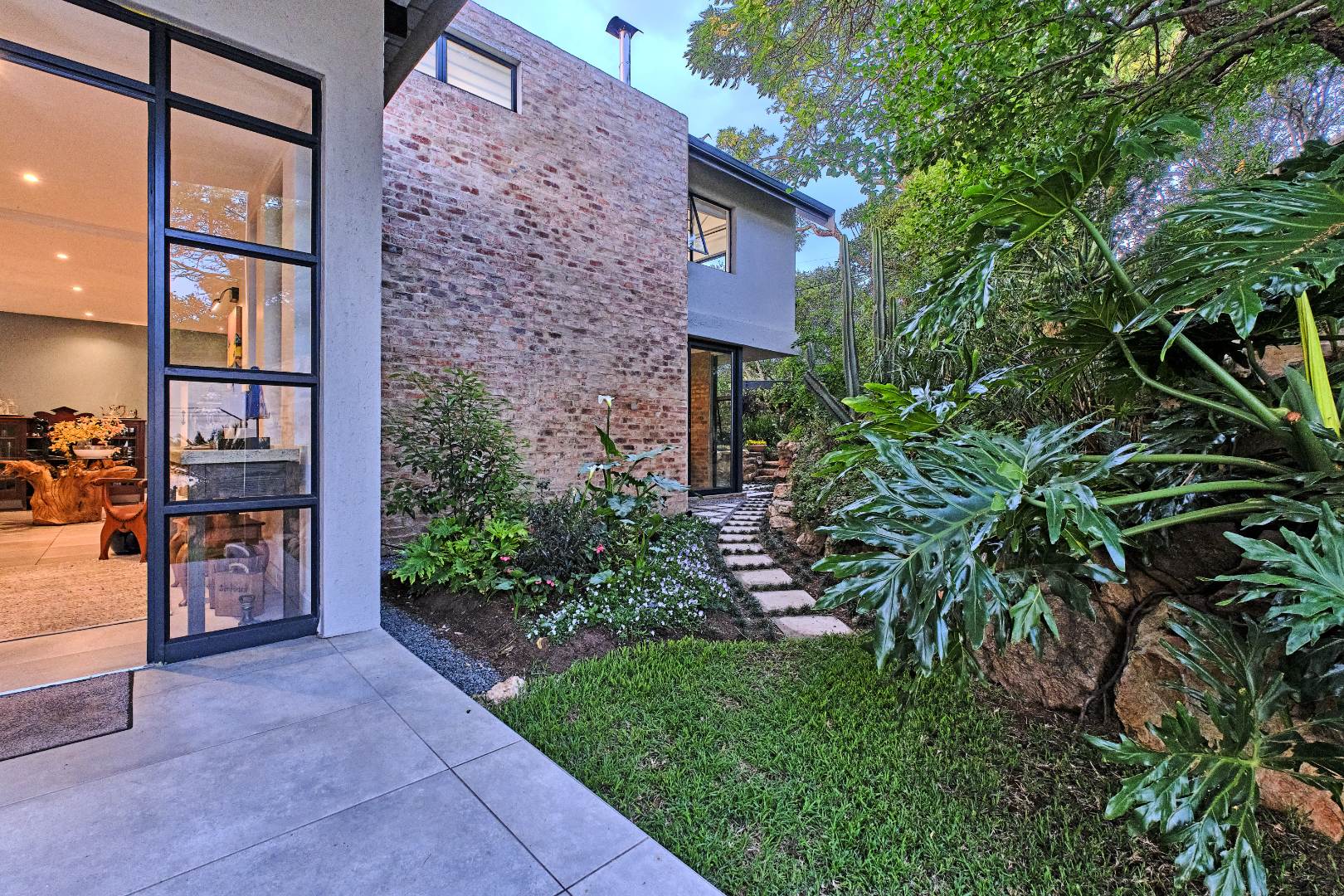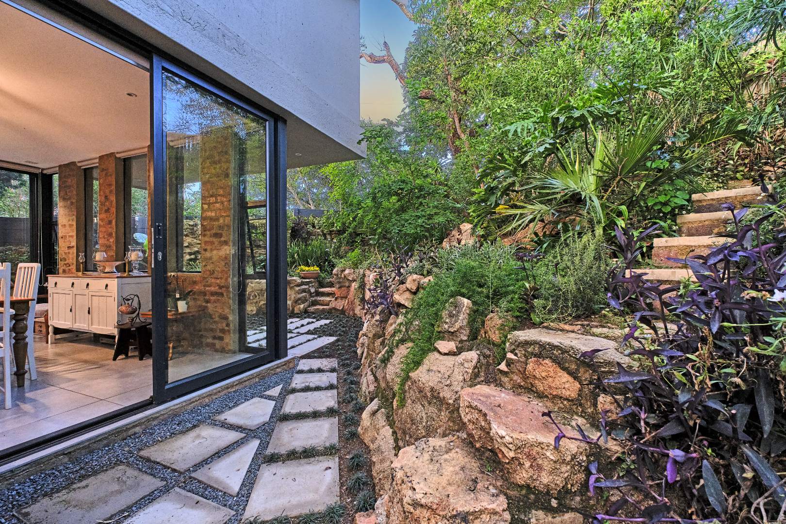 Stacking glass doors open out to a serene, storybook garden where lush greenery and tranquil surroundings create the perfect outdoor retreat.