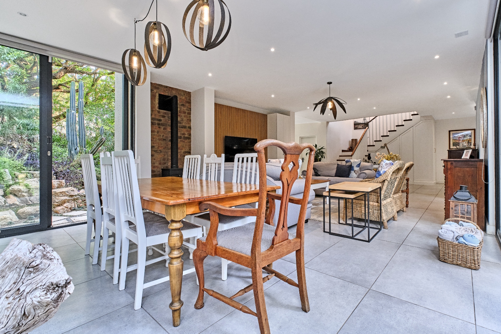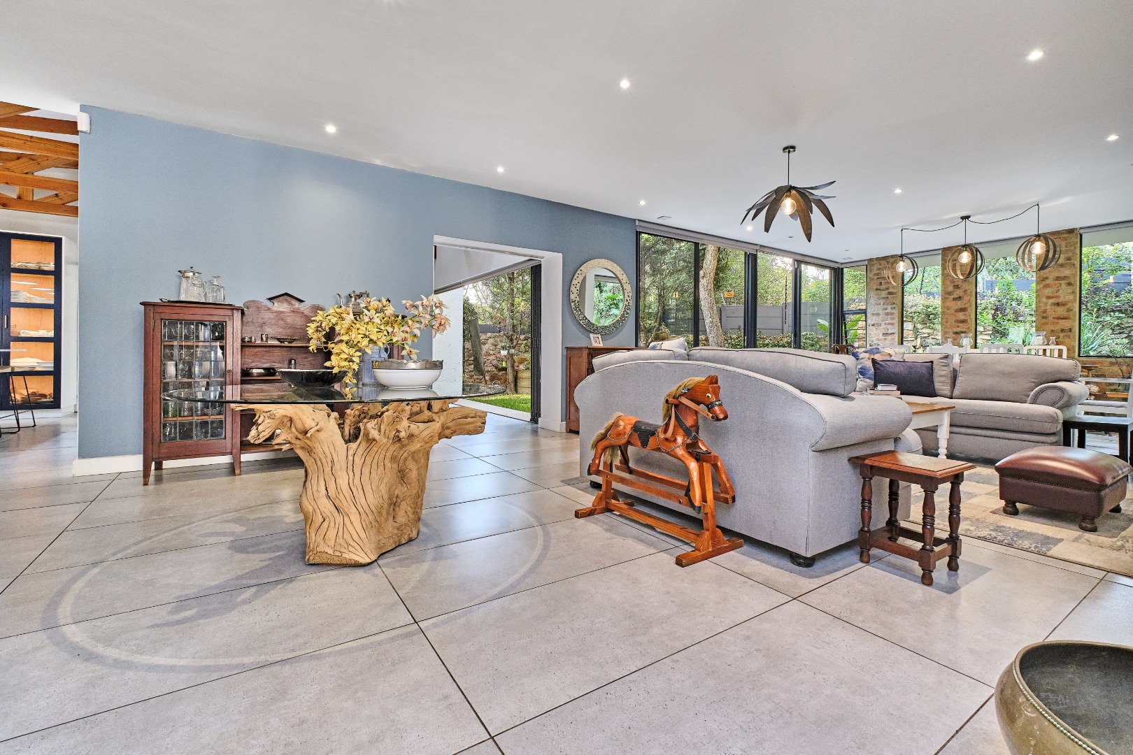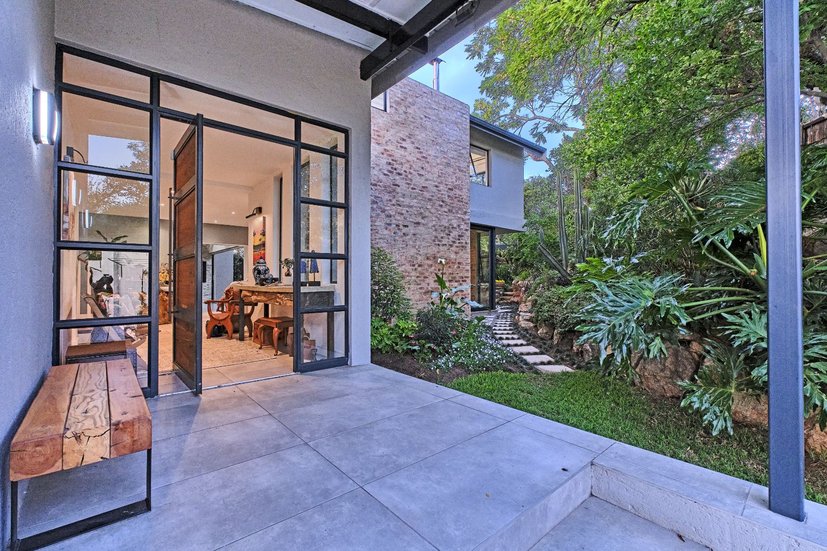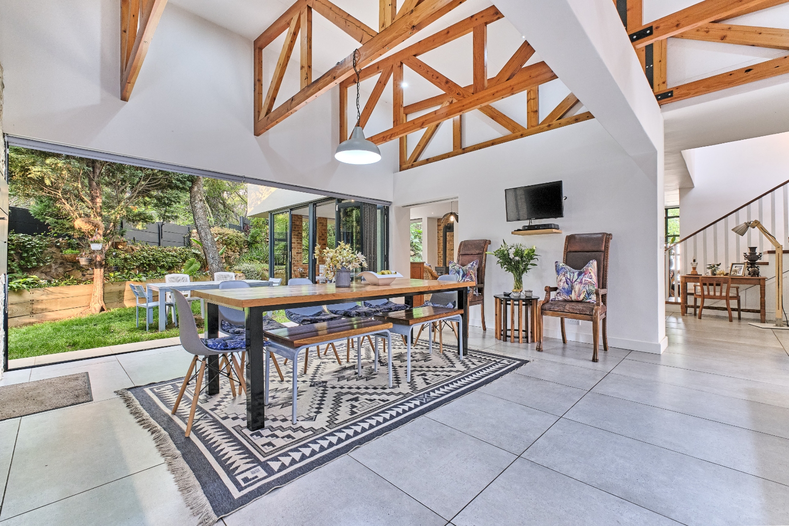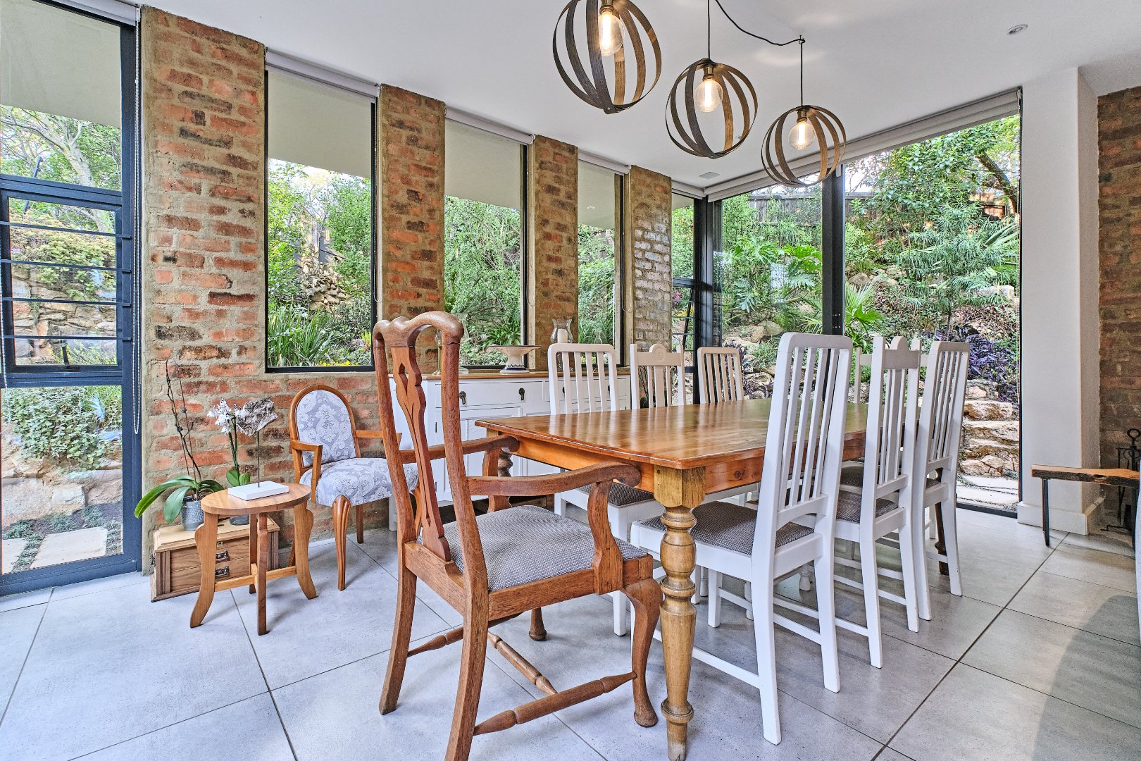 Stacking glass doors open out to a serene, storybook garden where lush greenery and tranquil surroundings create the perfect outdoor retreat.