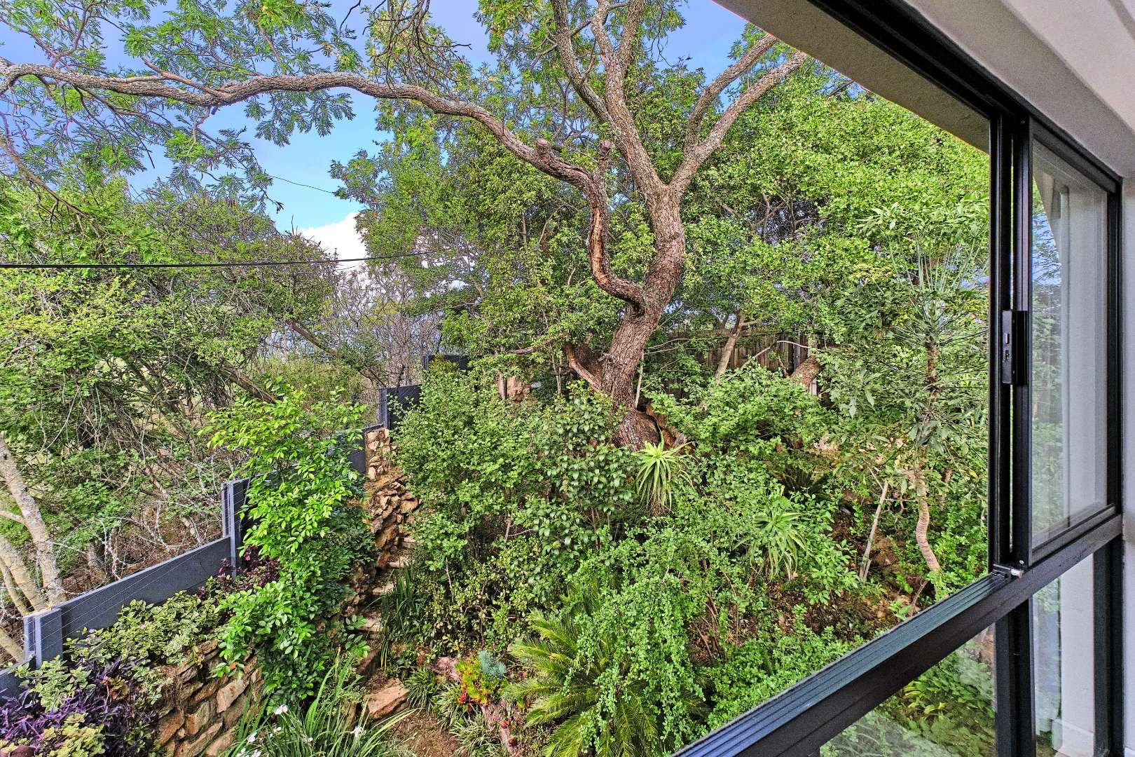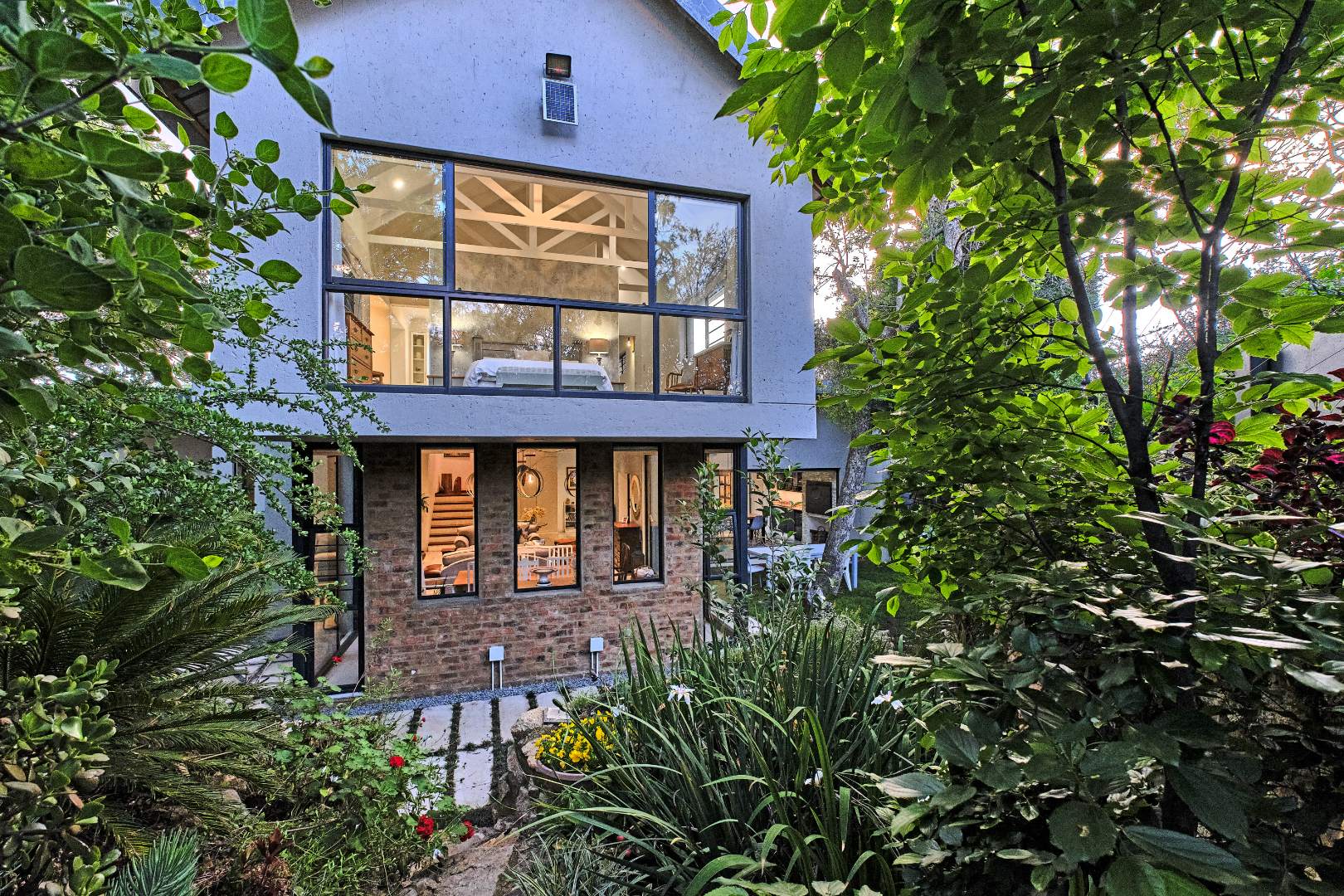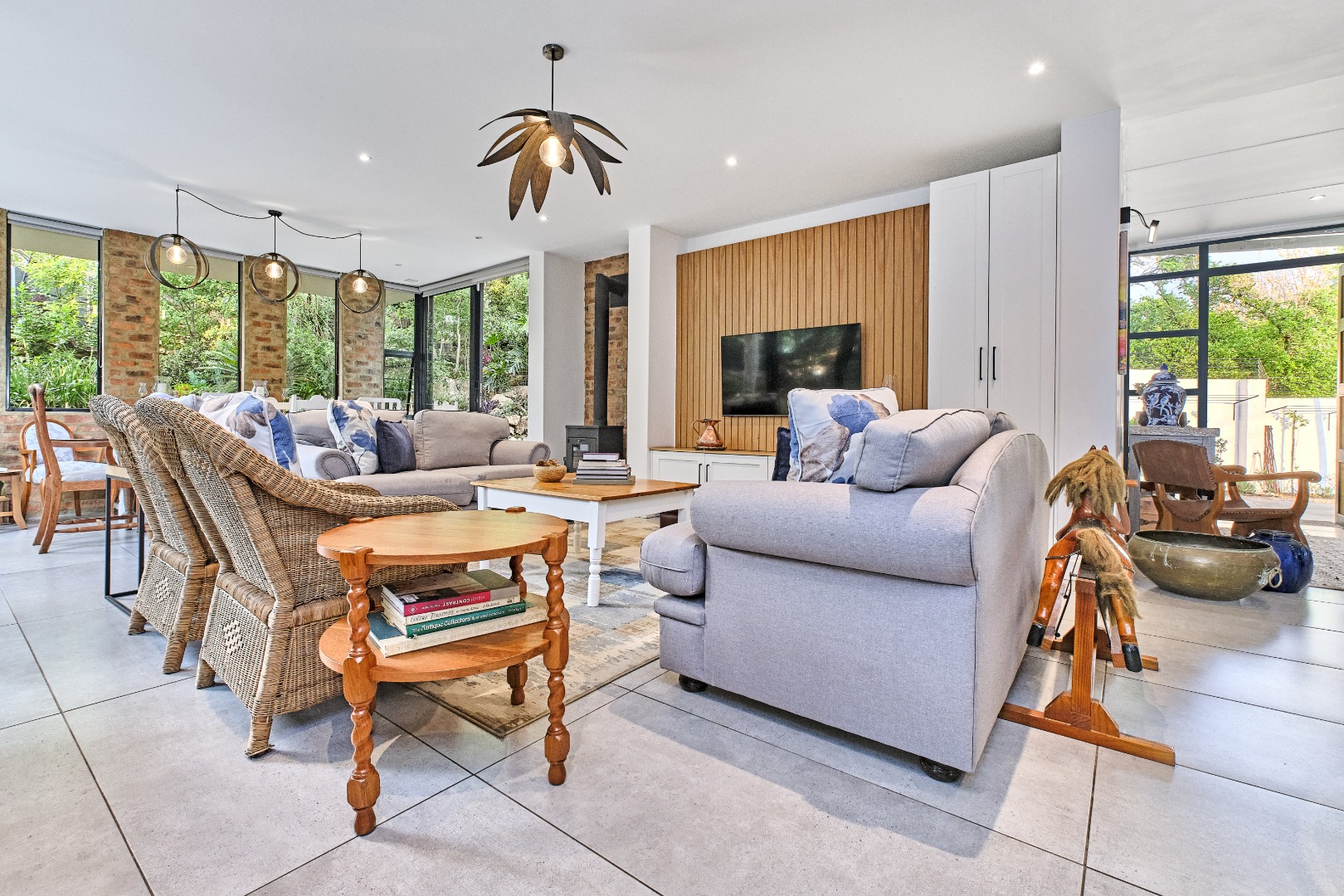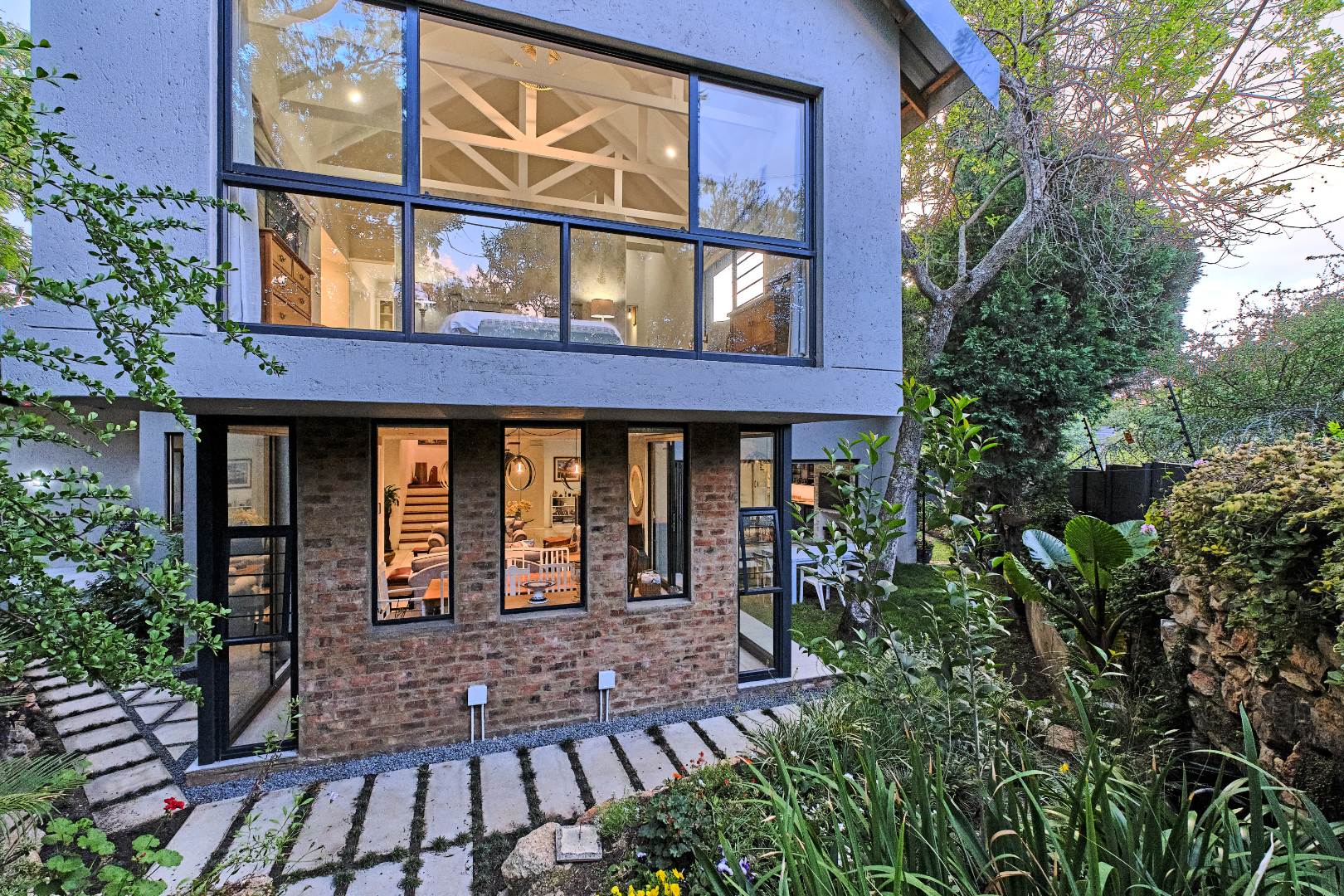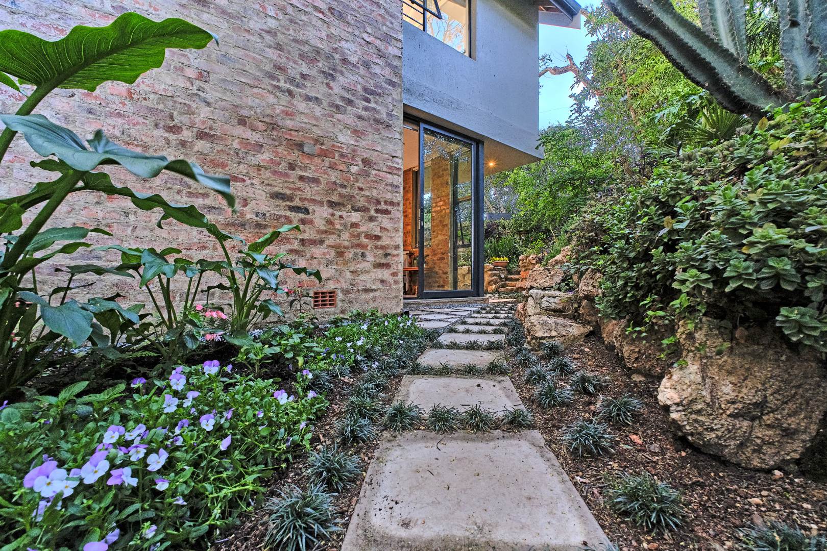 Stacking glass doors open out to a serene, storybook garden where lush greenery and tranquil surroundings create the perfect outdoor retreat.