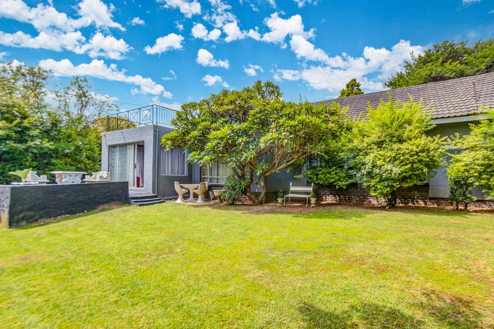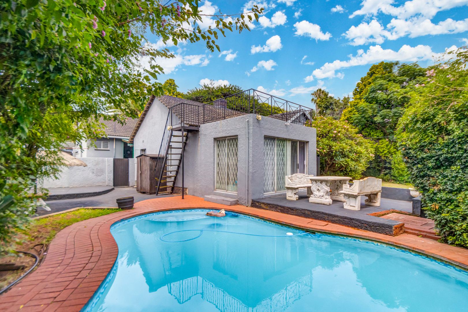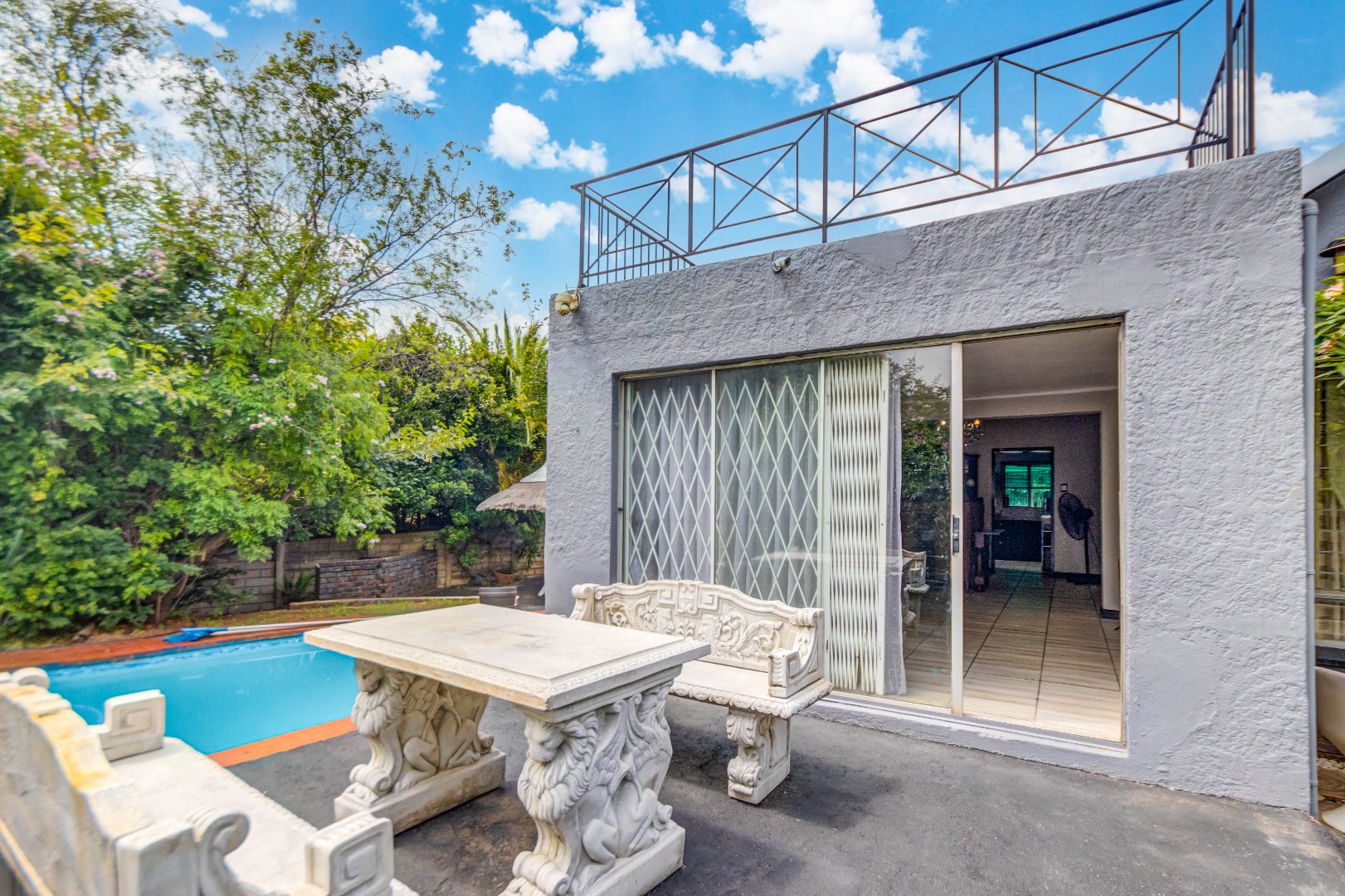 The property also offers a self-contained flatlet with two bedrooms, a bathroom, and open-plan kitchen, dining, and lounge area with its own patio—perfect for guests or rental potential. Staff quarters with a full bathroom or optional laundry area add further flexibility.