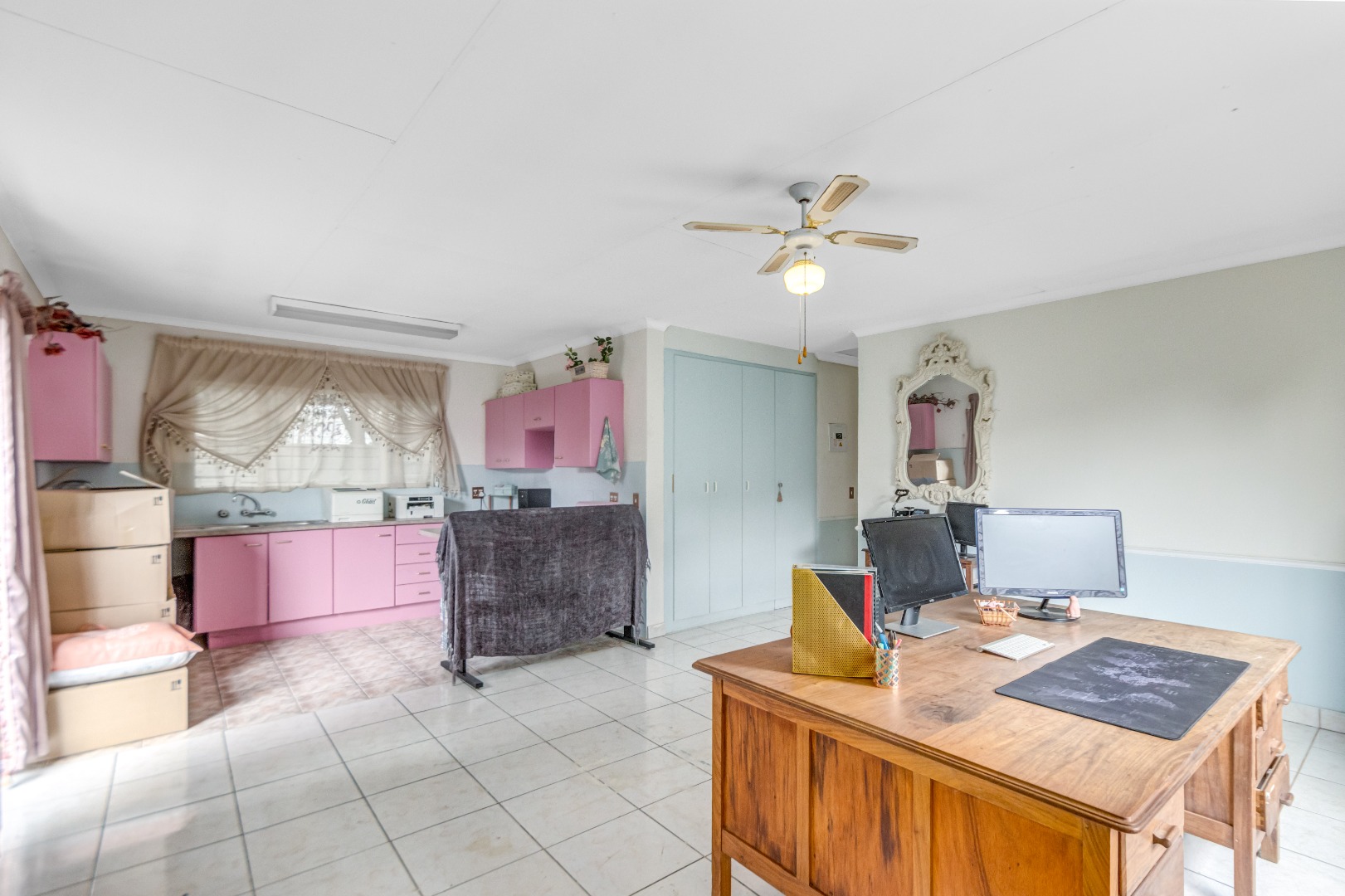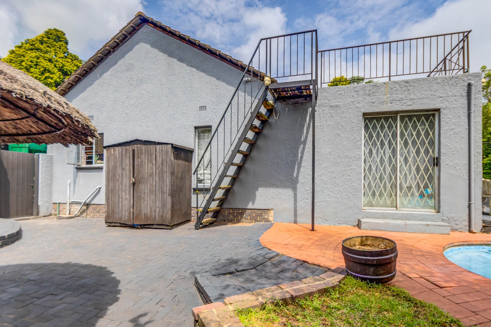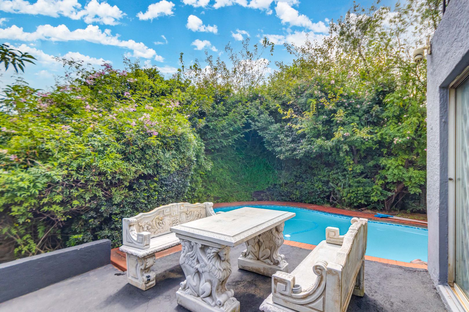 The property also offers a self-contained flatlet with two bedrooms, a bathroom, and open-plan kitchen, dining, and lounge area with its own patio—perfect for guests or rental potential. Staff quarters with a full bathroom or optional laundry area add further flexibility.