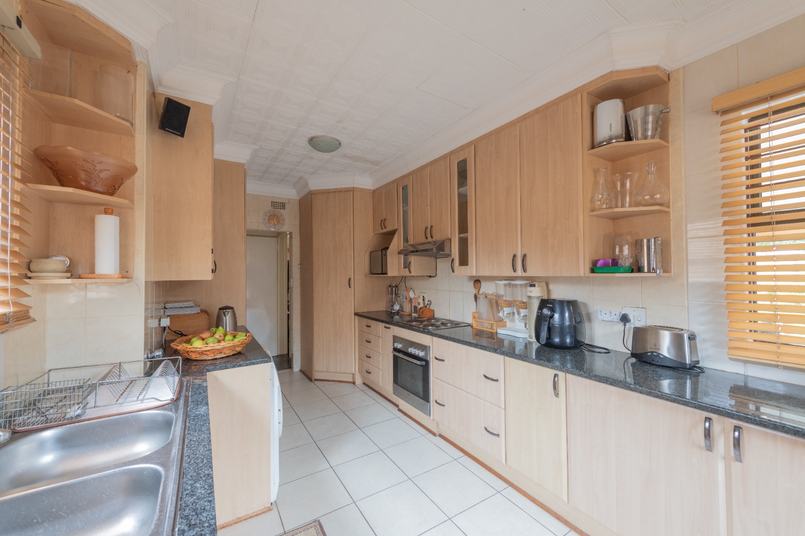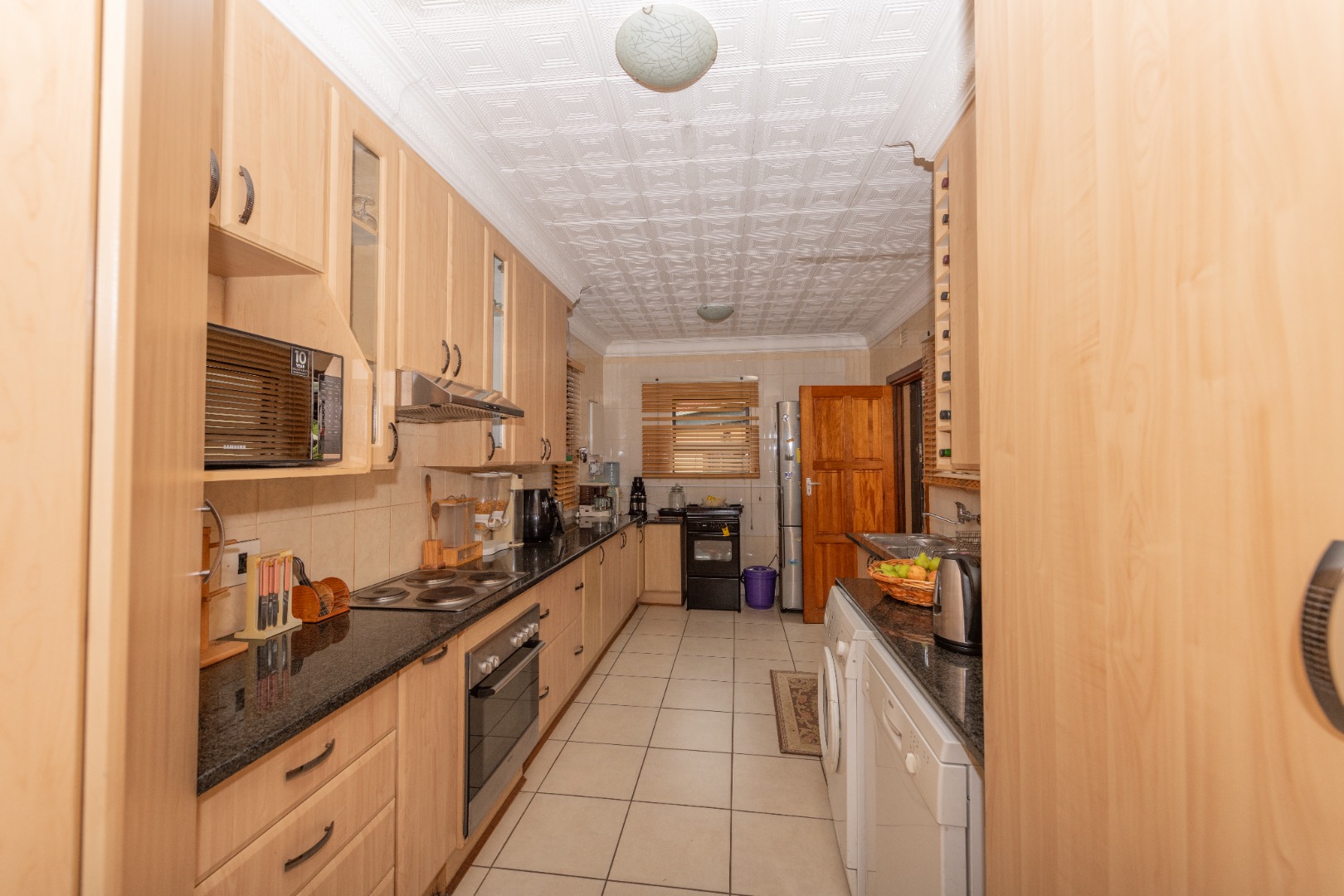 The chef’s kitchen is a dream, with built-in cupboards extending to the ceiling, providing exceptional storage space for all your culinary needs.