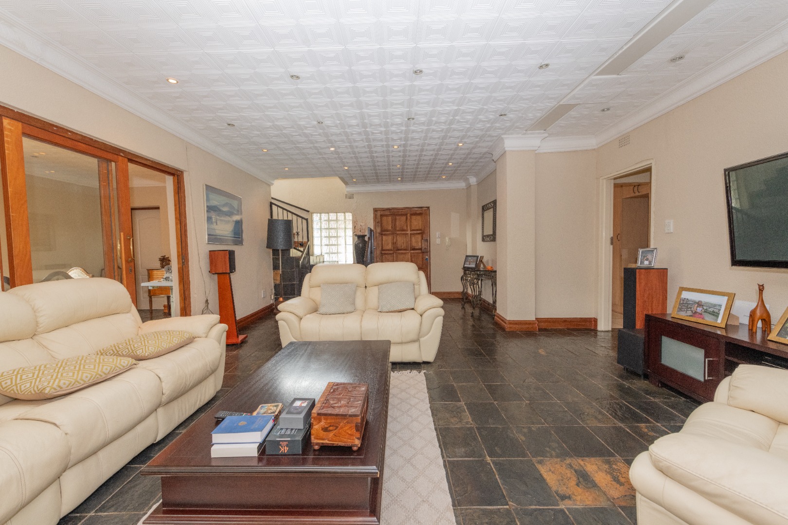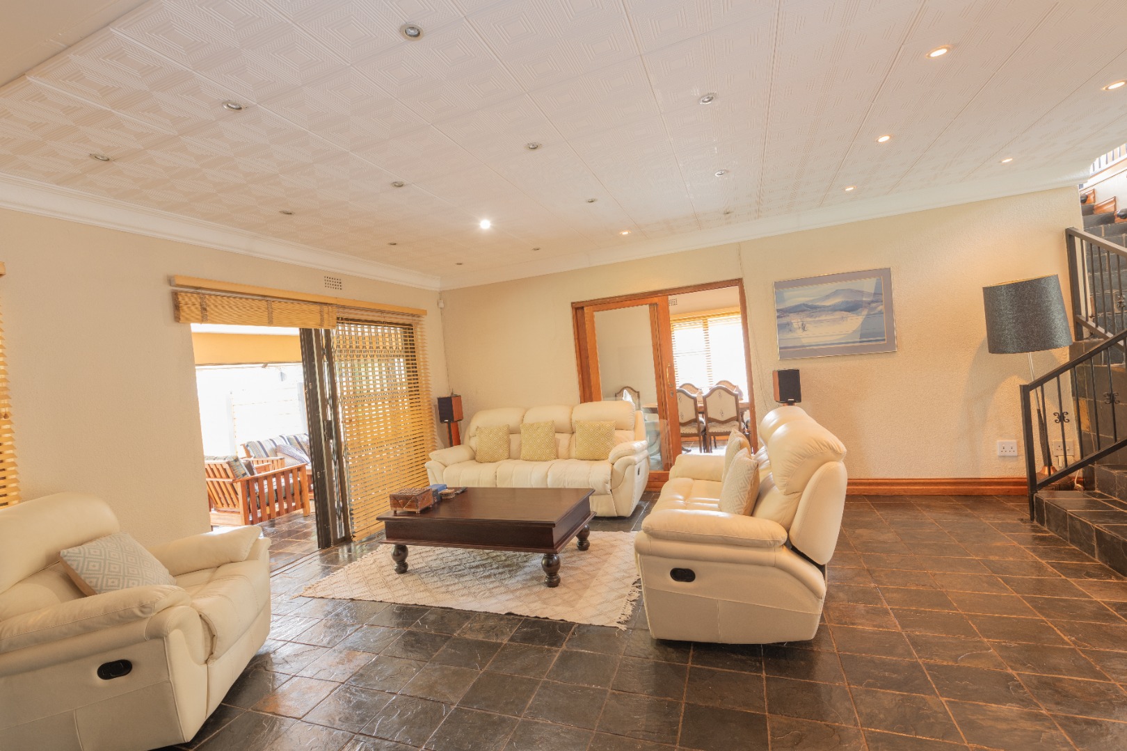 The grand entrance welcomes you with a large side door, leading into the open, stone-tiled living areas that flow effortlessly into the expansive lounge.