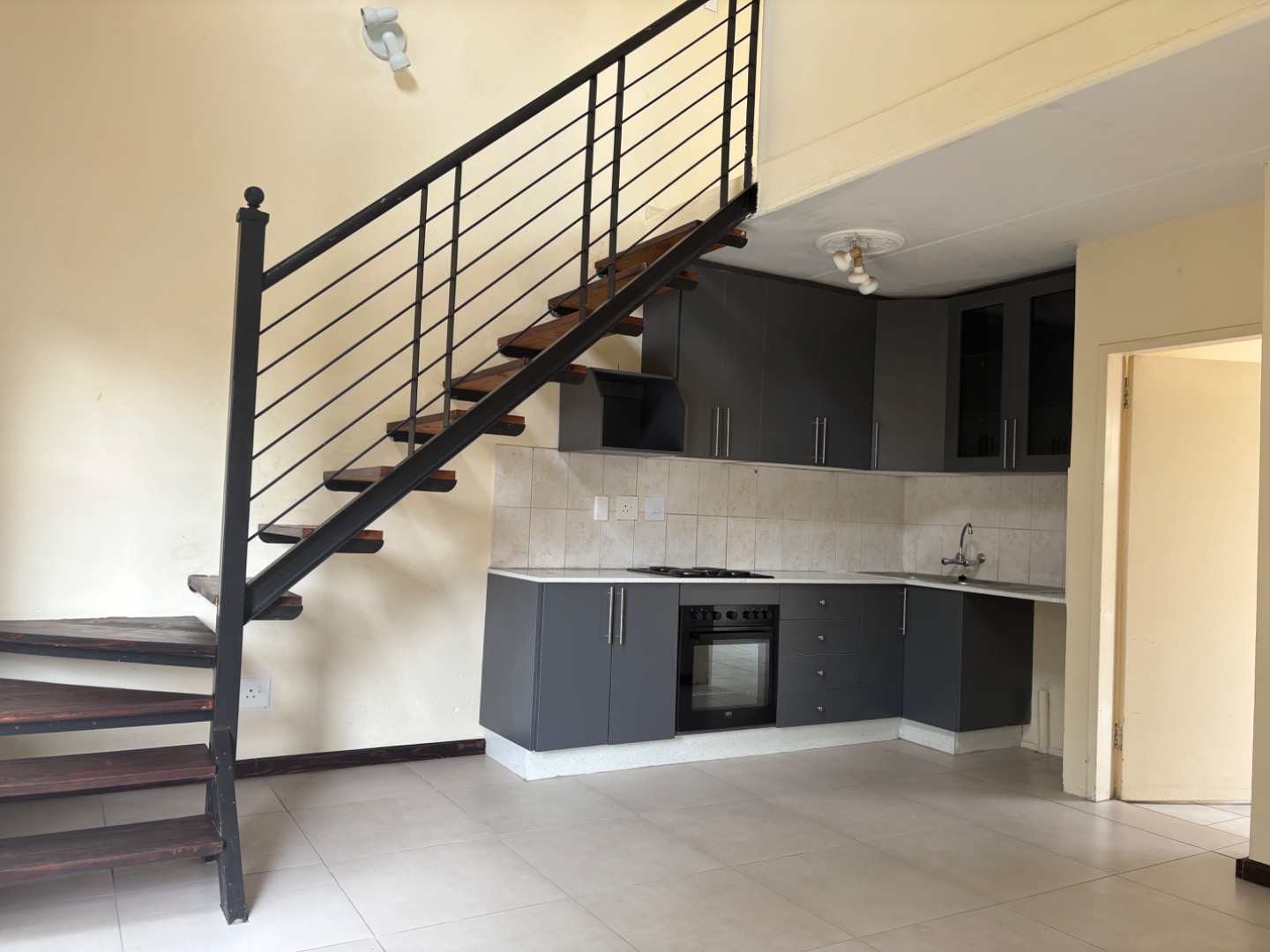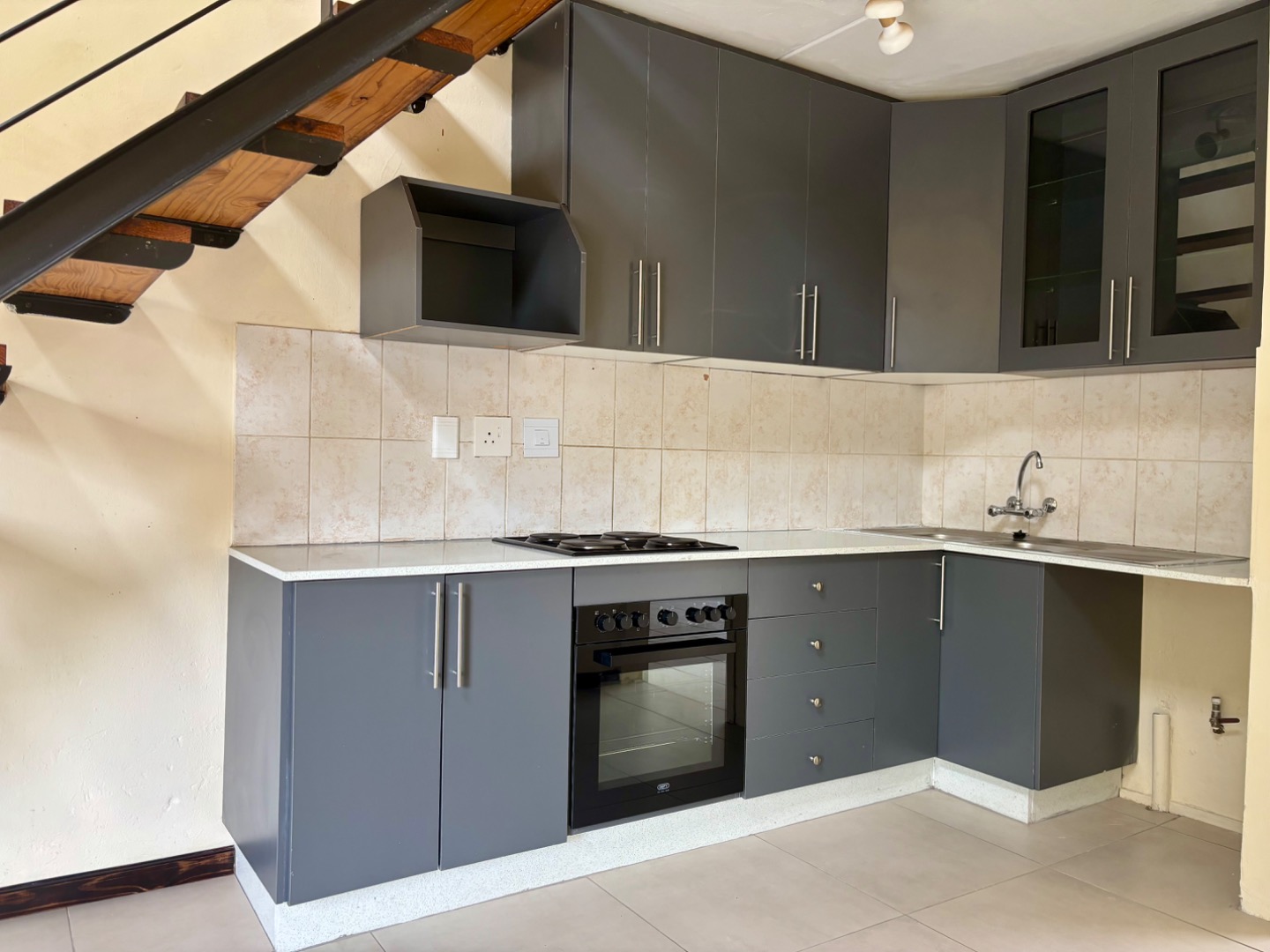 The contemporary kitchen is a focal point, equipped with stylish dark grey cabinetry, a built-in oven and hob, and a practical tiled backsplash. A striking open-tread staircase with black metal and wood accents adds a touch of sophistication, seamlessly connecting the living space to the upper level.