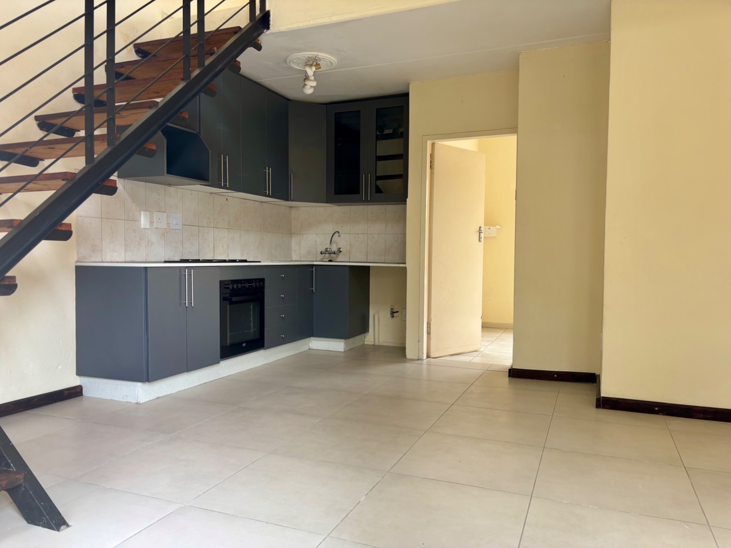 The contemporary kitchen is a focal point, equipped with stylish dark grey cabinetry, a built-in oven and hob, and a practical tiled backsplash. A striking open-tread staircase with black metal and wood accents adds a touch of sophistication, seamlessly connecting the living space to the upper level.